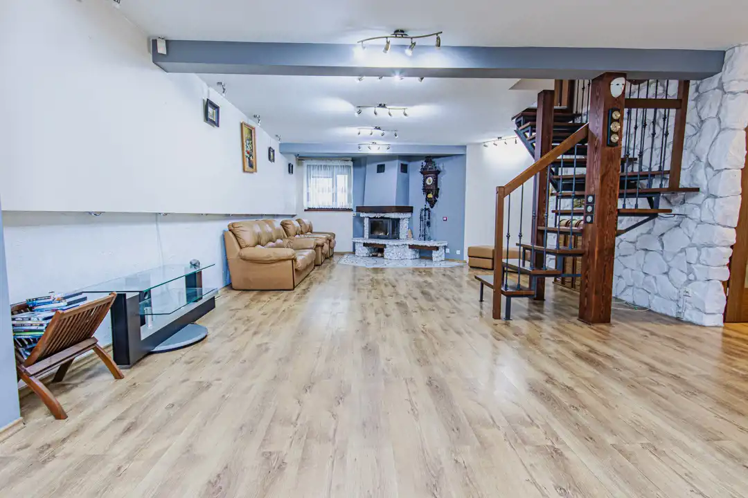 przestronny salon z kominkiem i widokiem na podwórko oraz tereny zielone