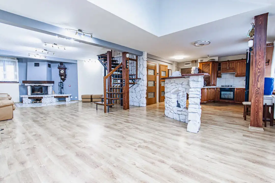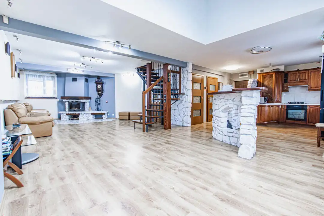 kuchnia oraz kominek wykończone naturalnym kamieniem