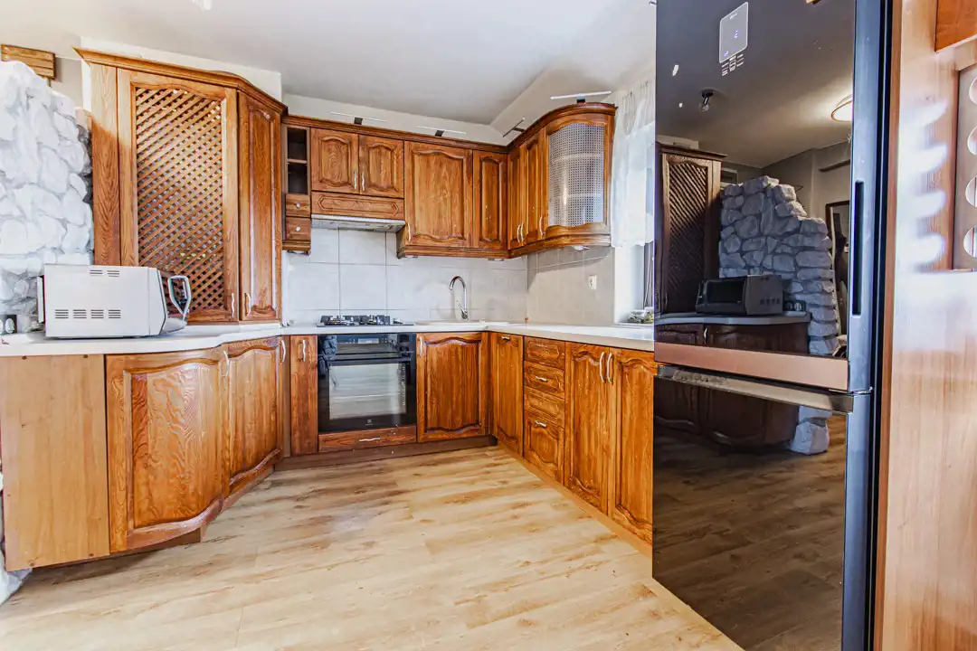 duża, jasna kuchnia z drewnianą zabudową oraz wykończeniem z naturalnego kamienia