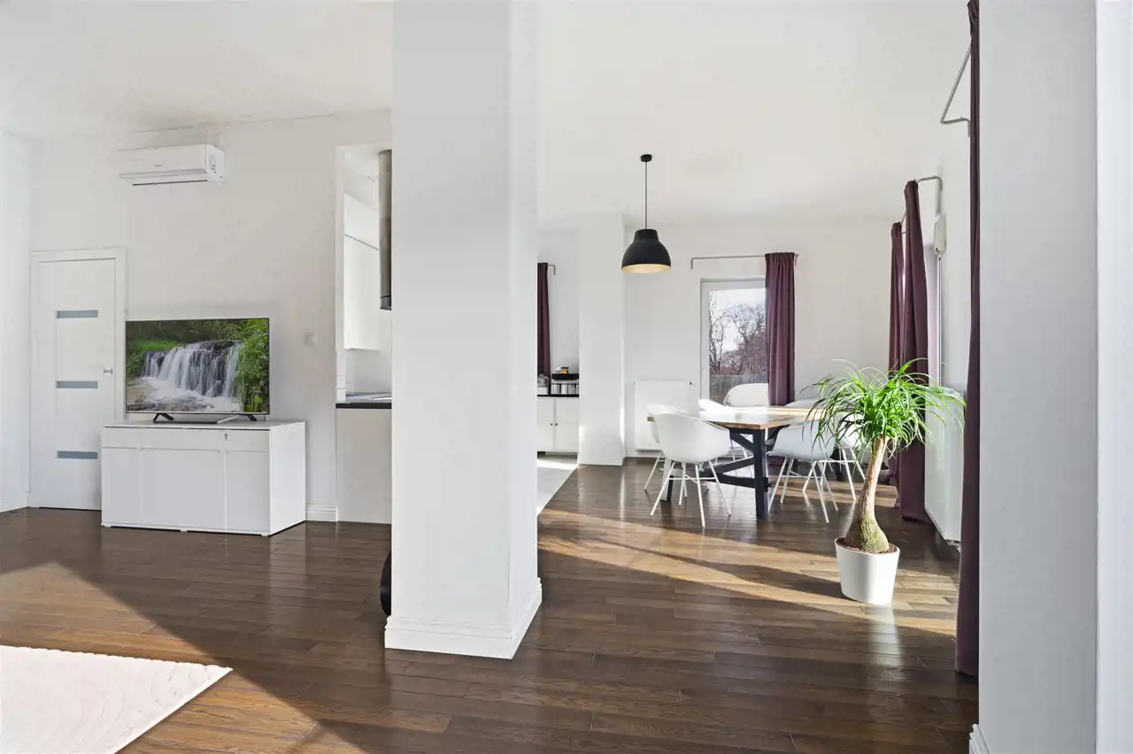 Mieszkanie składa się z salonu na planie otwartym z jadalnią i kuchnią,osobnej sypialni oraz łazienki z WC.
