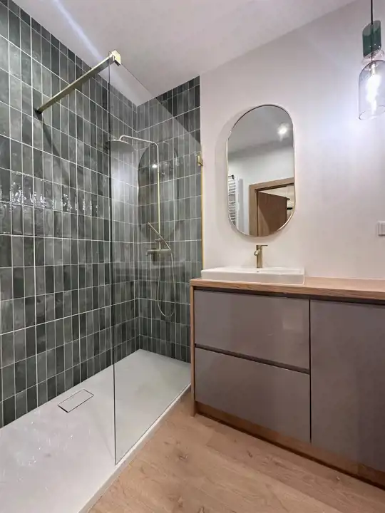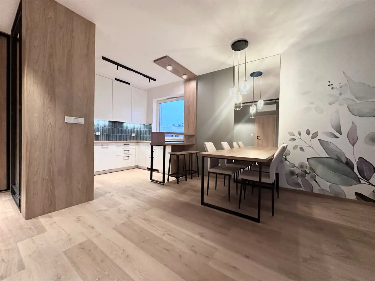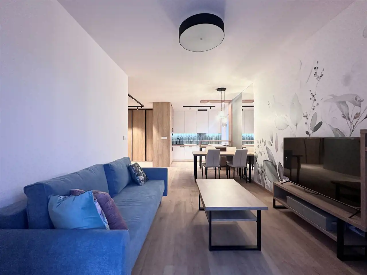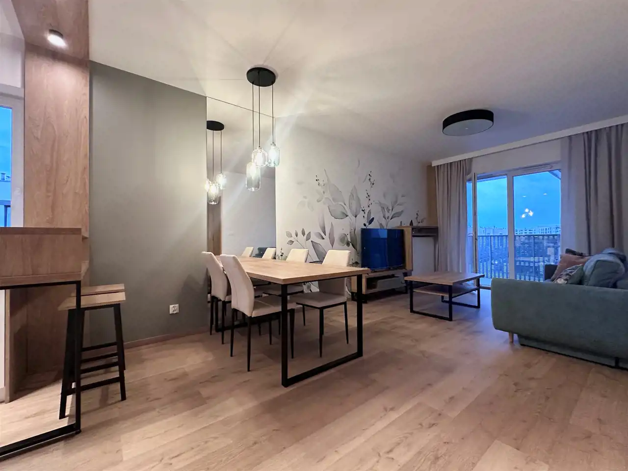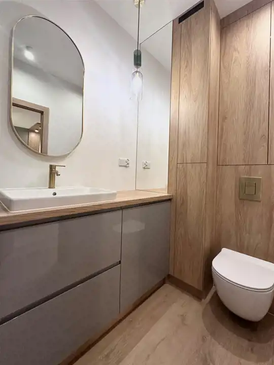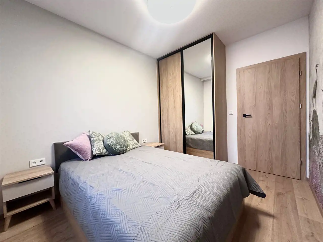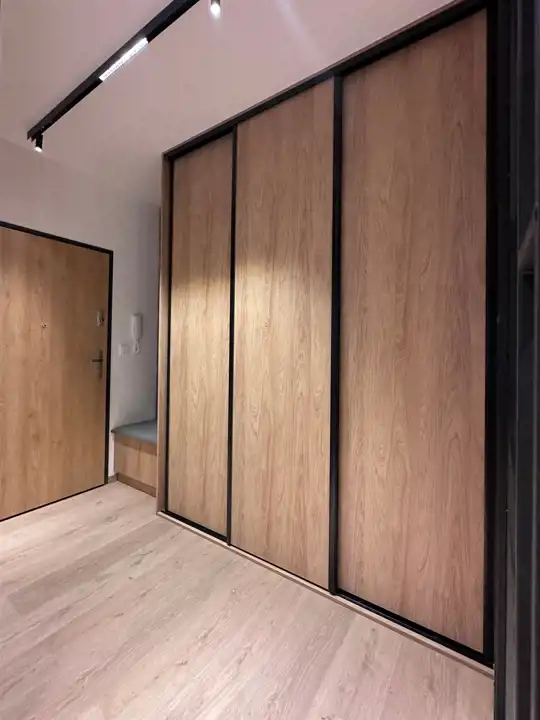 Powierzchnia 50 m2. składa się z salonu z aneksem kuchennym, sypialni, łazienki z toaleta oraz przedpokoju. Całość jest w pełni umeblowanie i wyposażone w wysokim standardzie, klimatyzacja. Mieszkanie bardzo funkcjonalnie urządzone. W salonie znajduje się sofa, szafka pod telewizor, TV, stół i 4 krzesła. Kuchnia wykonana na wymiar wyposażona we wszystkie potrzebne sprzęty, piekarnik, płytę indukcyjna, zmywarkę, . W sypialni duże wygodne łóżko oraz duża szafa w zabudowie.W łazience kabina prysznicowa, umywalka, pralka. w przedpokoju znajduje się szafa typu Komandor na ubrania wierzchnie oraz szafka na buty .