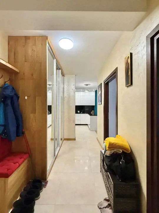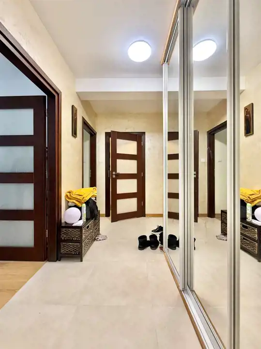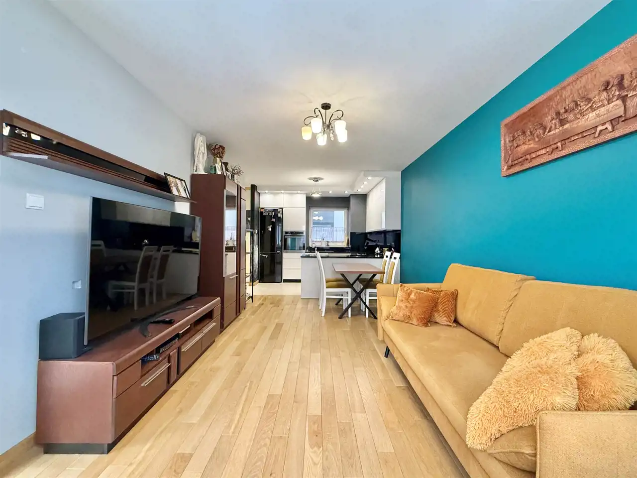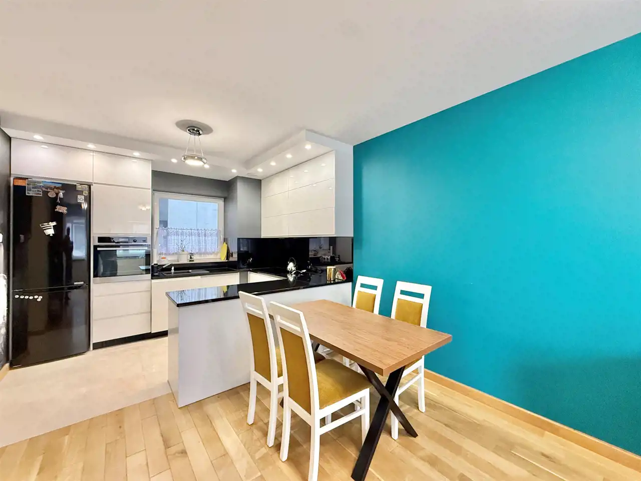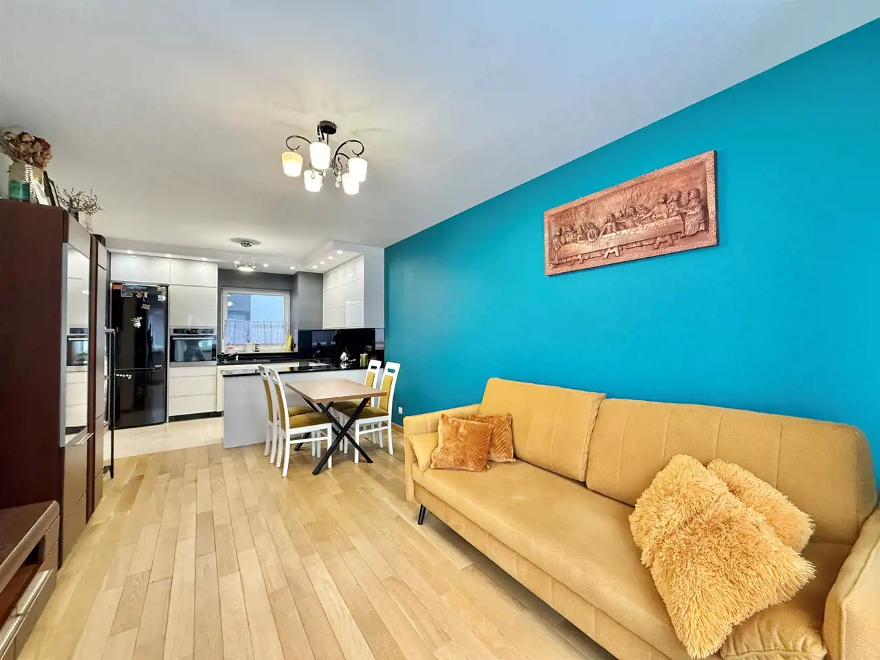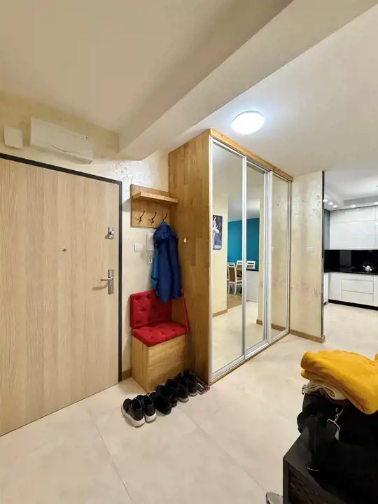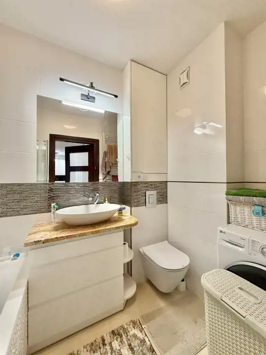 Piętro 2, powierzchnia 56 metrów kwadratowych składa się z salonu z aneksem kuchennym, dwóch sypialni, łazienki z WC oraz przedpokoju. Mieszkanie posiada balkon. Całe mieszkanie jest w pełni umeblowane i wyposażone w dobrym standardzie, bardzo funkcjonalnie urządzone. W salonie znajduje się rozkładana sofa, stół z krzesłami, meble pod RTV + telewizor. W sypialni znajduje się duże łóżko z materacem oraz szafa. Druga duża i pojemna szafa w przedpokoju. Druga sypialnia jest pusta, do umeblowania we własnym zakresie. Aneks kuchenny wyposażony w zmywarkę, piekarnik, płytę indukcyjną, lodówko-zamrażarkę.