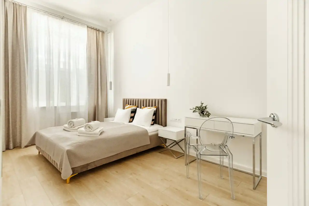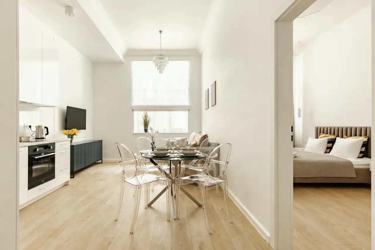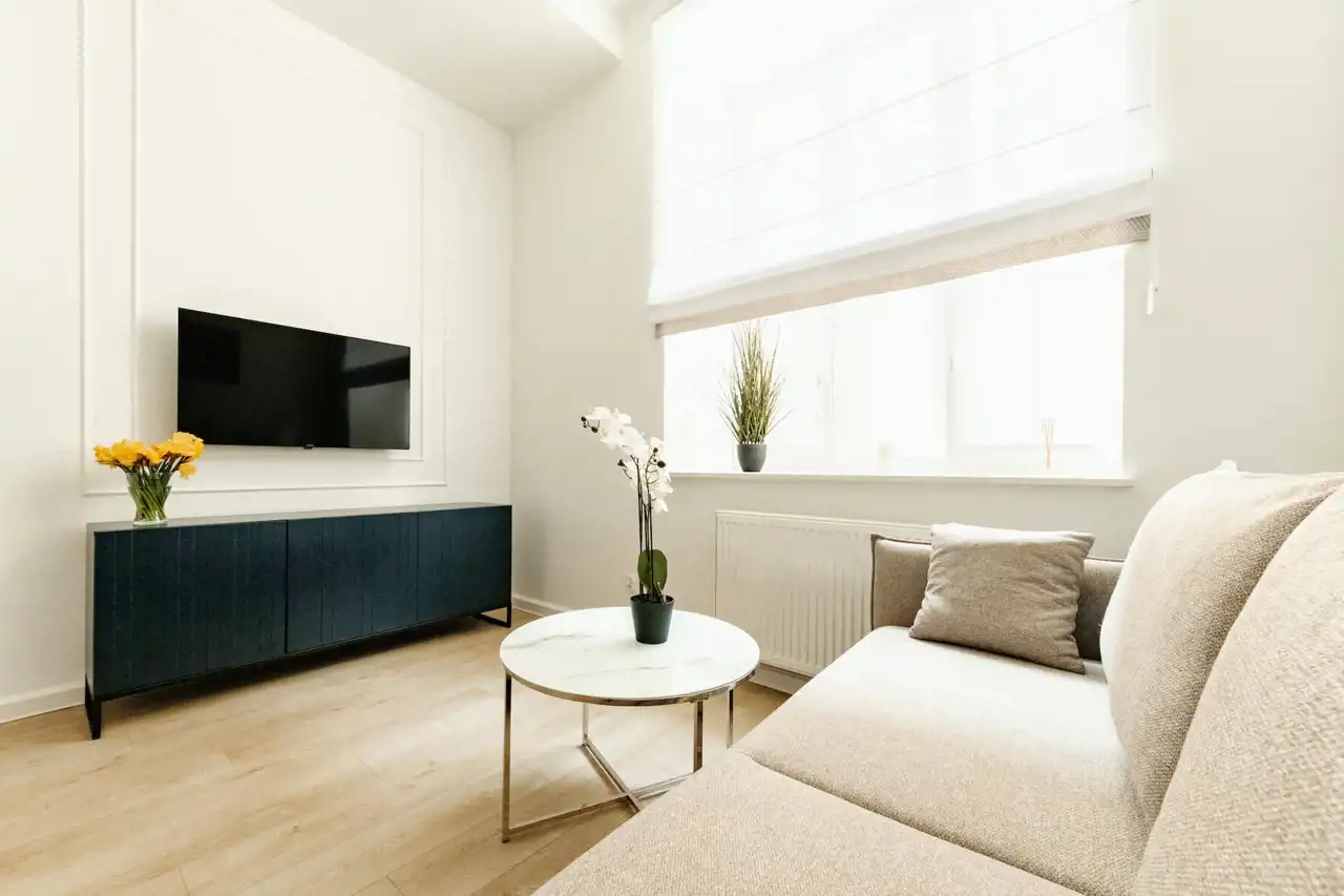 Na powierzchni 43 mkw, znajduje się: - komfortowo urządzony salon z nowoczesnym aneksem kuchennym oraz jadalnią , sypialnia z wygodnym łóżkiem małżeńskim oraz dużą ilością szaf w zabudowie - łazienka z prysznicem i toaletą - przedpokój.