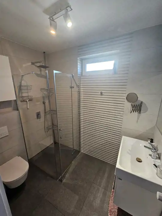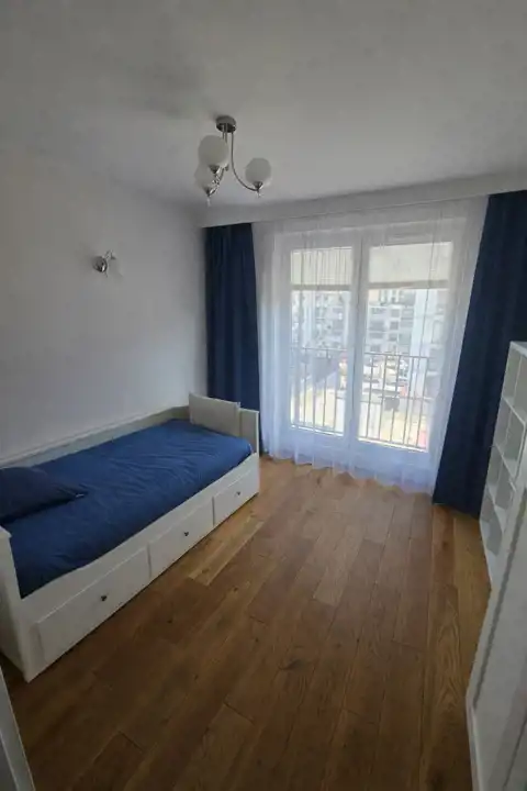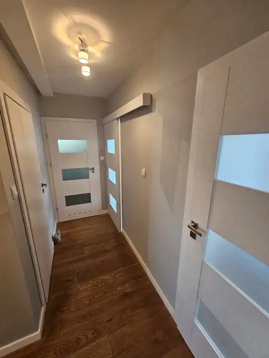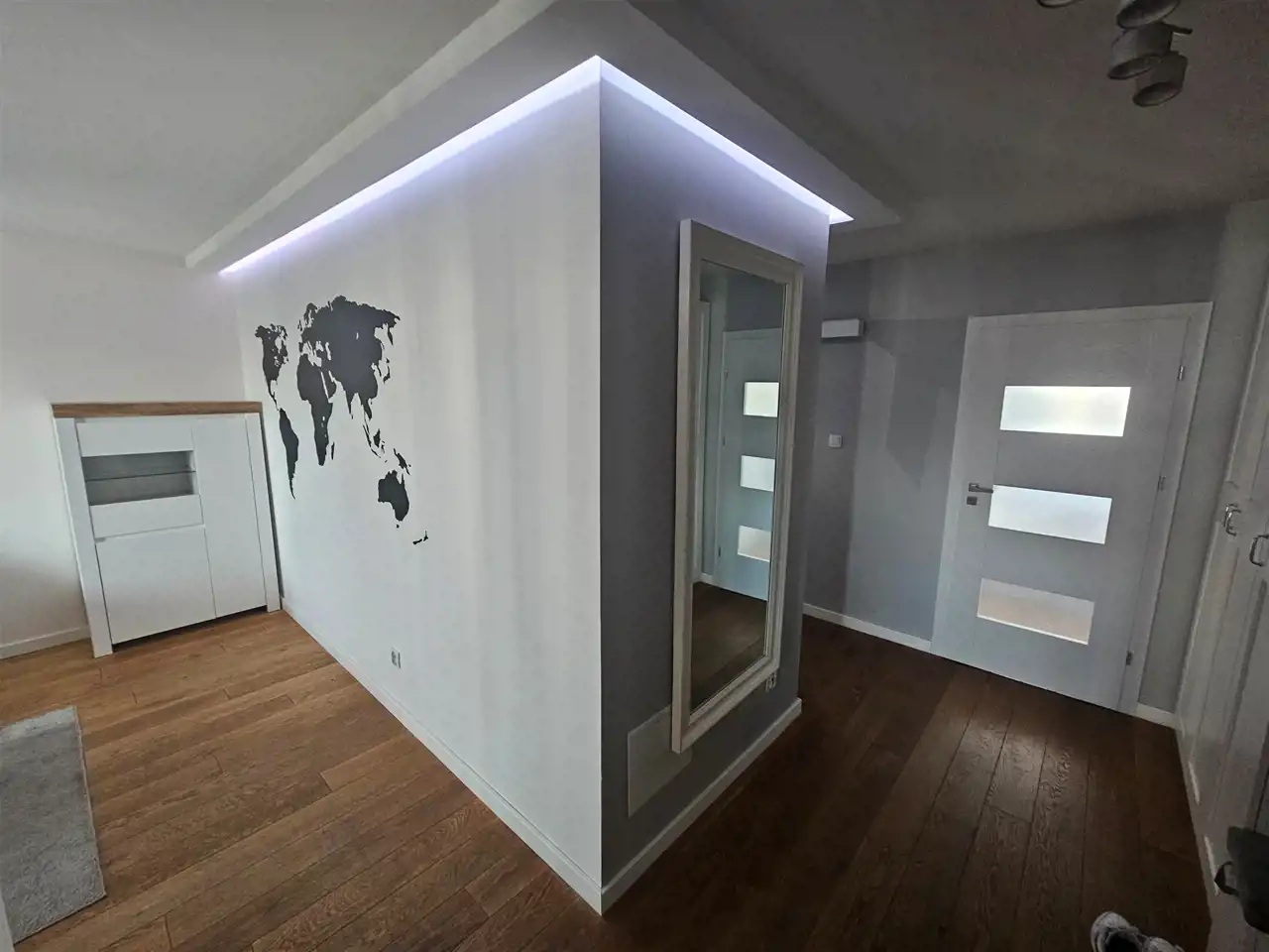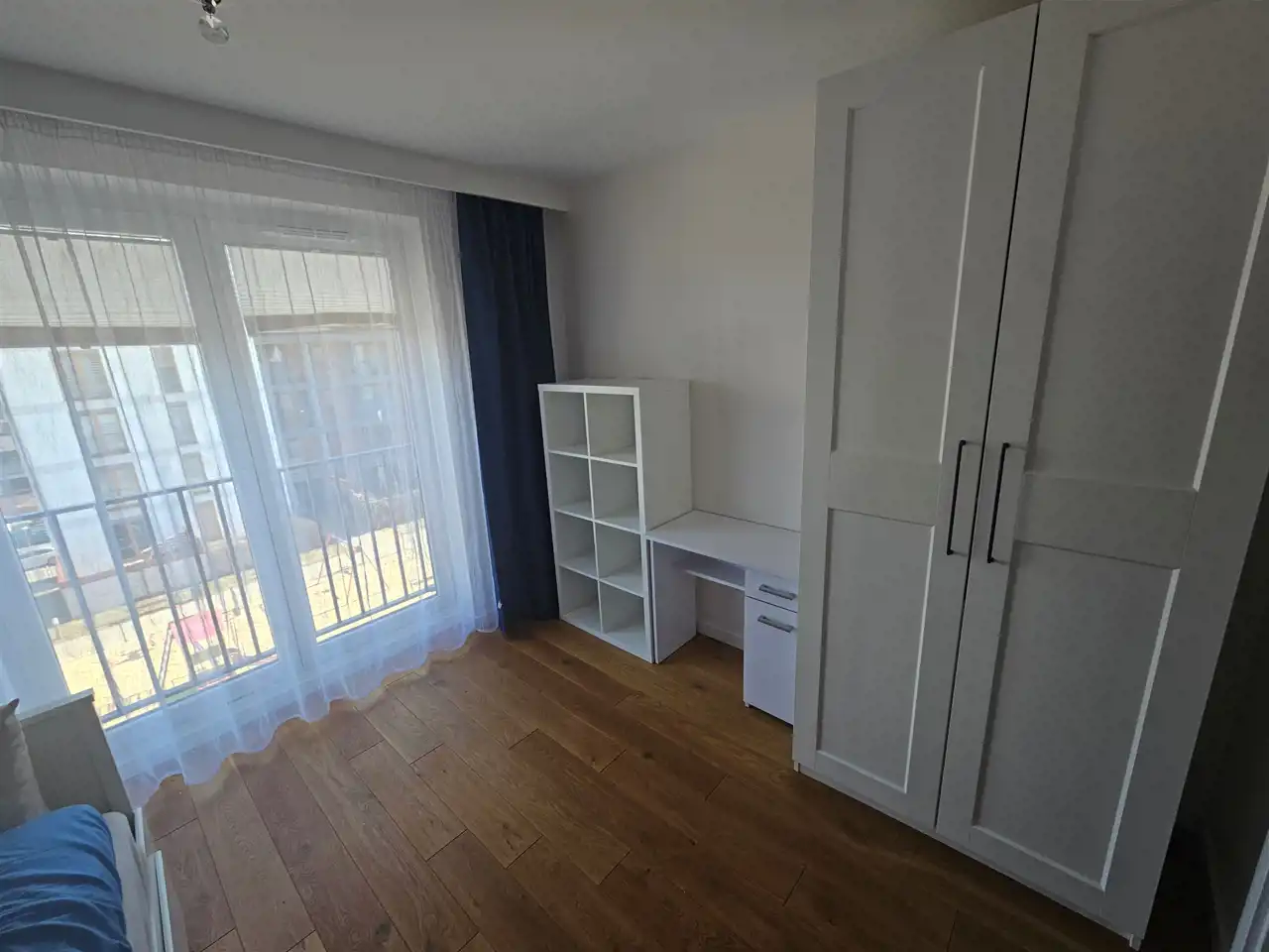W sypialni głównej znajduje się duże podwójne łóżko, pojemna szafa i komoda, natomiast drugi pokój został przygotowany z myślą o pracy lub nauce, oferując składane podwójne łóżko, regał, szafę oraz biurko. Łazienka wyposażona jest w kabinę prysznicową i WC. Przestronny salon z wyjściem na balkon posiada rozkładany narożnik, stolik, komodę oraz duży telewizor LCD zamontowany na ścianie. Kuchnia jest w pełni wyposażona w nowoczesne AGD, w tym zmywarkę, lodówko-zamrażarkę, piekarnik elektryczny, płytę indukcyjną, okap i mikrofalówkę, a także stół do codziennych posiłków. Dodatkowo mieszkanie posiada garderobę z zabudową i pralką.