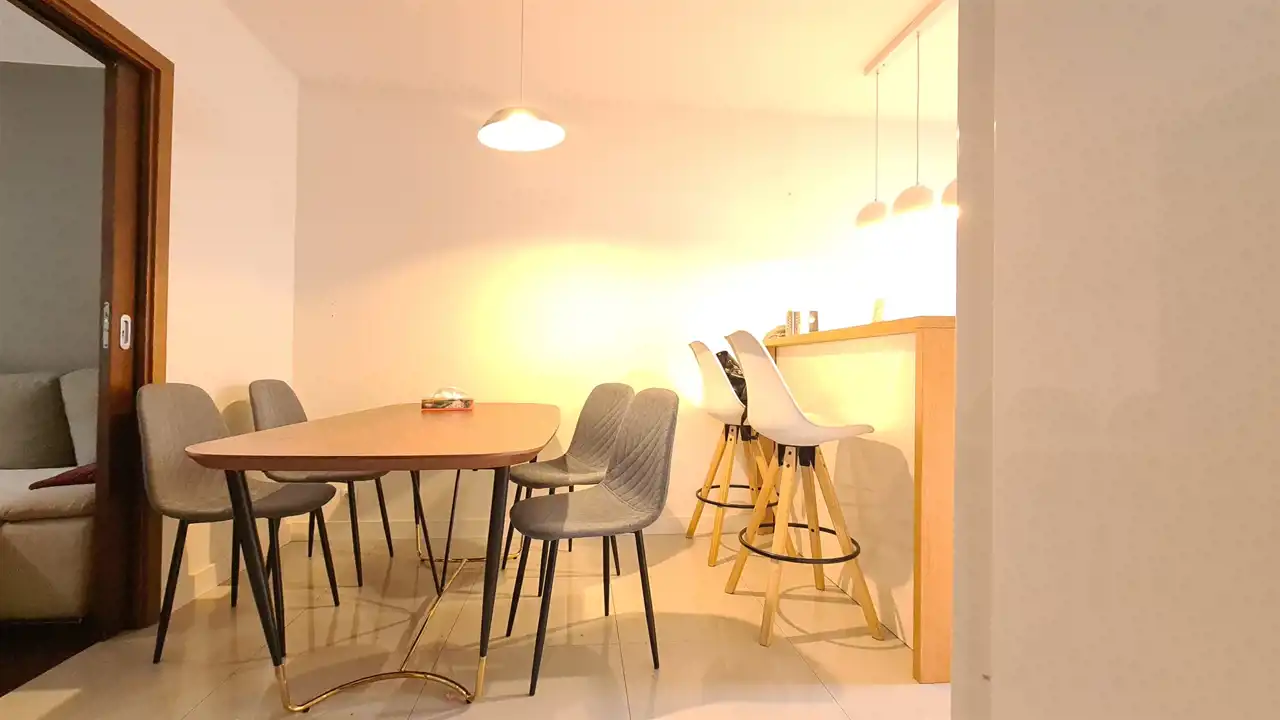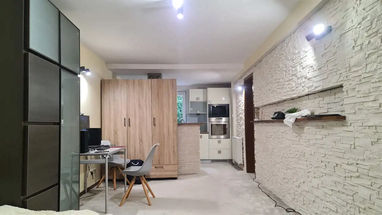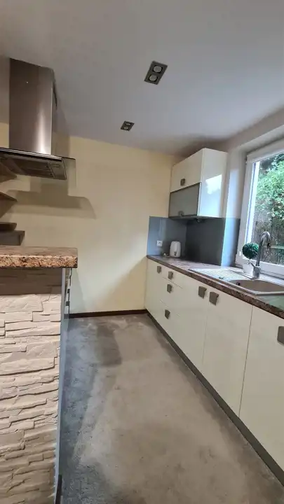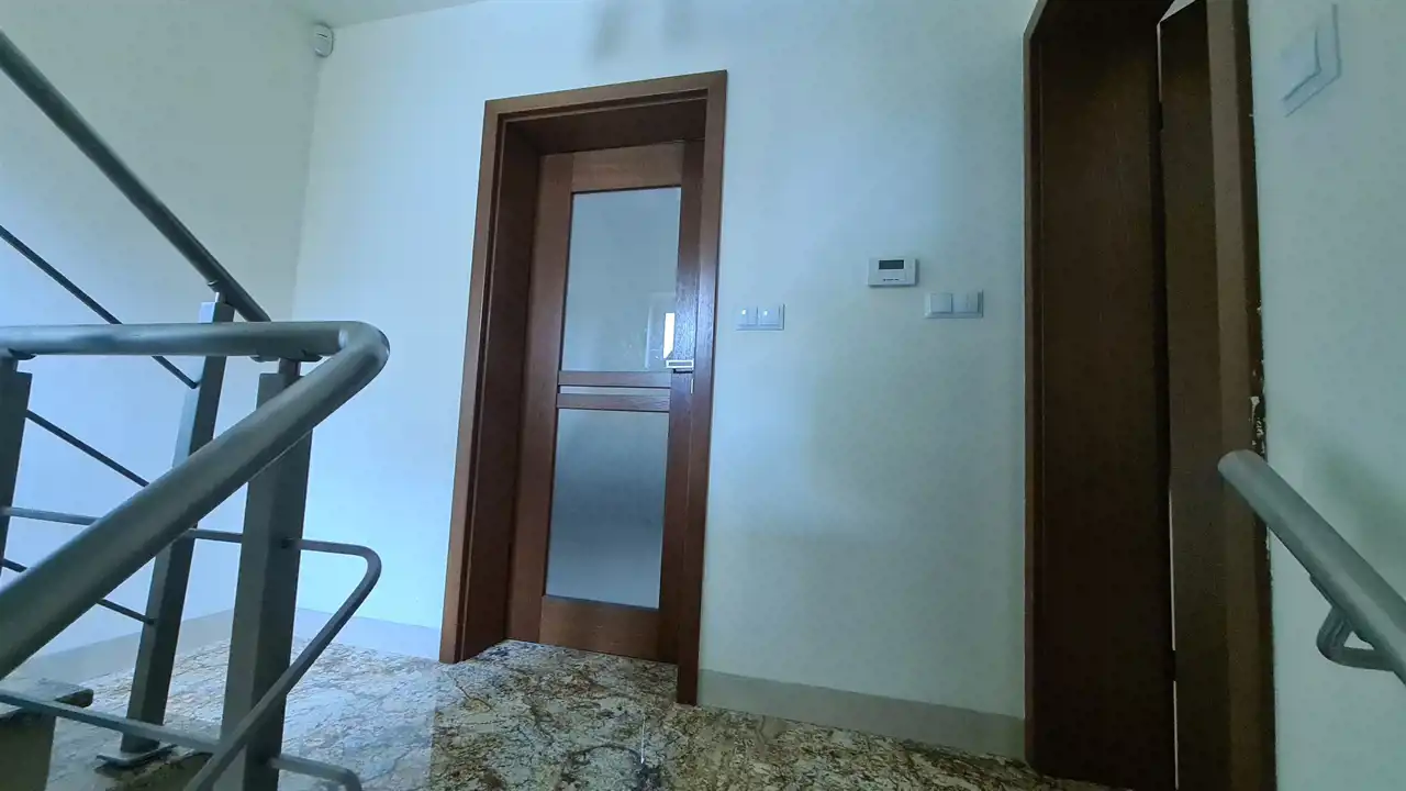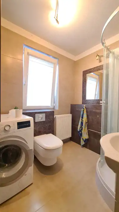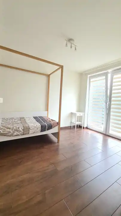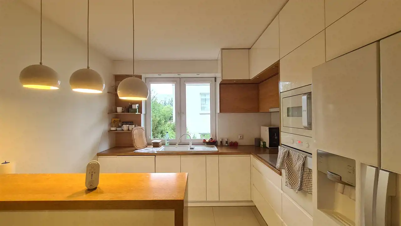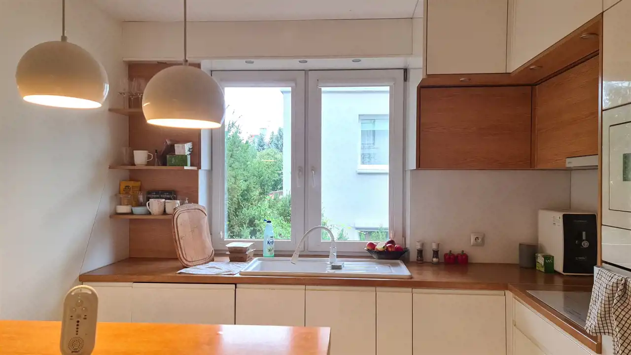 Mieszkanie jest umeblowane a kuchnia kompletnie wyposażona - m.in. w 2-drzwiową lodówkę, mikrofalówkę itp. Południowe, duże francuskie okna na piętrze pięknie doświetlają przestronne wnętrza.