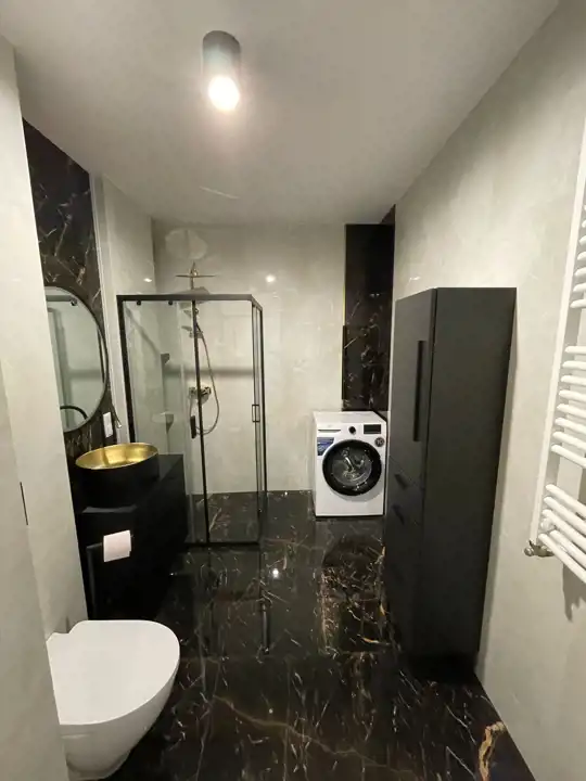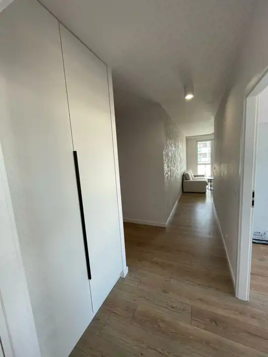 Powierzchnia 64 m2 składa się z salonu z aneksem kuchennym, 2 sypialni, łazienki z WC oraz przedpokoju. Mieszkanie posiada dwa balkonu. W sypialni oraz przedpokoju duże szafy w zabudowie. Aneks kuchenny wyposażony w zmywarkę, piekarnik, płytę indukcyjną, lodówko-zamrażarkę. W łazience duża kabina prysznicowa typu walk-in, umywalka, pralka. Ogrzewanie oraz ciepła woda z sieci miejskiej zaliczkowane w w czynszu.