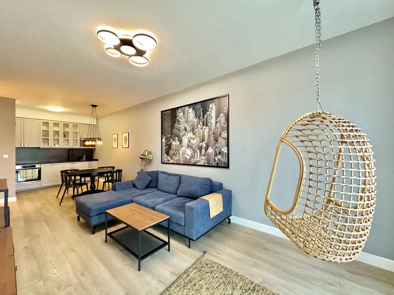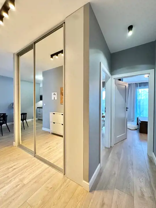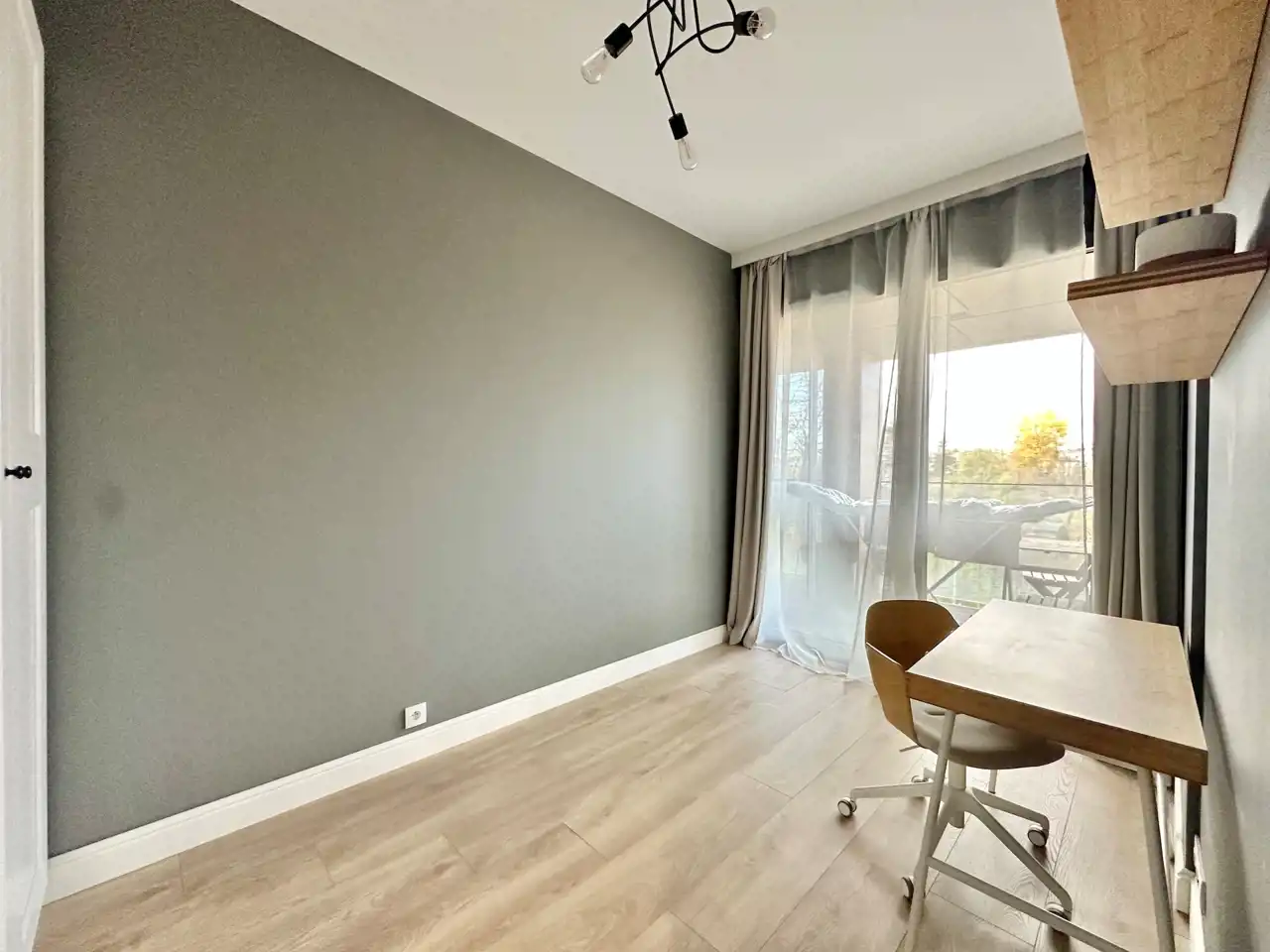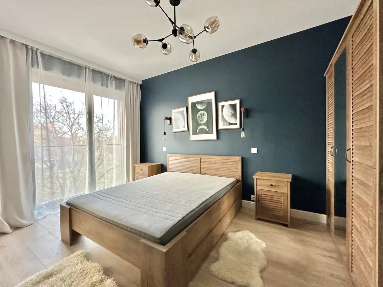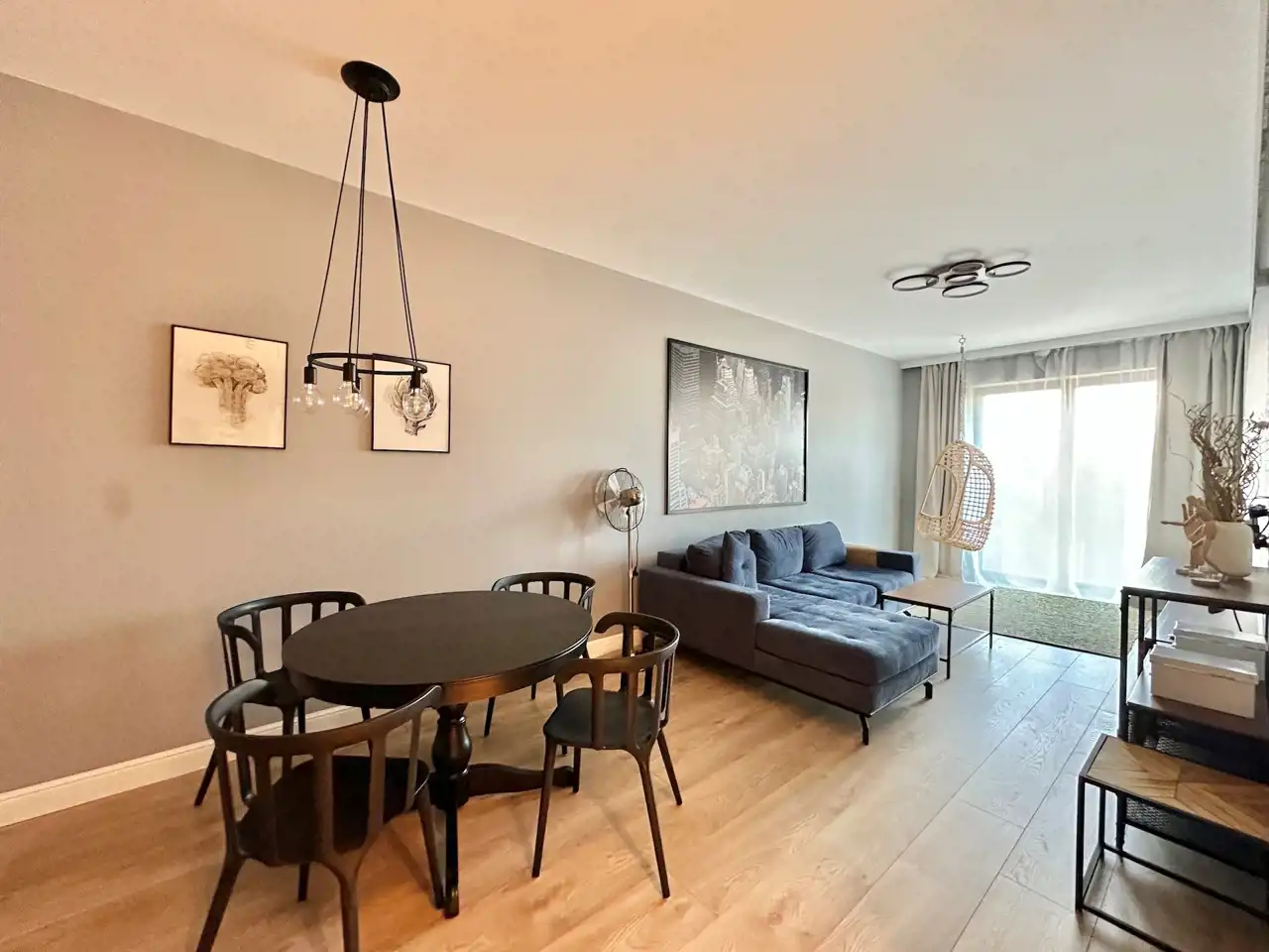 Apartment is located on the 3rd floor, area of 64 m2 consists of a large living room with open kitchen, a bedroom, a smaller room, a bathroom with a toilet and a hall. Apartment has a balcony with a loggia which can be accessed from each room. Whole apartment is fully furnished and equipped to a high standard with attention to detail, very functional. The living room has a corner sofa bed, coffee table, table with chairs, and a SMART TV. Modern kitchen equipped with a dishwasher, oven, induction hob, fridge-freezer, microwave. The bedroom has a large comfortable bed 180x200 + a large wardrobe. The second large built-in wardrobe is located in the hall. bathroom equipped with a shower, sink, washer-dryer. Apartment is bright and spacious. Available immediately. I highly recommended. Call us today and arrange a viewing!