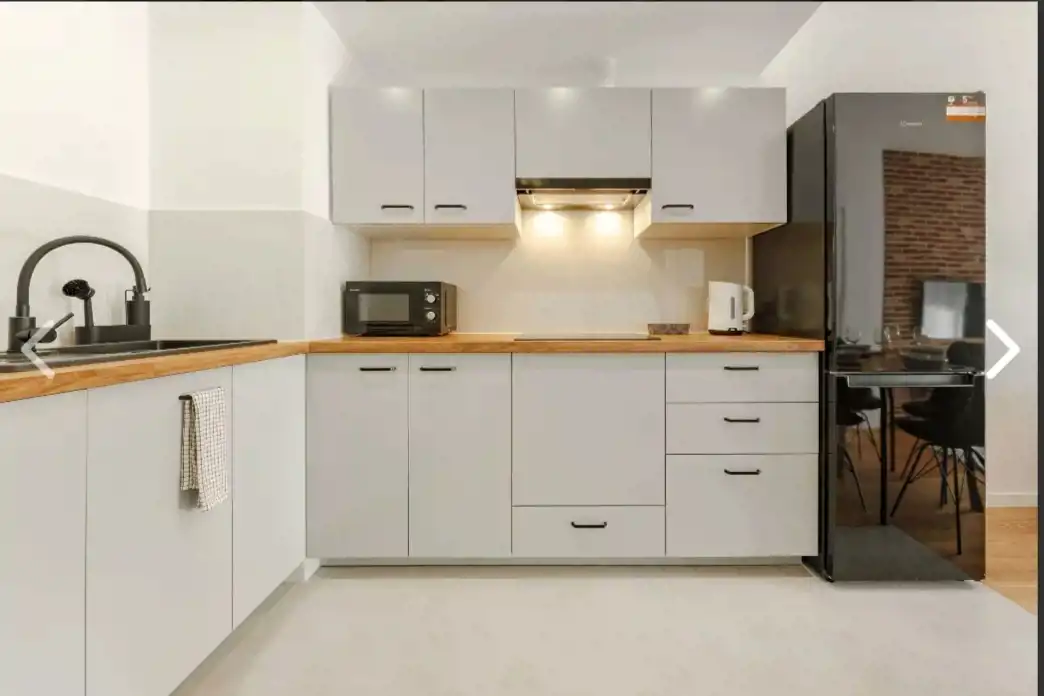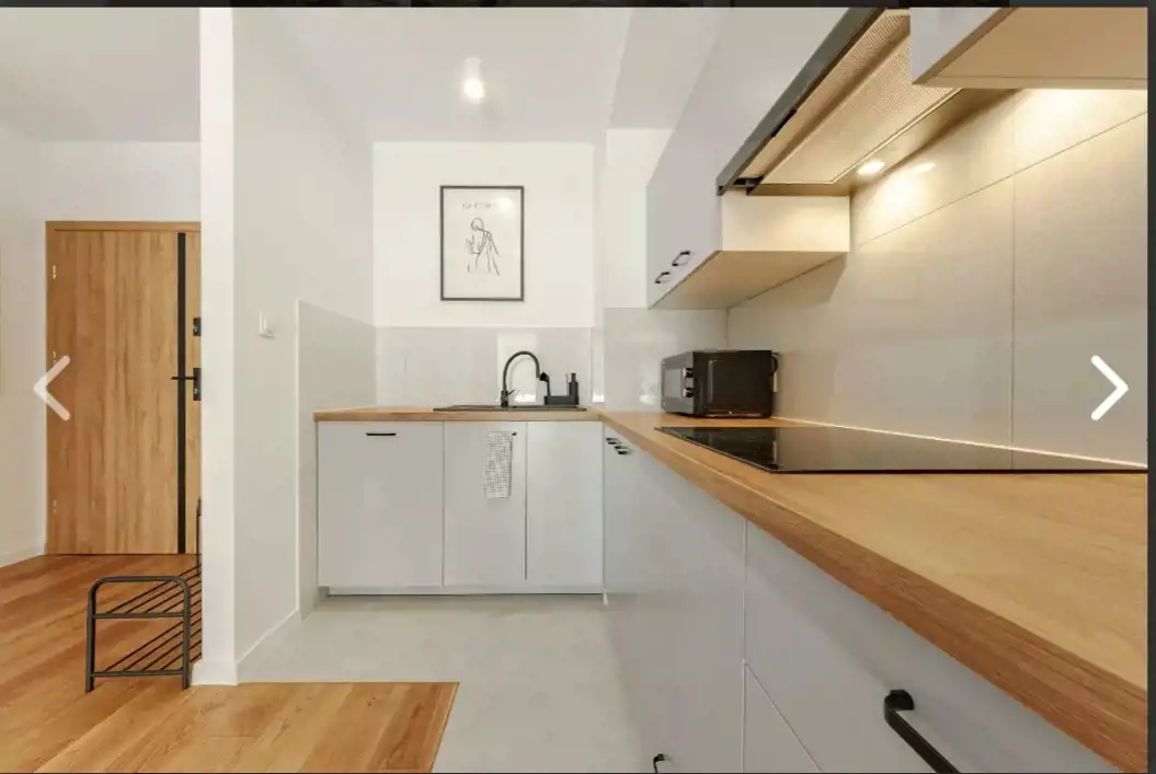 nowoczesna kuchnia z pełnym wyposażeniem (płyta indukcyjna, piekarnik, lodówka, zmywarka, naczynia i akcesoria kuchenne),