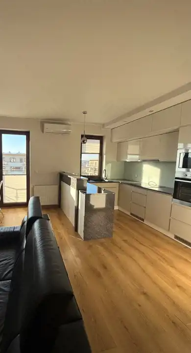 przestronnego salonu z nowoczesną, wyposażoną kuchnią oraz wyjściem na balkon (widok na parking),