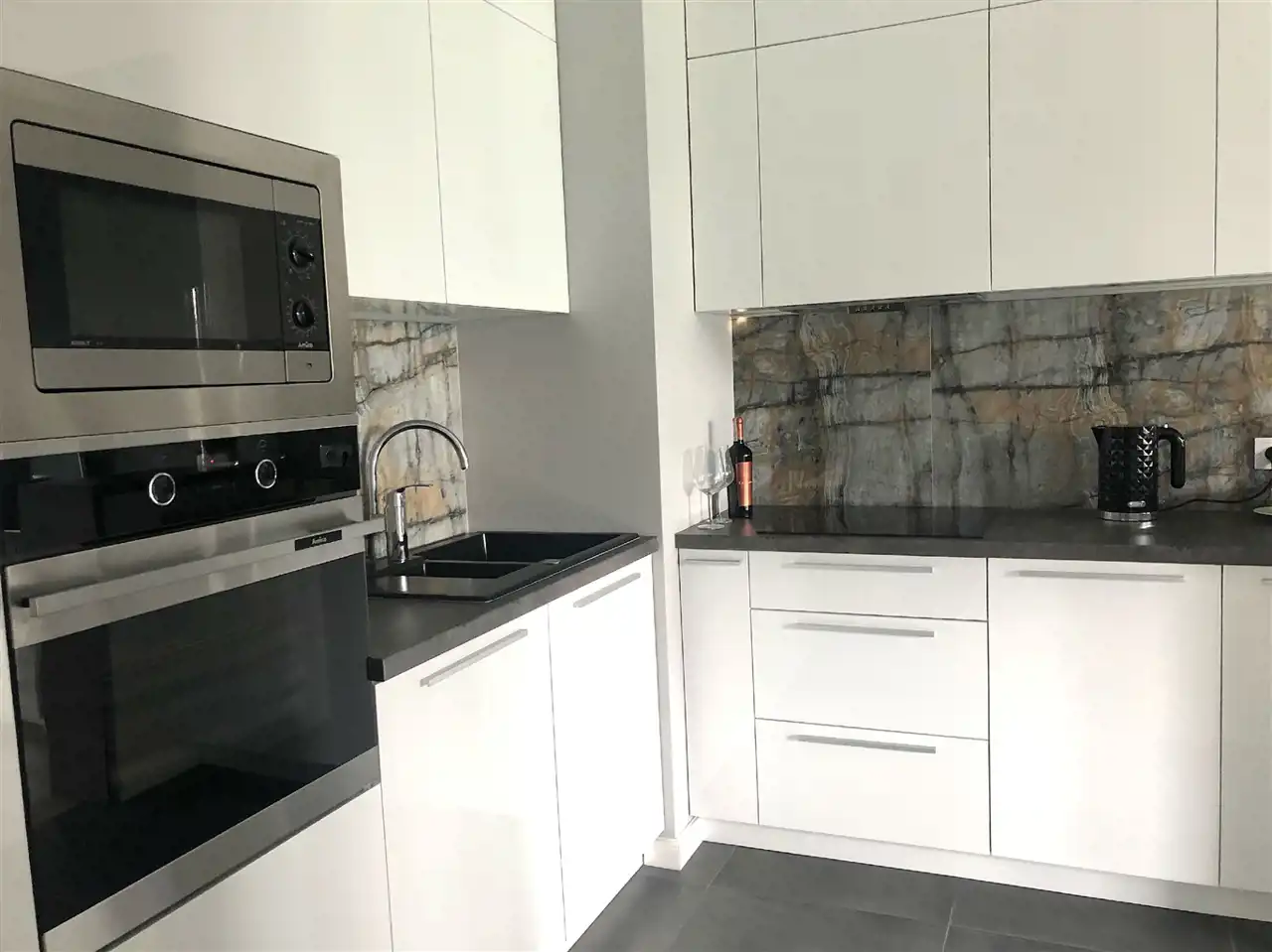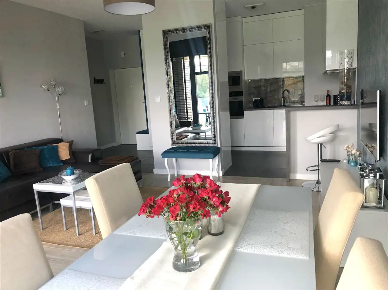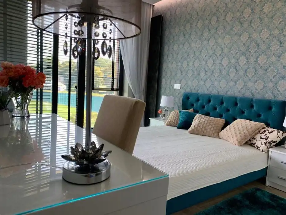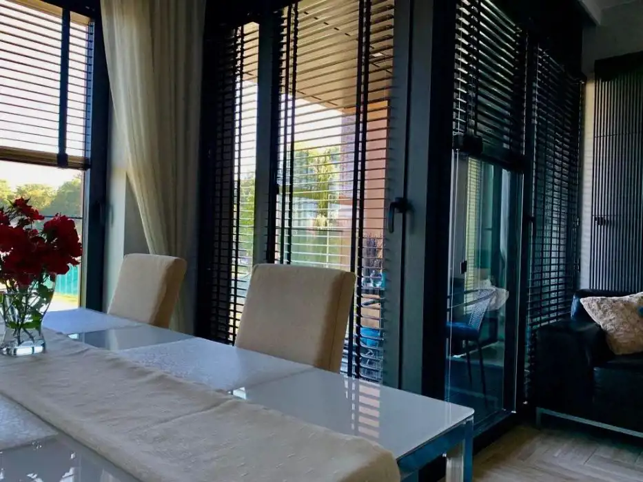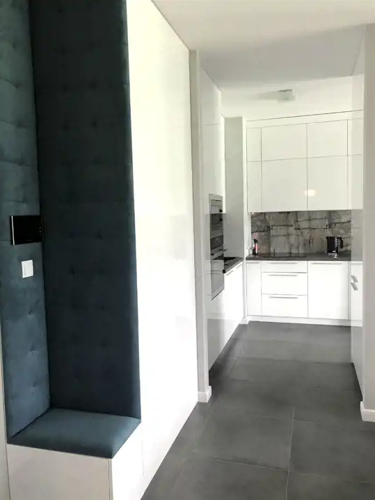 Apartament 52,5 m2 znajduje się na 1 piętrze. W jego skład wchodzą 2 pokoje, kuchnia, łazienka, przedpokój. Dodatkowo zadaszona loggia 5 m2 z panoramicznym widokiem oraz miejsce parkingowe w garażu podziemnym. Mieszkanie wykończone w wysokim standardzie, w pełni umeblowane z klimatyzacją . Zabudowana i wyposażona kuchnia z pełnym AGD ( lodówka, zamrażarka, piekarnik, płyta, kuchenka mikrofalowa, zmywarka, czajnik, naczynia, itp ), odkurzacz i zestaw do prasowania, telewizor, pralka, zabudowa w łazience, sypialni i przedpokoju.