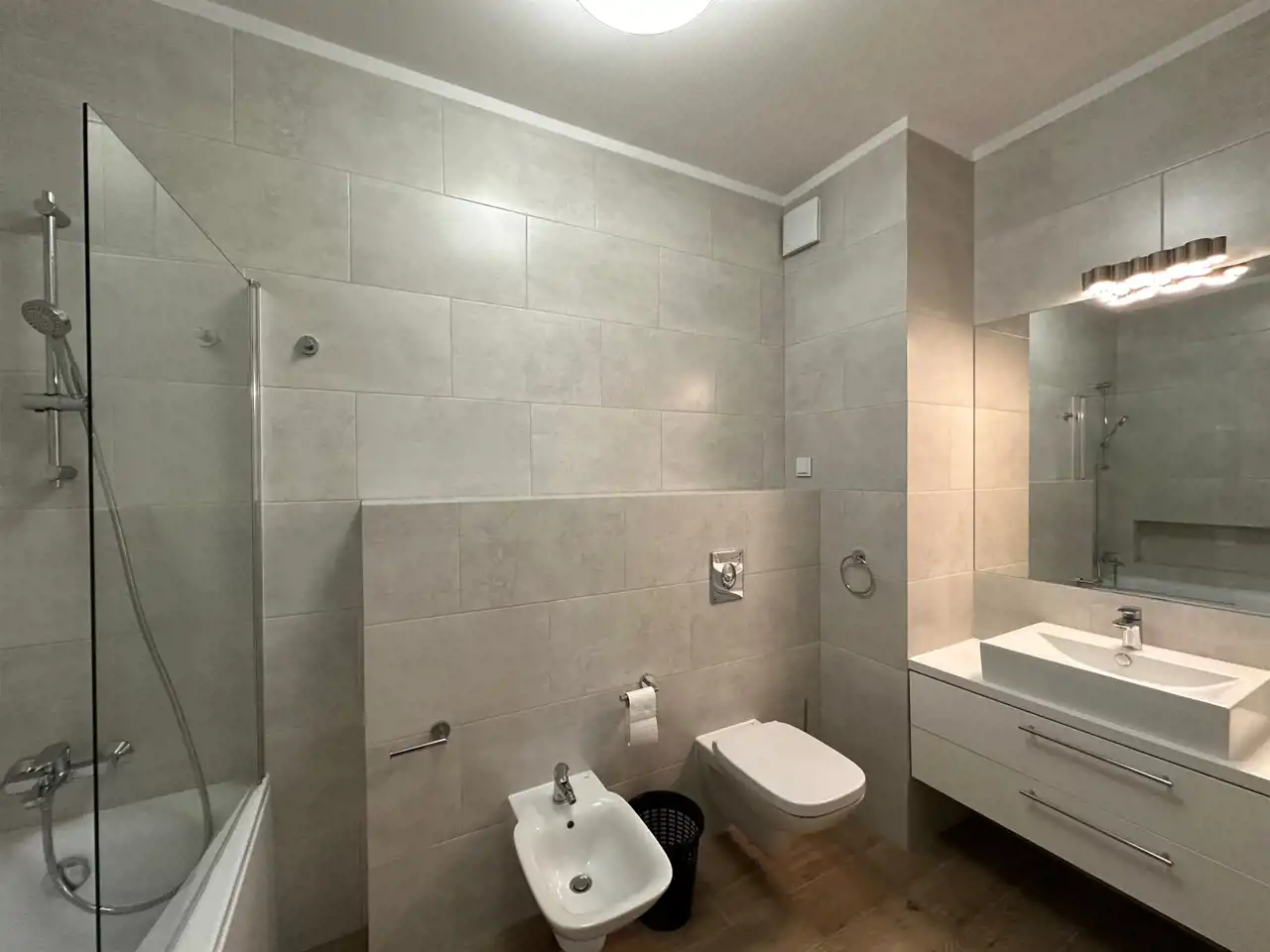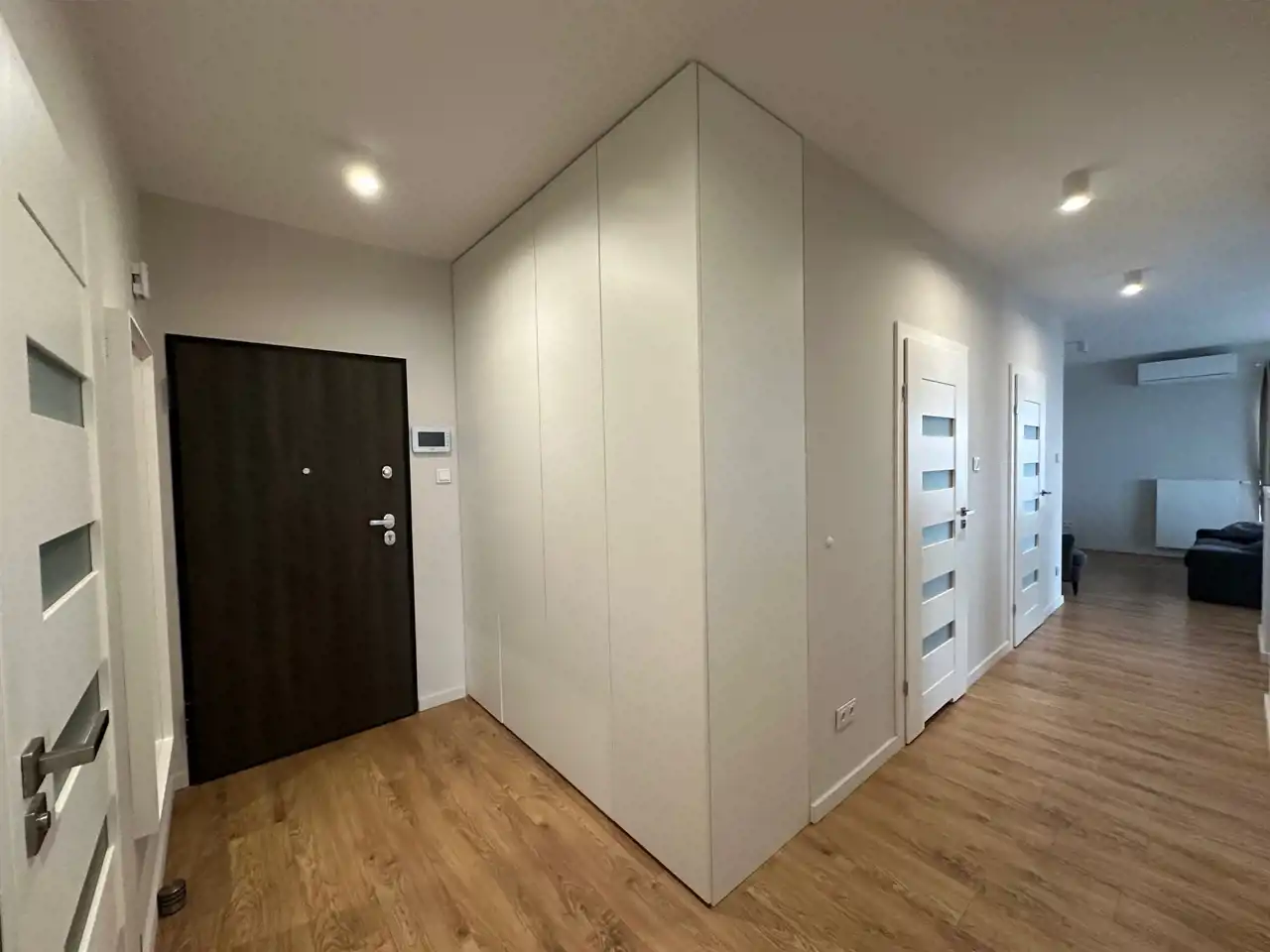 Mieszkanie składa się z nowoczesnego aneksu kuchennego (w pełni wyposażonej) otwartego na salon (z wyjściem na balkon), dwóch sypialni (jedna może służyć jako gabinet), łazienki z wanna i wc, bidetem oraz dodatkowej toalecie z pralnią o łącznej powierzchni 74 mkw. Mieszkanie wykończone w nowoczesnym standardzie z użyciem nowoczesnych mebli i materiałów, w pełni wyposażone w sprzęt AGD i RTV.