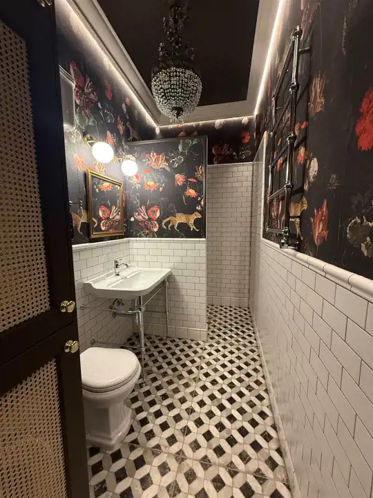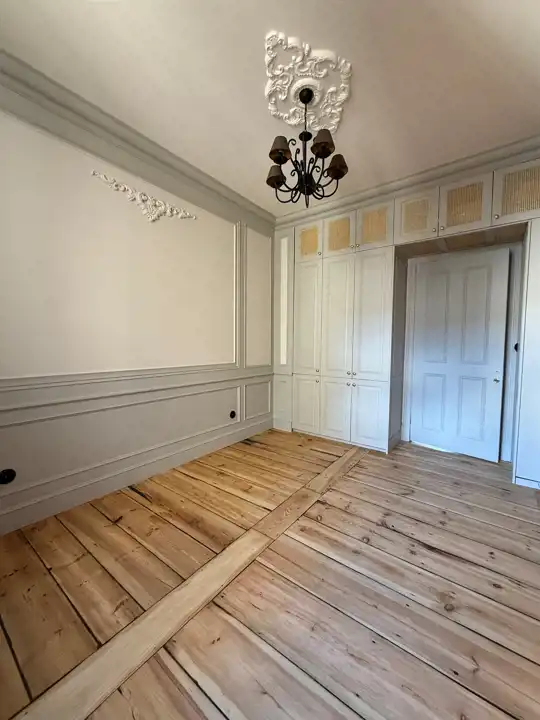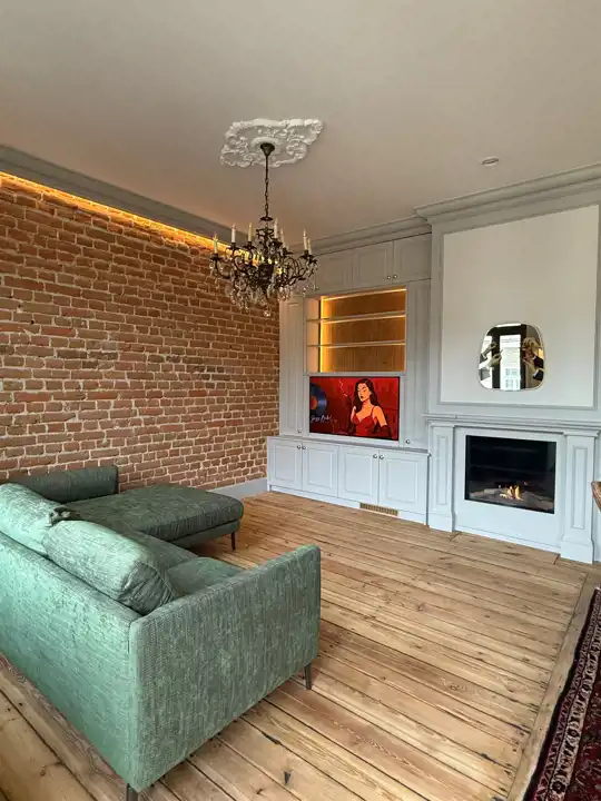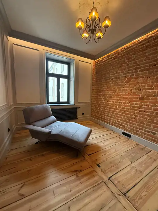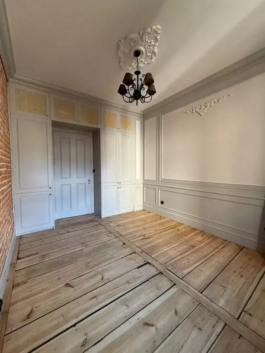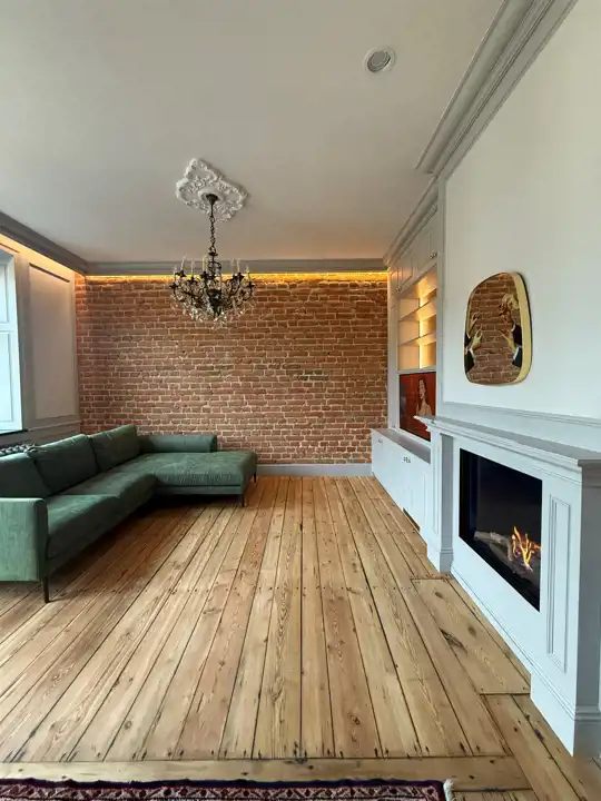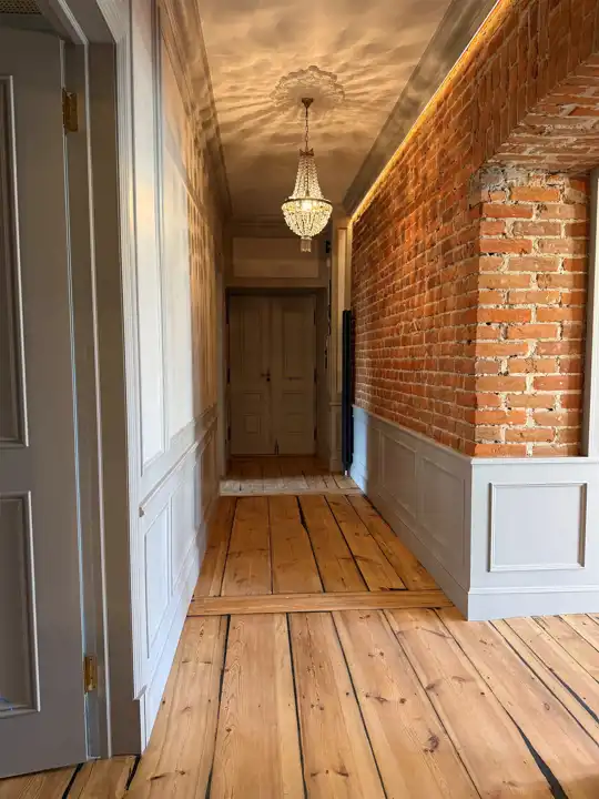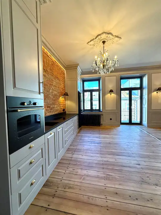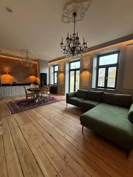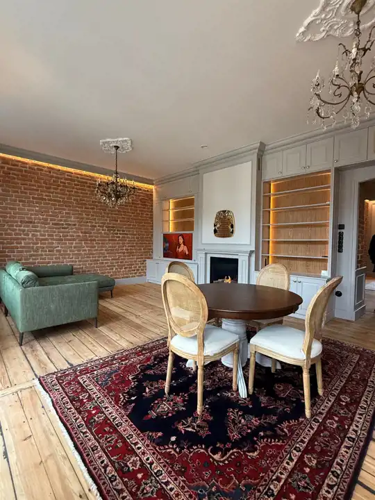 Wnętrze zostało zaprojektowane z dbałością o każdy szczegół – odsłonięta cegła w połączeniu z ozdobnymi sztukateriami, kryształowymi żyrandolami i naturalnym drewnem nadaje mieszkaniu elegancki, a zarazem przytulny charakter. Wysokie sufity, drewniane podłogi i subtelne, jasne zabudowy tworzą wyjątkową harmonię między klasyką a nowoczesnością.