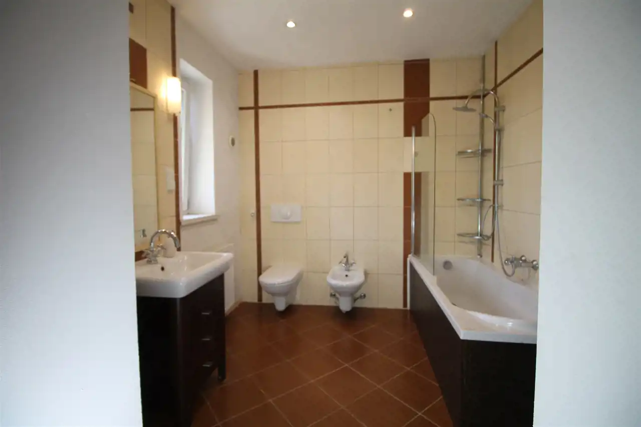Składa się z dużego pokoju dziennego połączonego z wyposażonym i umeblowanym aneksem kuchennym - całość ma ok. 34m2 (istnieje możliwość oddzielenia kuchni), dwóch również sporych (po ok. 17-18m2) sypialni, obszernej łazienki z WC (z przyłączami i miejscem na pralkę).