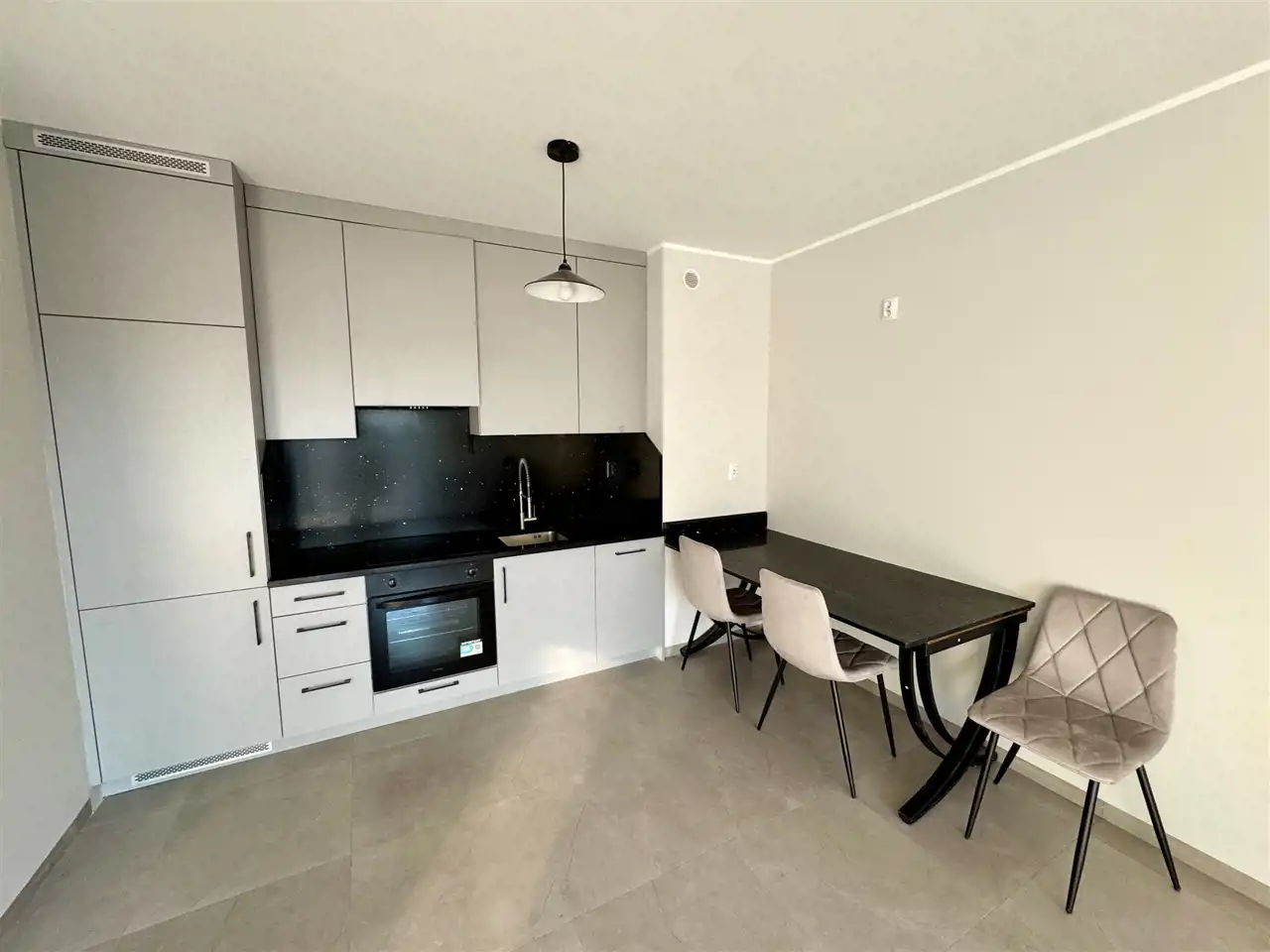 W nowoczesnej zabudowie kuchni znajduje się lodówka, zamrażarka, zmywarka, piekarnik i płyta indukcyjna. W łazience pralka.
