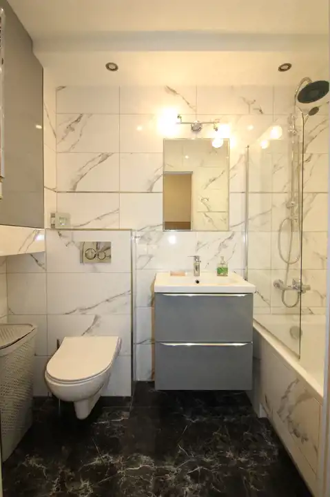 -funkcjonalnej, stylowo wykończonej łazienki z wanną, która posiada także funkcję prysznica, umywalką, zabudową meblową, lustrem, nowym grzejnikiem i toaletą.