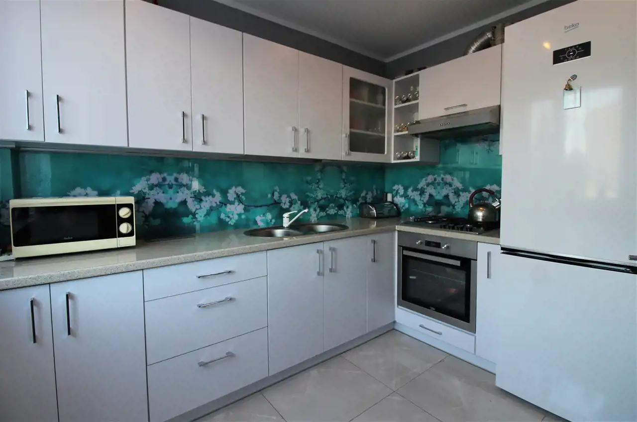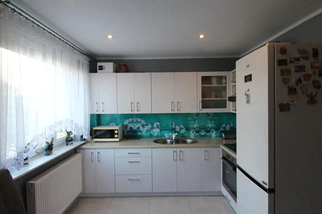 *widną kuchnię wyposażoną w niezbędne sprzęty AGD (piekarnik elektryczny, płyta gazowa), solidne meble na wymiar z dużym blatem roboczym i pięknym lacobelem między szafkami, który poza świetnym efeketem wizualnym jest też bardzo praktyczny i łatwy w utrzymaniu czystości;
