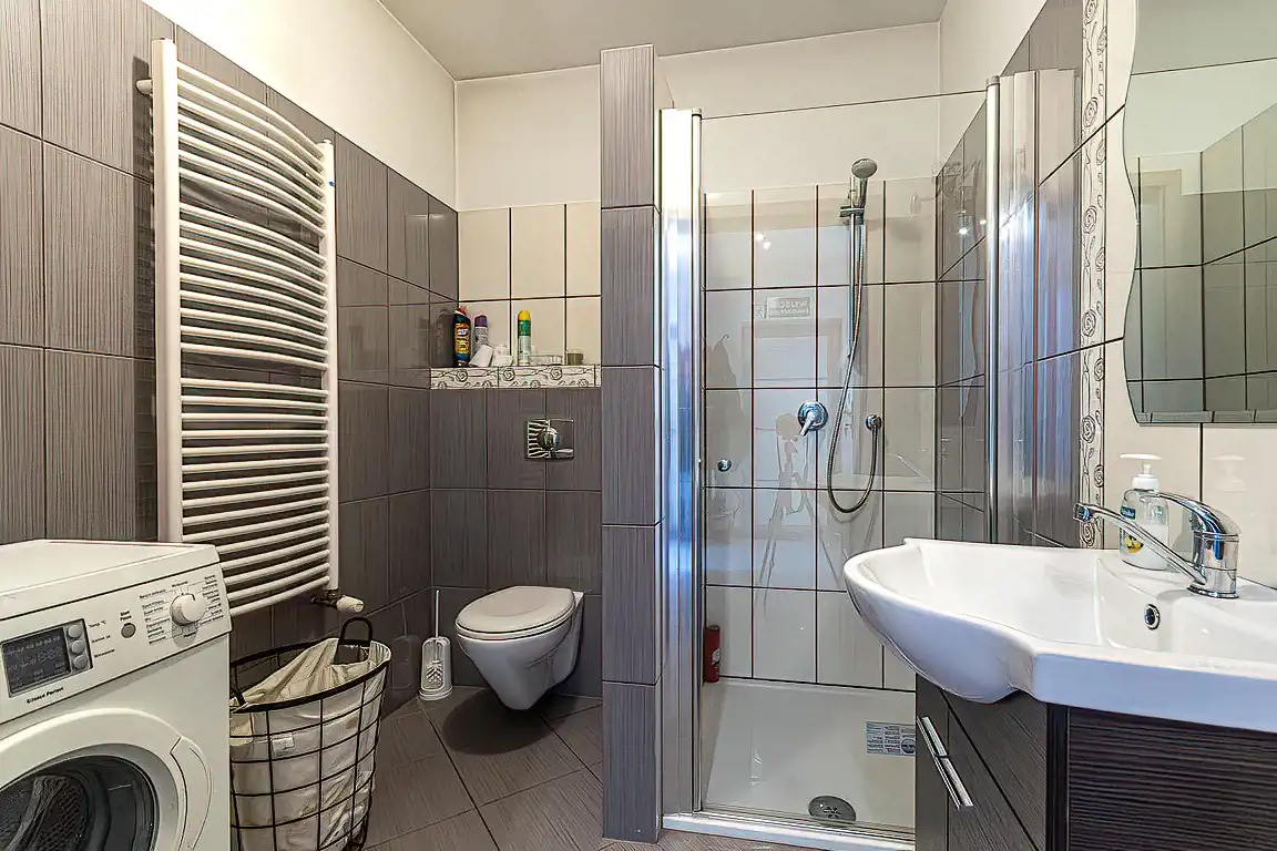 osobnym WC, druga dla biura i gości z prysznicem, pralką - w zasadzie obie te łazienki są