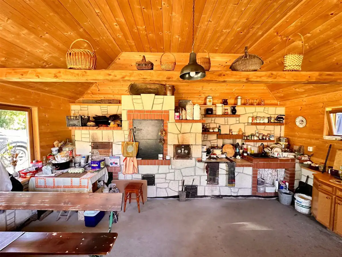 - Budynek o powierzchni 24 m2, w którym znajduje się grill, wędzarnia, piec chlebowy oraz piekarnik żeliwny. Do tego budynku doprowadzona jest woda i prąd.