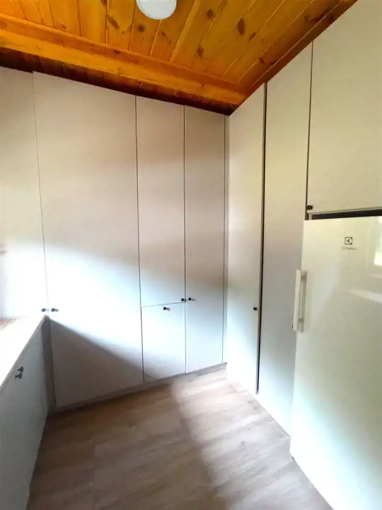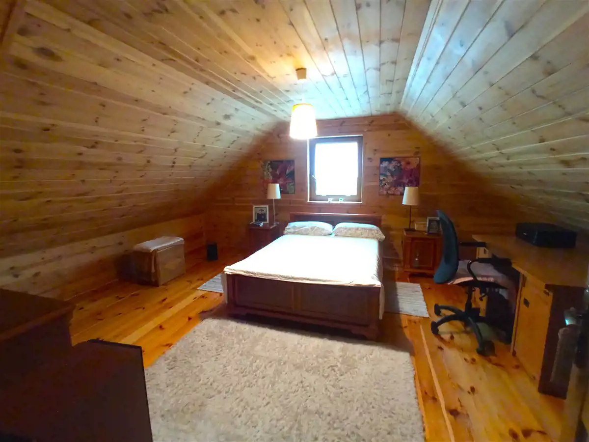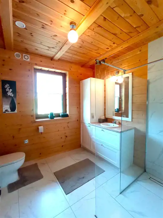- Osobny domek dla gości o powierzchni około 25 m2. Jest w nim prąd oraz woda. Ocieplony jest pianą PUR. Składa się z aneksu kuchennego, łazienki oraz 2 pokoi. Woda podgrzewana za pomocą bojlera elektrycznego. Z kolei do ogrzewania służy tz. koza.