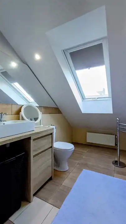 Na parterze domu znajduje się przestronna część dzienna, sypialnia i łazienka oraz część gospodarcza z garażem. Na poddaszu zlokalizowano dodatkowo 2 sypialnie w tym jedną z garderobą, łazienkę i pralnię.