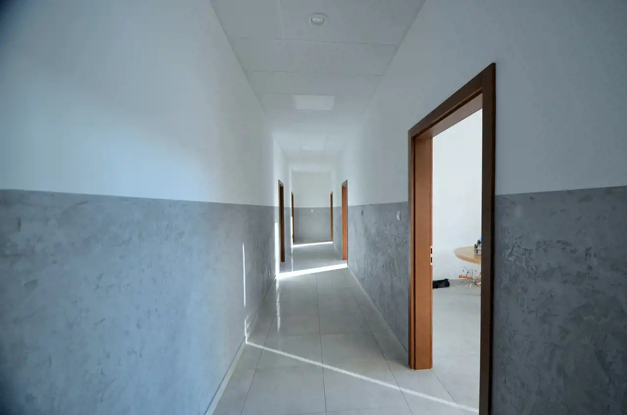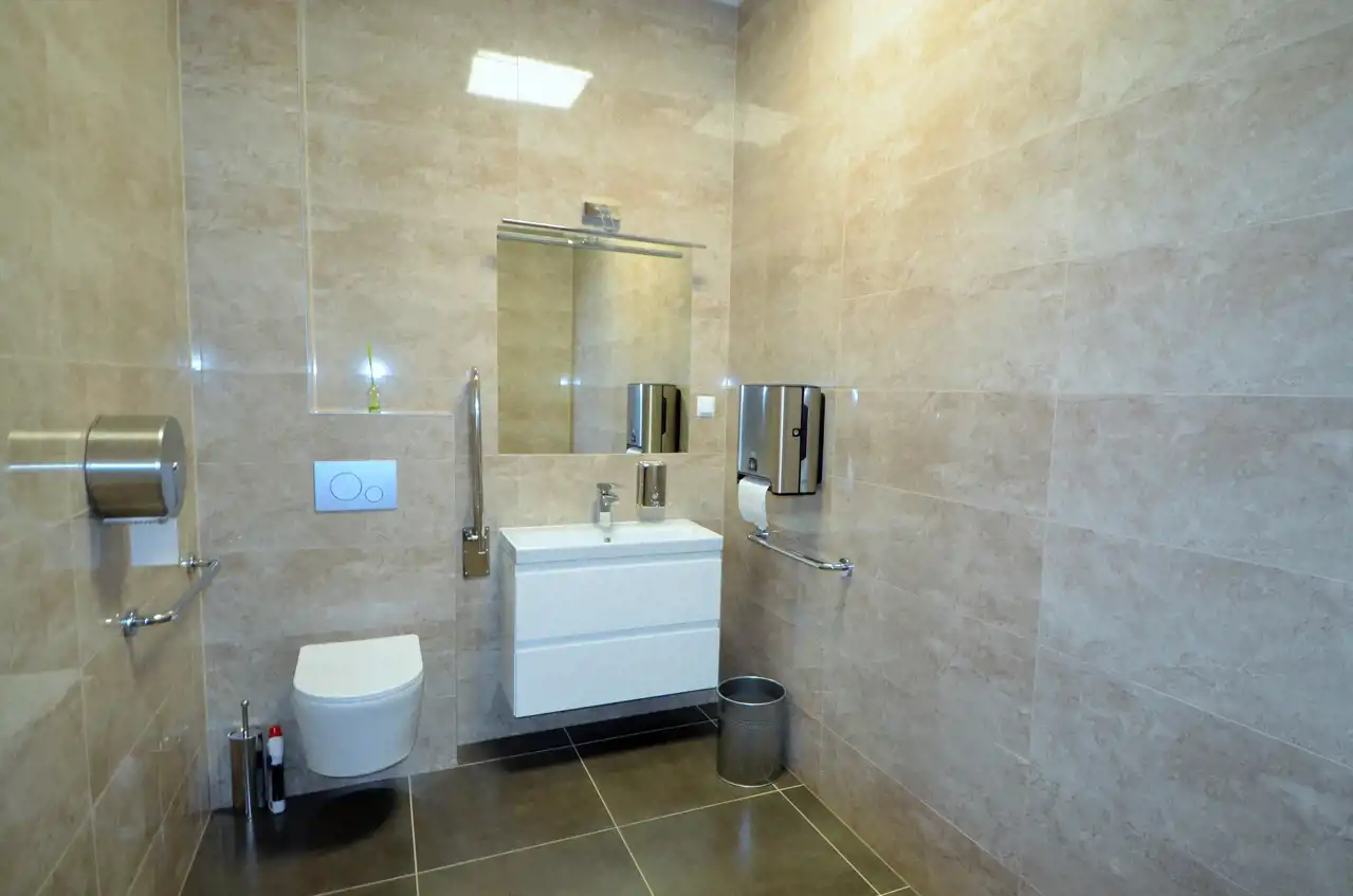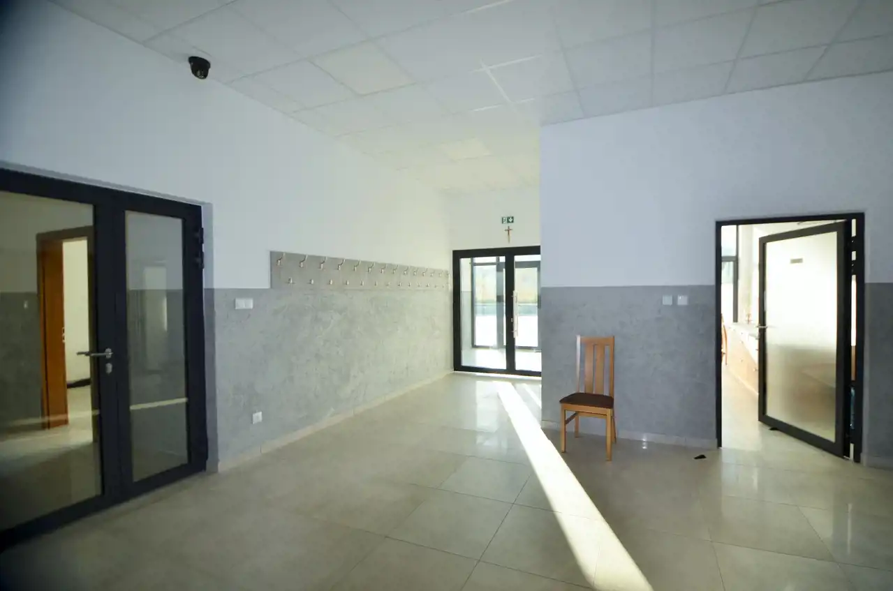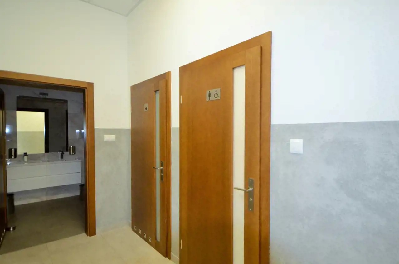 Wspólna duża kuchnia na parterze oraz toalety, przestronny holl