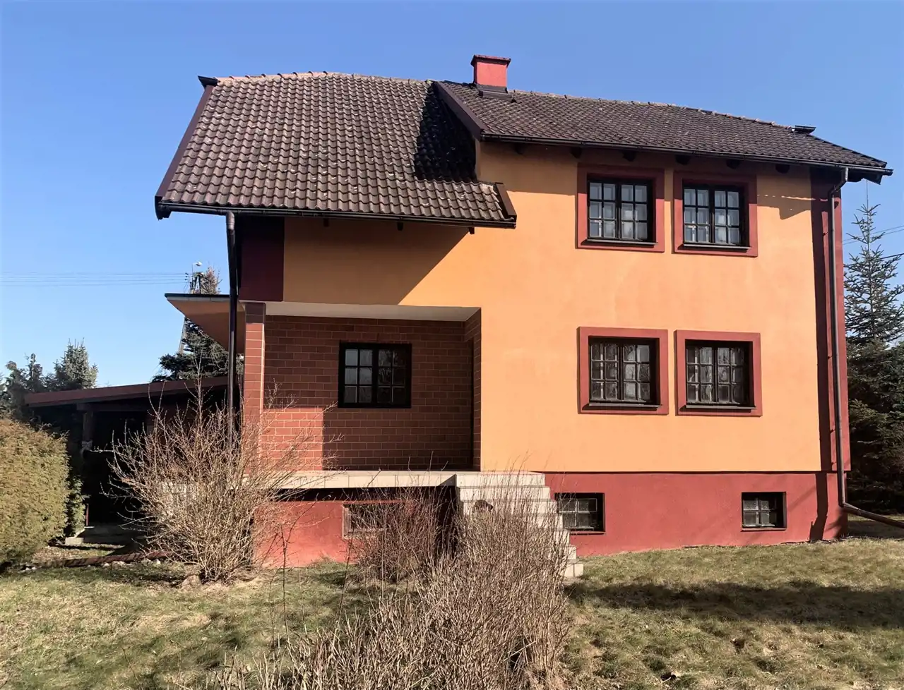 W tej miejscowości oferujemy do sprzedaży dom jednorodzinny na działce o powierzchni 730 m2. Działka narożna, ogrodzona z nasadzeniami przy ogrodzeniu i drewnianą wiatą/drewutnią. Dom z roku 2004, jednopiętrowy, podpiwniczony w całości. Powierzchnia użytkowa to 118,28 m2, powierzchnia gospodarcza 56,63 m3 , całkowita 220 m2. Dom solidnie zbudowany. Ściany zewnętrzne z dwu warstw bloczków z wełną mineralną pośrodku, otynkowane. Strop - lany betonowy. Fundamenty: ławy i ściany wylewane z betonu, ściany wewnętrzne i kominy murowane z cegły pełnej, schody zewnętrzne i wewnętrzne oraz płyta balkonu żelbetowe. Stolarka drzwiowa i okienna drewniana typowa. Dach o konstrukcji krokwiowo - jętkowej pokryty dachówką betonową ''Seeger''. Dom solidnie zbudowany, metodą tradycyjną.