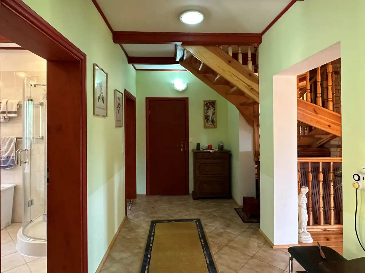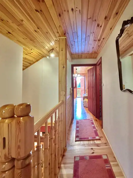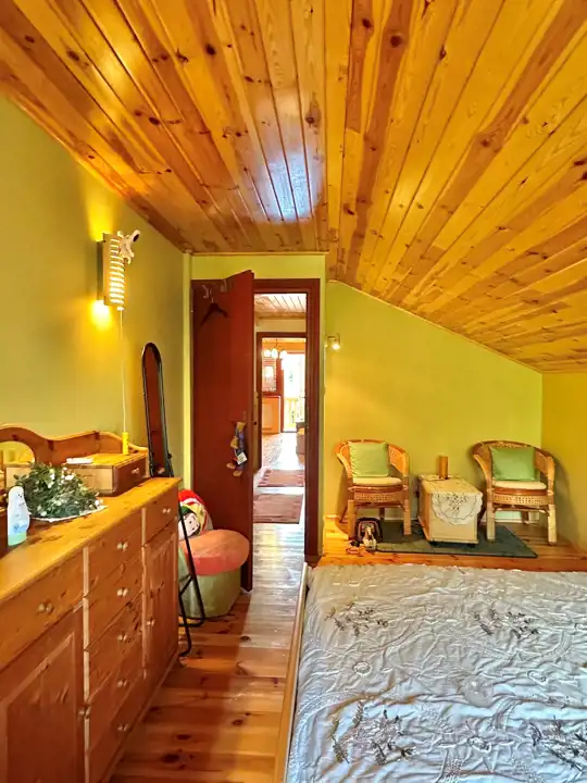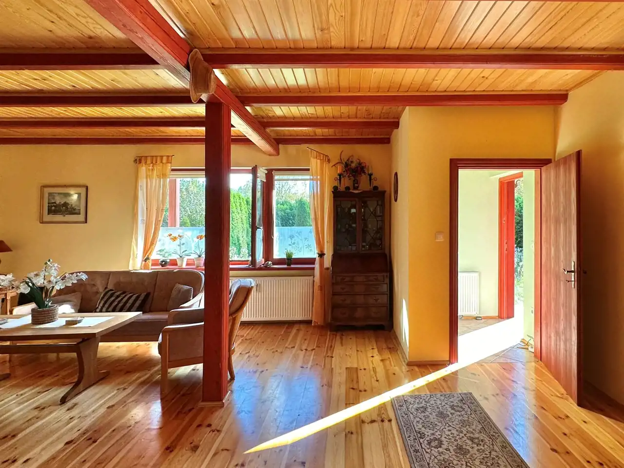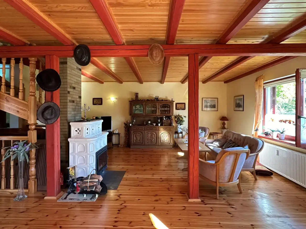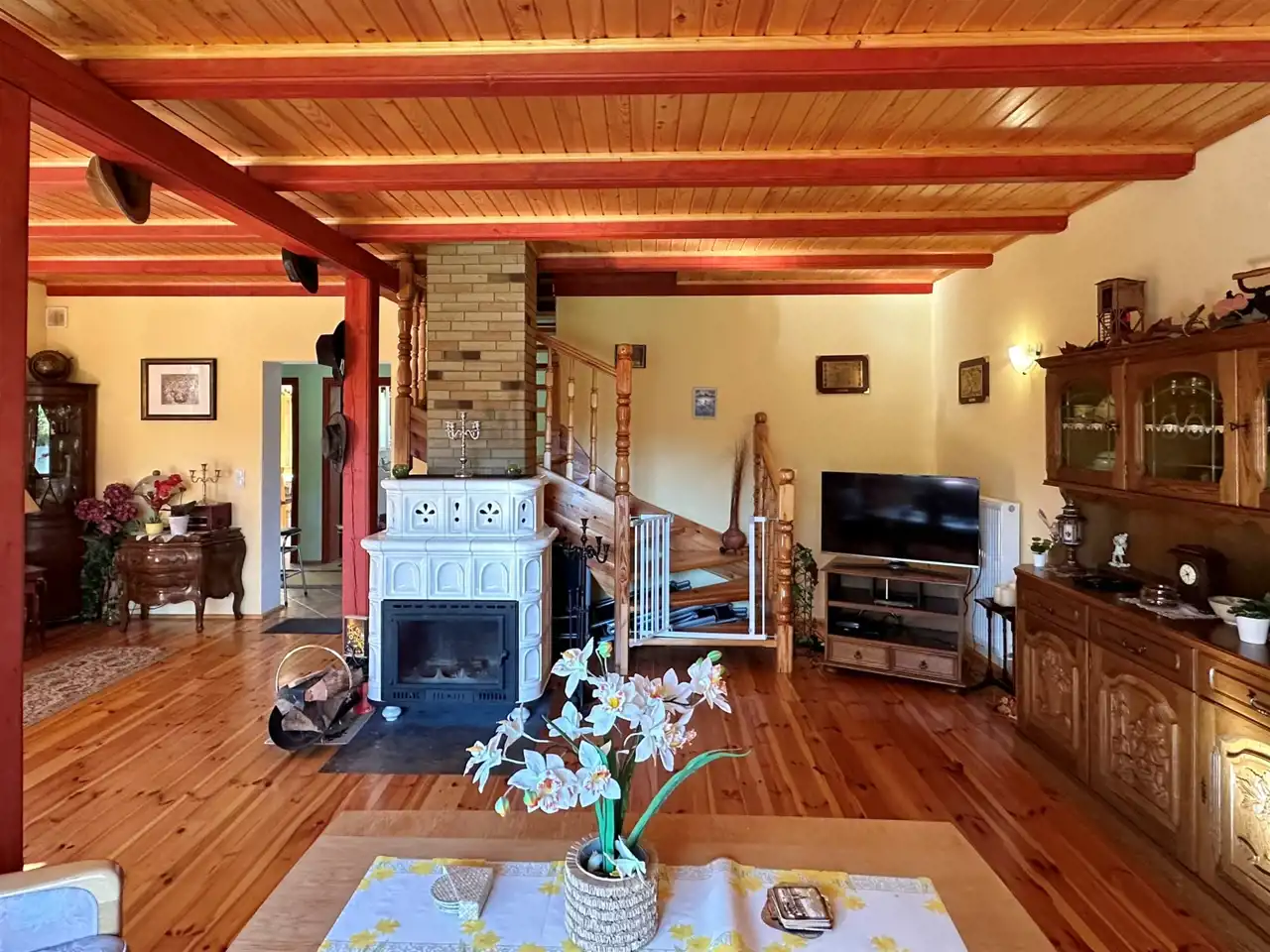 Okna dwuwarstwowe z okiennicami. Ogrzewanie i ciepła woda -piec olejowy Buderus. Woda, kanalizacja i prąd- sieć gminna. Dodatkowo własne ujęcie wody ze studni głębinowej. W salonie kominek zamknięty, z ceramiczną obudową kumulującą ciepło. Podłogi w salonie i sypialniach drewniane, sosnowe. W łazienkach, kuchni, jadalni i w przedpokojach- terakotowe. Sufity w większości pomieszczeń drewniane z wyeksponowanymi słupami i podciągami, co nadaje wnętrzom stylowego, rustykalnego charakteru i ciepła. Schody i stolarka drzwiowa drewniane. Wysokiej klasy wyposażenie kuchni i łazienek.