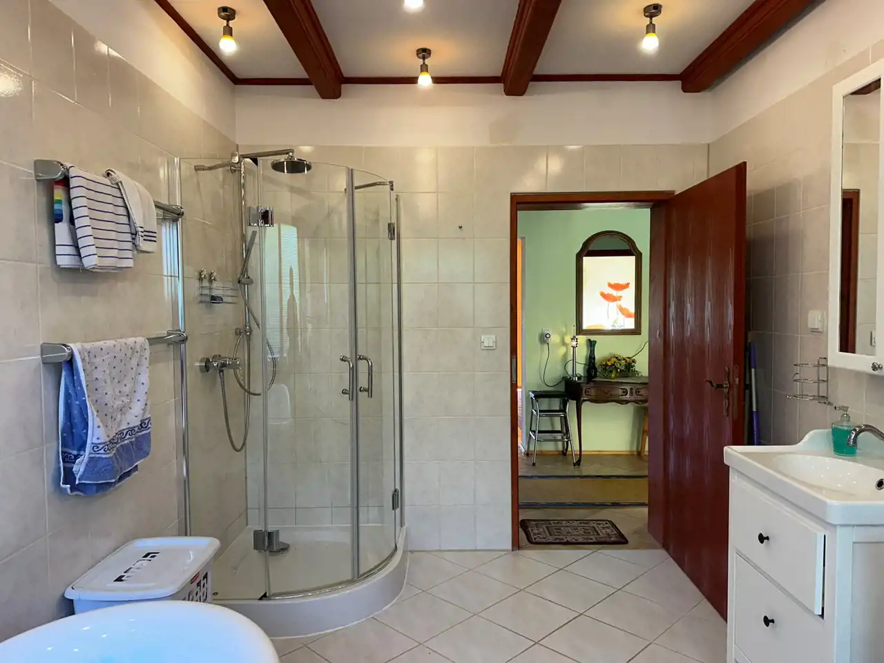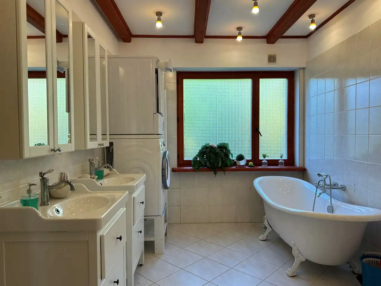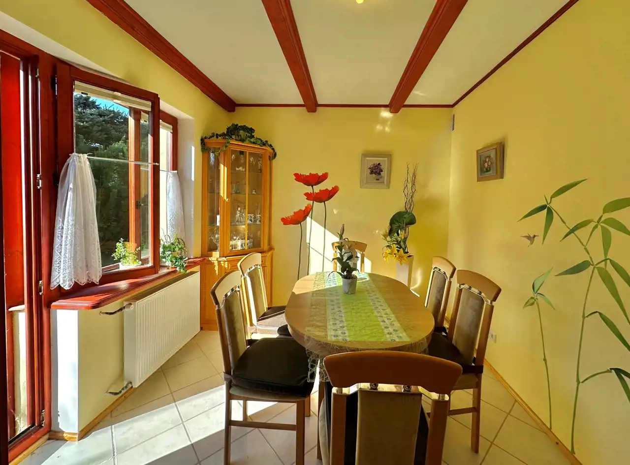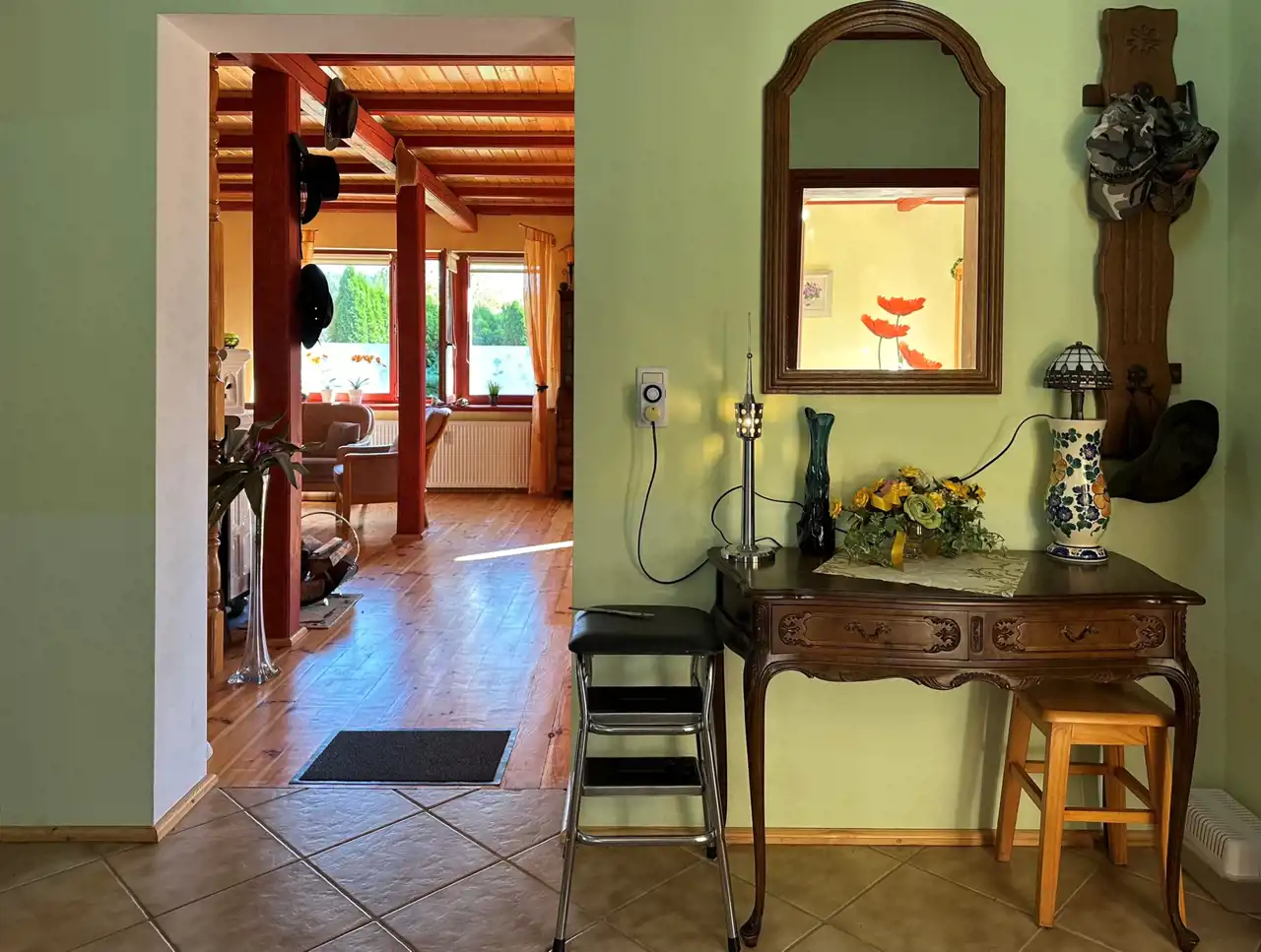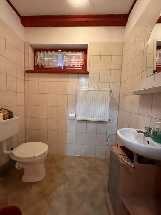 Okna dwuwarstwowe z okiennicami. Ogrzewanie i ciepła woda -piec olejowy Buderus. Woda, kanalizacja i prąd- sieć gminna. Dodatkowo własne ujęcie wody ze studni głębinowej. W salonie kominek zamknięty, z ceramiczną obudową kumulującą ciepło. Podłogi w salonie i sypialniach drewniane, sosnowe. W łazienkach, kuchni, jadalni i w przedpokojach- terakotowe. Sufity w większości pomieszczeń drewniane z wyeksponowanymi słupami i podciągami, co nadaje wnętrzom stylowego, rustykalnego charakteru i ciepła. Schody i stolarka drzwiowa drewniane. Wysokiej klasy wyposażenie kuchni i łazienek.