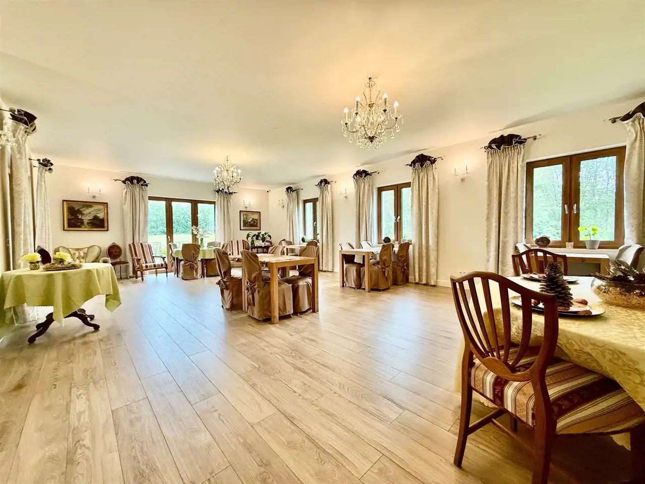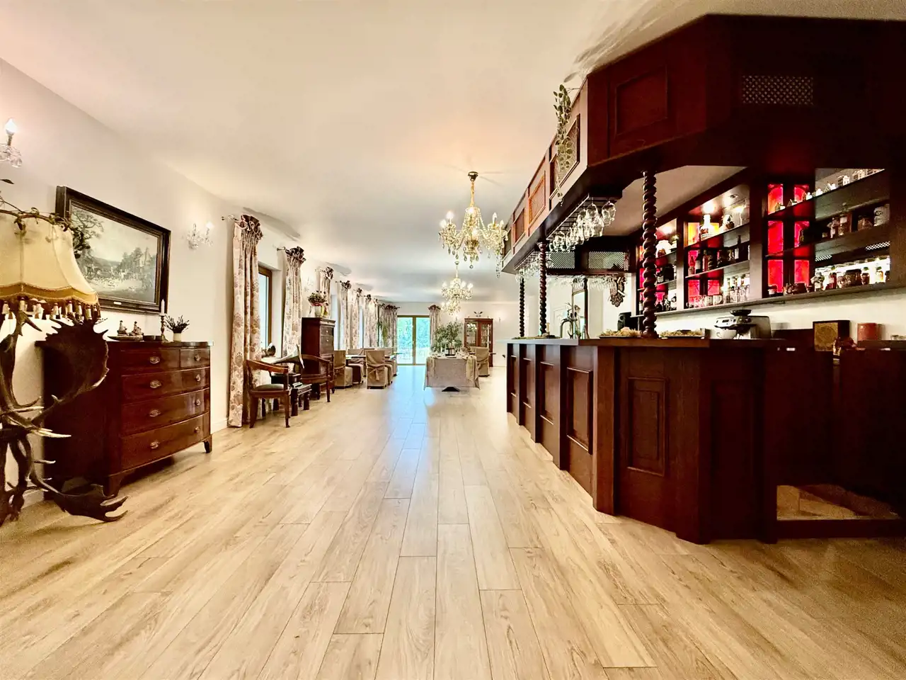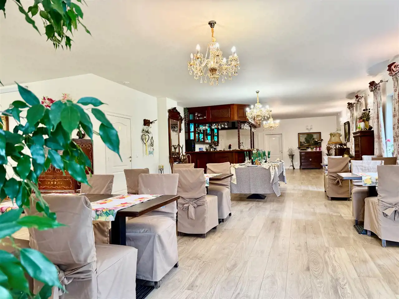 Część reprezentacyjna to przestronna sala restauracyjna, mieszcząca do 60 osób. Wysokie sufity, klasyczne wykończenia, solidne meble i naturalne światło tworzą atmosferę wyjątkowego komfortu. Obok znajduje się w pełni wyposażona kuchnia gastronomiczna z odbiorem Sanepidu – z piecem konwekcyjnym, frytownicą, wyparzarką, obieralnią i kompletem naczyń. Całość pozostaje na miejscu. Bar został technicznie odebrany – wymaga jedynie koncesji. W tej części przewidziano również miejsce na kominek oraz nowoczesną salę konferencyjną z projektorem i dwoma ekranami.