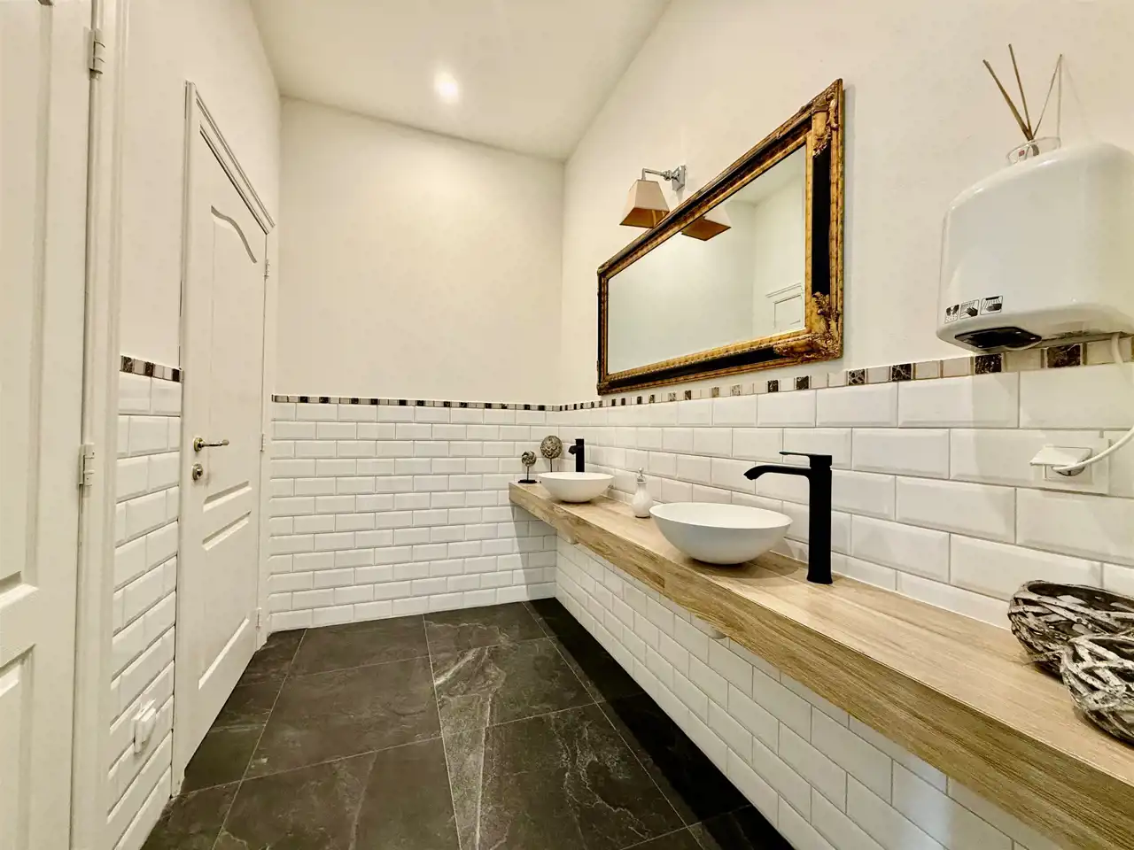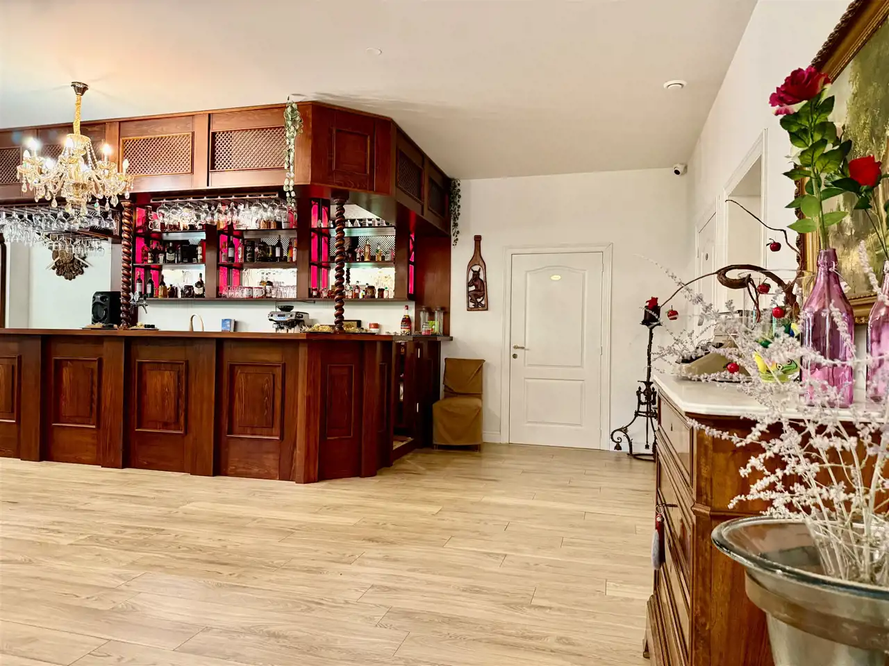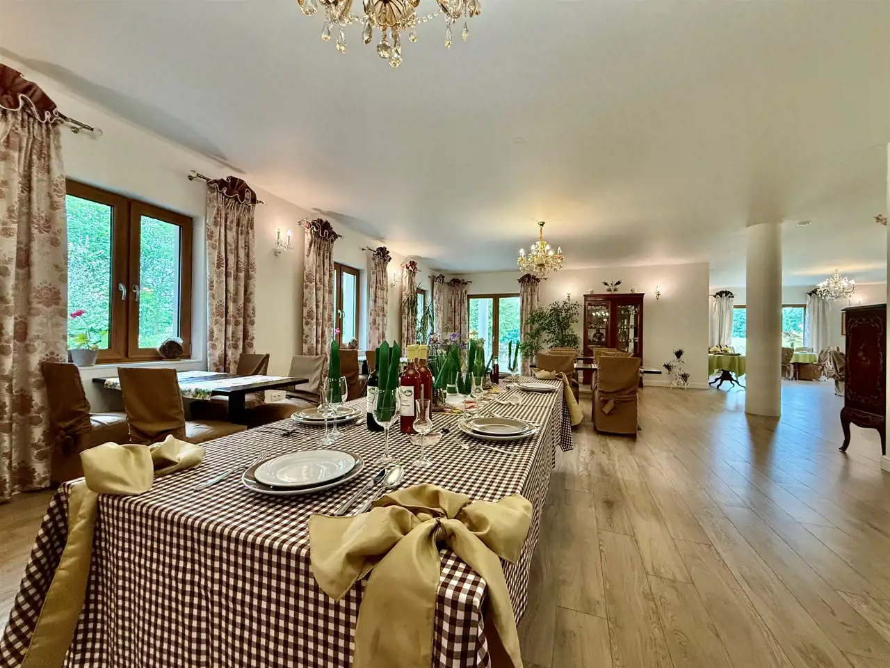 Część reprezentacyjna to przestronna sala restauracyjna, mieszcząca do 60 osób. Wysokie sufity, klasyczne wykończenia, solidne meble i naturalne światło tworzą atmosferę wyjątkowego komfortu. Obok znajduje się w pełni wyposażona kuchnia gastronomiczna z odbiorem Sanepidu – z piecem konwekcyjnym, frytownicą, wyparzarką, obieralnią i kompletem naczyń. Całość pozostaje na miejscu. Bar został technicznie odebrany – wymaga jedynie koncesji. W tej części przewidziano również miejsce na kominek oraz nowoczesną salę konferencyjną z projektorem i dwoma ekranami.
