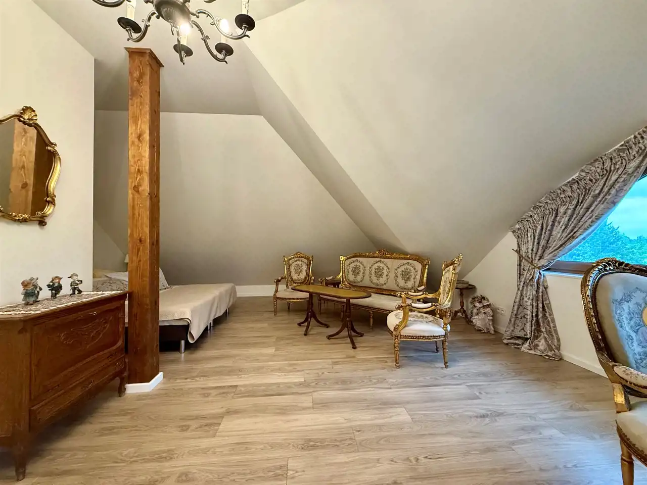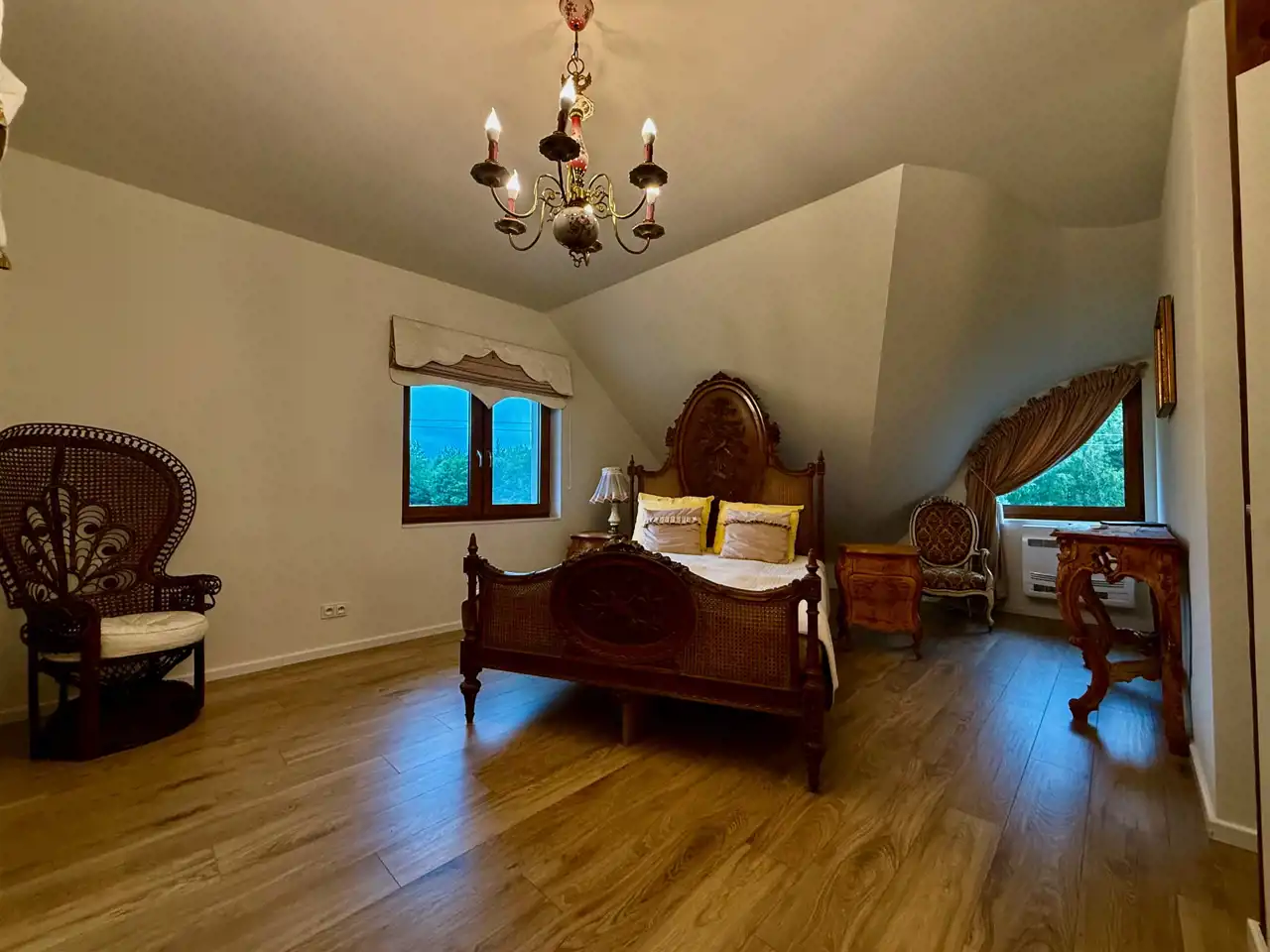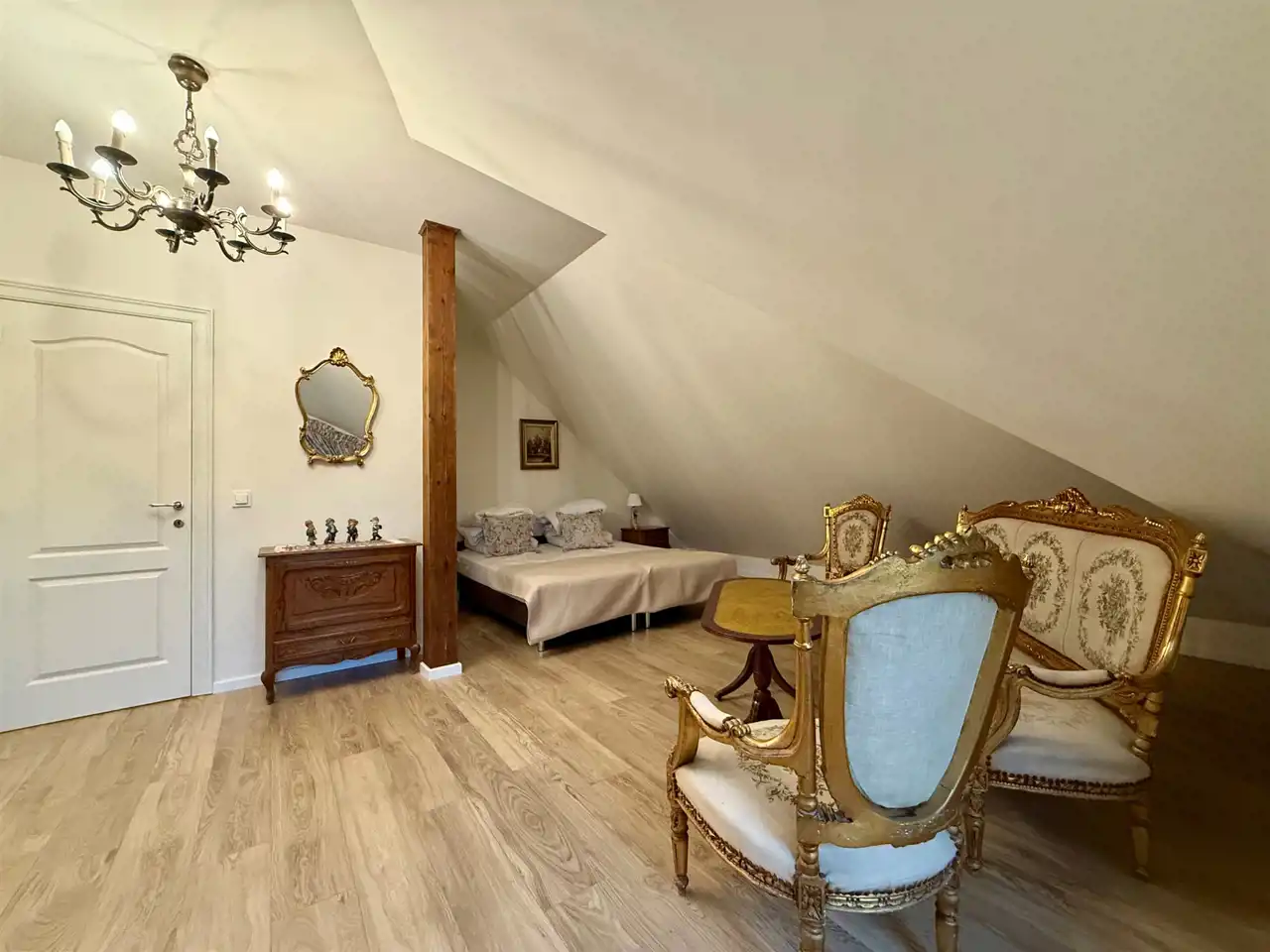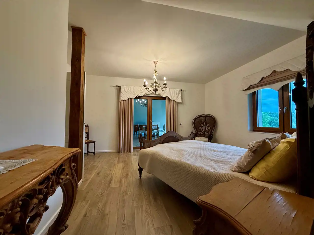Na piętrze znajduje się dziesięć stylowych pokoi, każdy z własną łazienką. Goście mają również do dyspozycji osobną, w pełni wyposażoną kuchnię, co sprawia, że piętro może funkcjonować niezależnie. Na zewnątrz znajdują się dwa tarasy oraz okrągły basen o średnicy dziewięciu metrów i głębokości 1,4 m – gotowy do użytku.