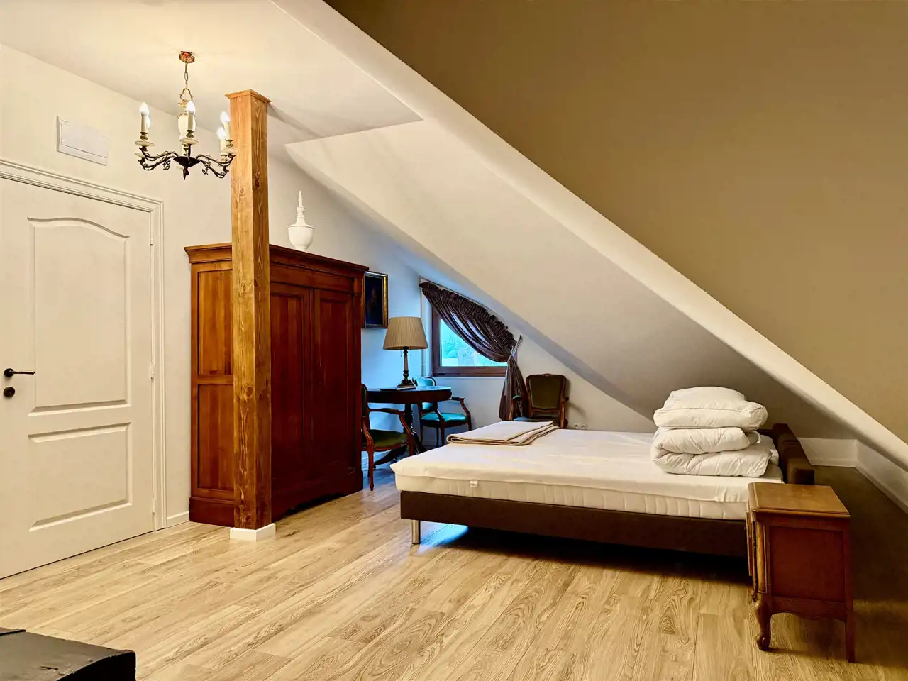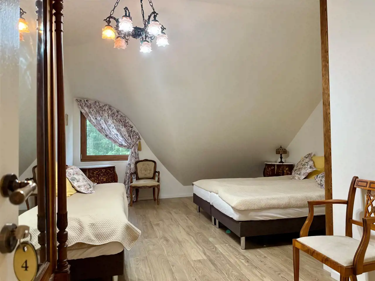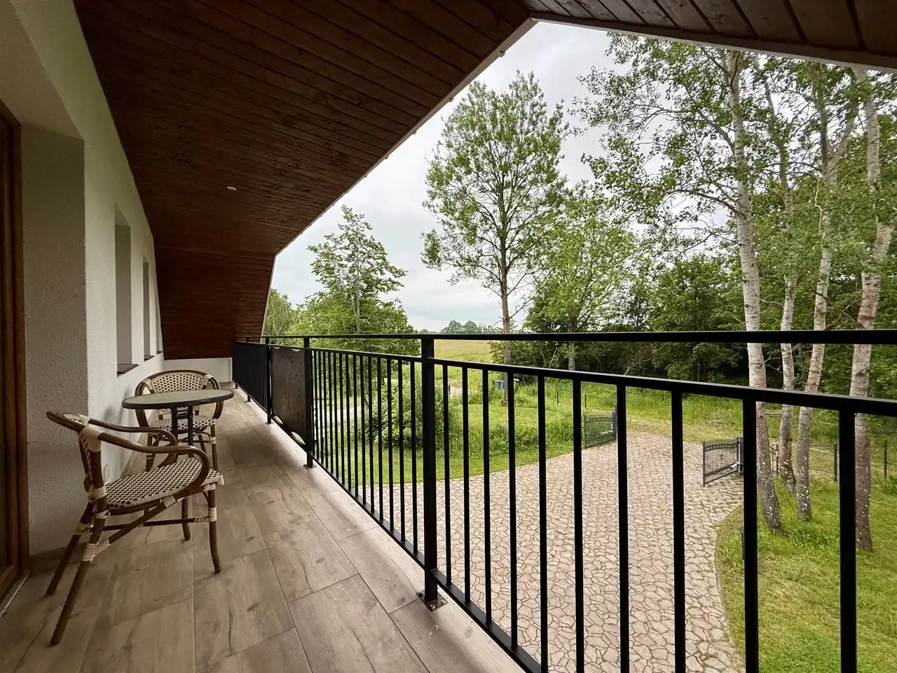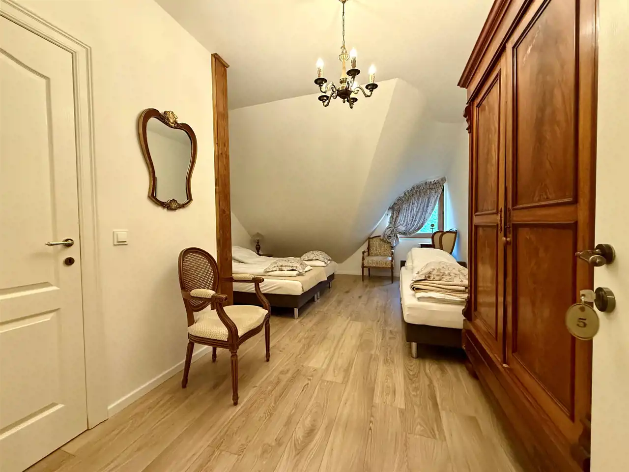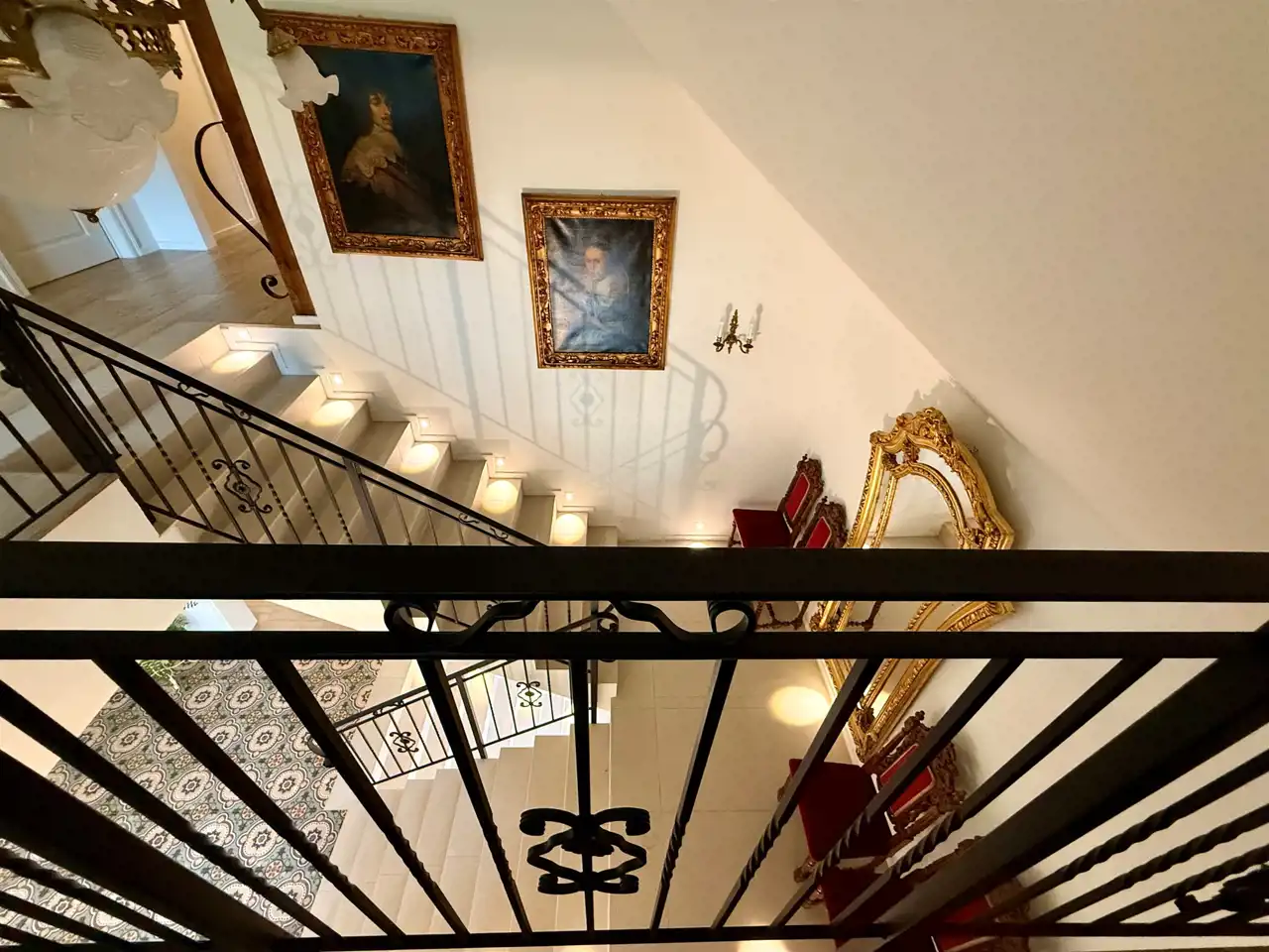 Na piętrze znajduje się dziesięć stylowych pokoi, każdy z własną łazienką. Goście mają również do dyspozycji osobną, w pełni wyposażoną kuchnię, co sprawia, że piętro może funkcjonować niezależnie. Na zewnątrz znajdują się dwa tarasy oraz okrągły basen o średnicy dziewięciu metrów i głębokości 1,4 m – gotowy do użytku.