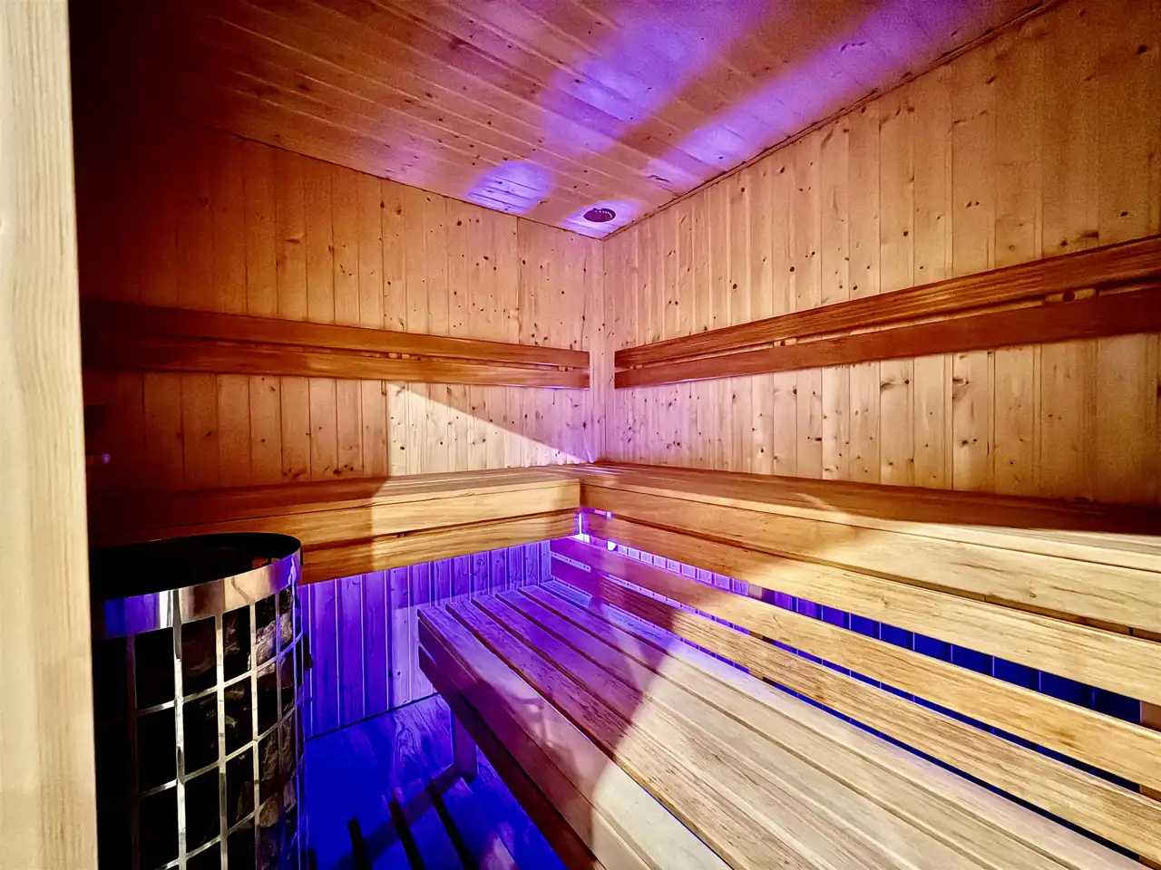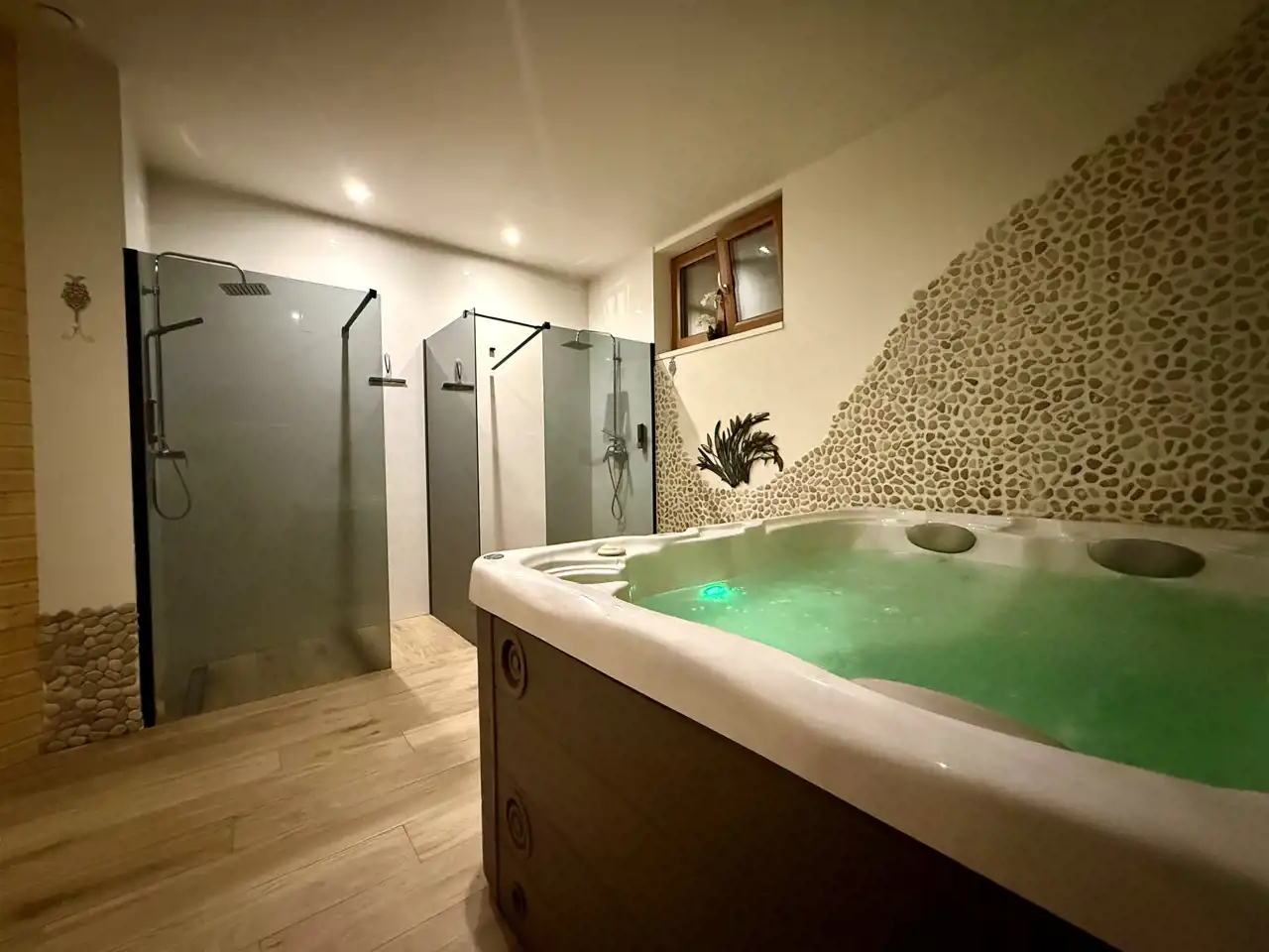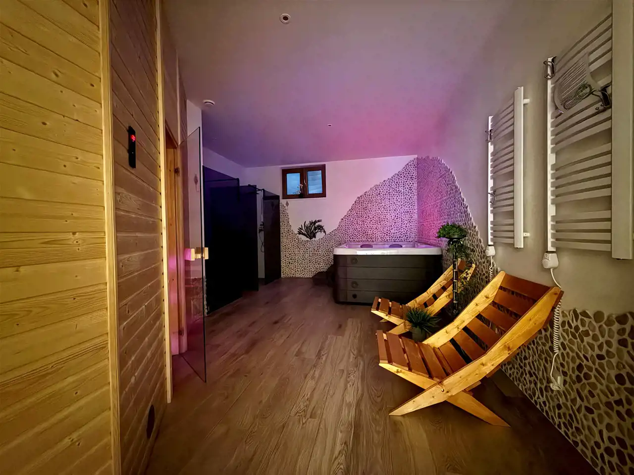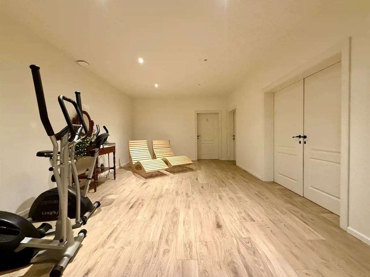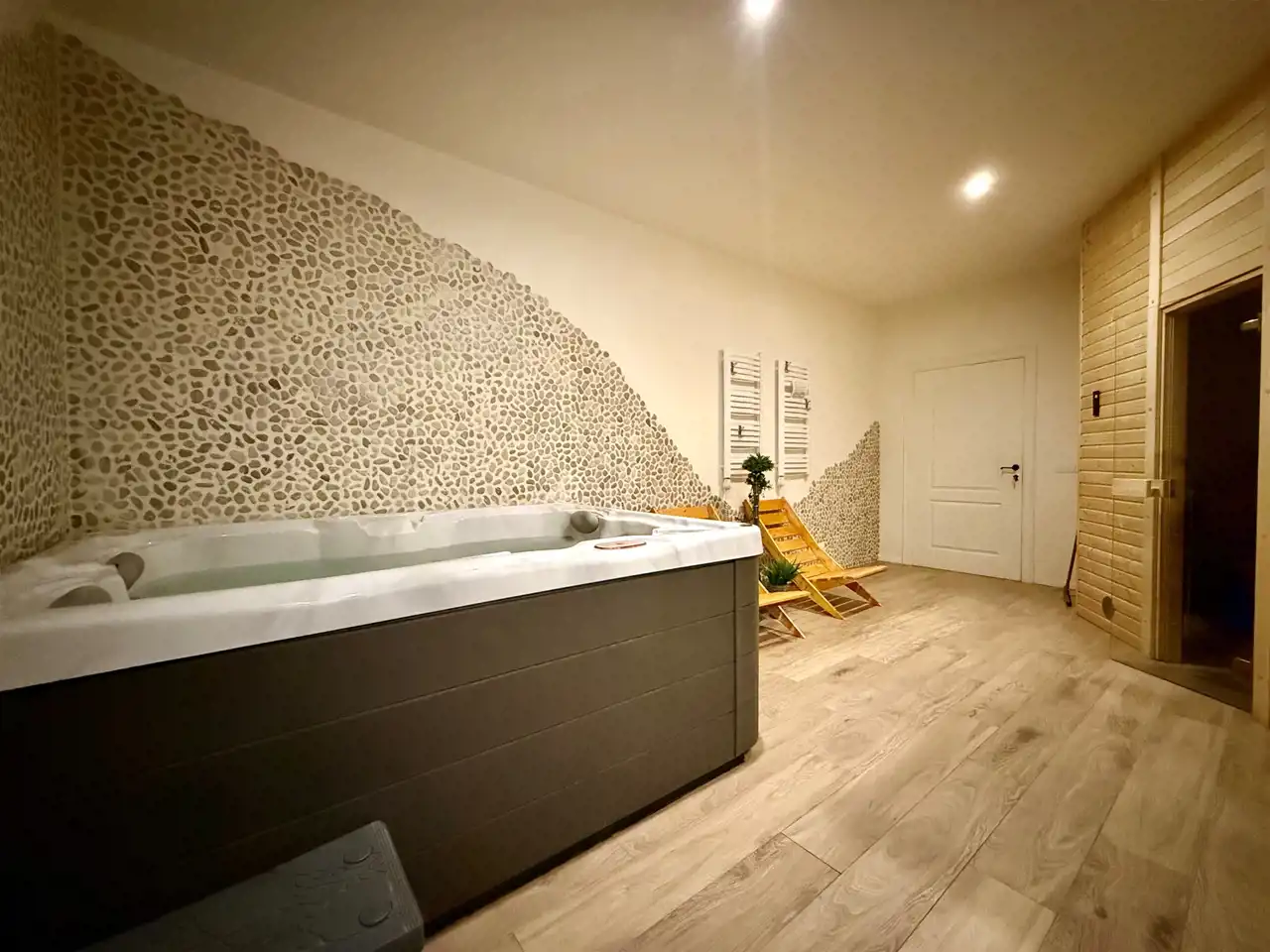 W przyziemiu zaplanowano strefę wypoczynkową z biblioteką, gabinetem masażu, sauną, jacuzzi i natryskami. Wszystkie przestrzenie są urządzone, wyposażone i gotowe do działania. Jacuzzi jest regularnie serwisowane. W zestawie pozostają także pościele, ręczniki oraz pełne umeblowanie.