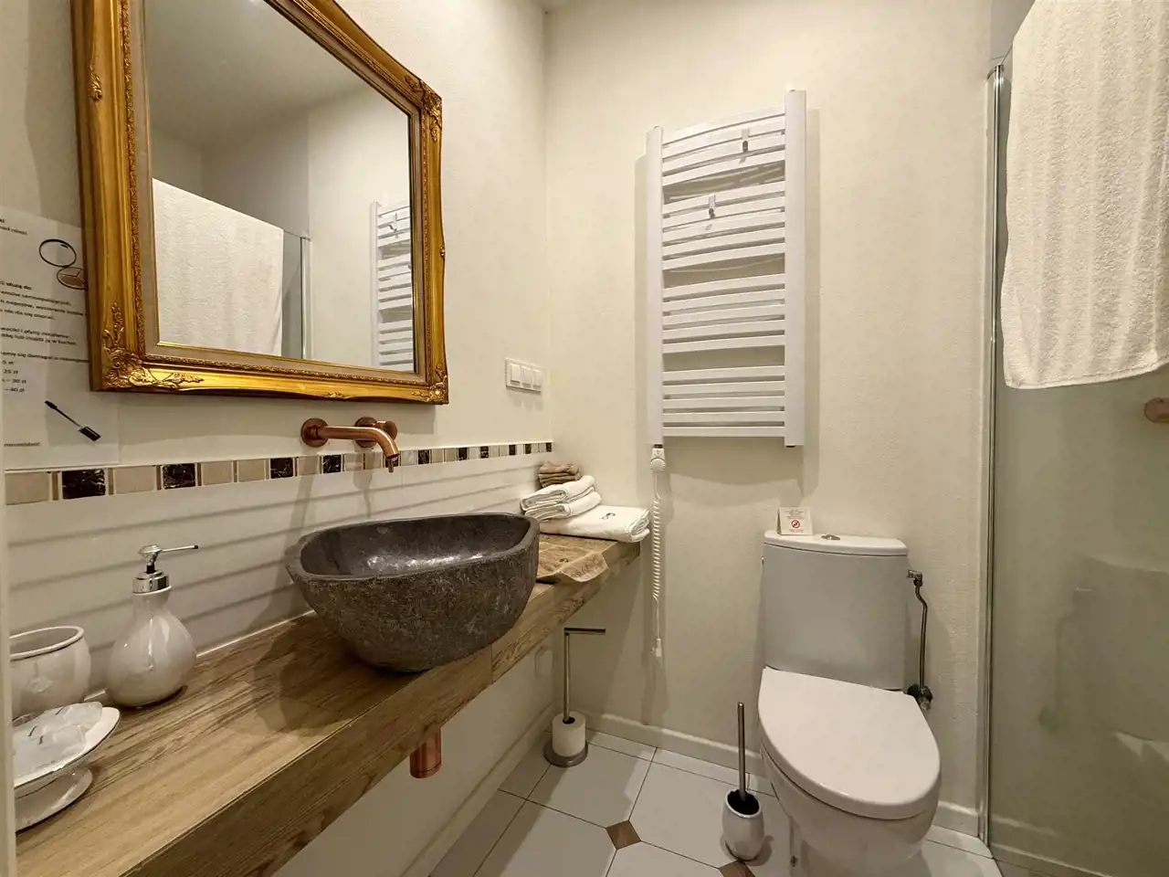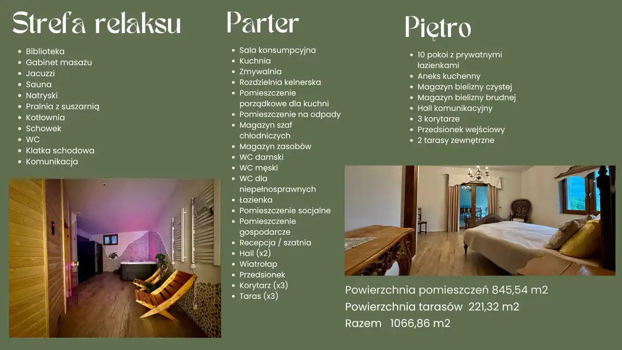 Obiekt posiada 15 łazienek, 9 pomieszczeń gospodarczych oraz pełną infrastrukturę. Do niedawna był z sukcesem wynajmowany – posiada wyrobioną markę, rozpoznawalność i gotową bazę klientów. Całość oferowana jest z kompletnym wyposażeniem – nowy właściciel może rozpocząć działalność od pierwszego dnia.
