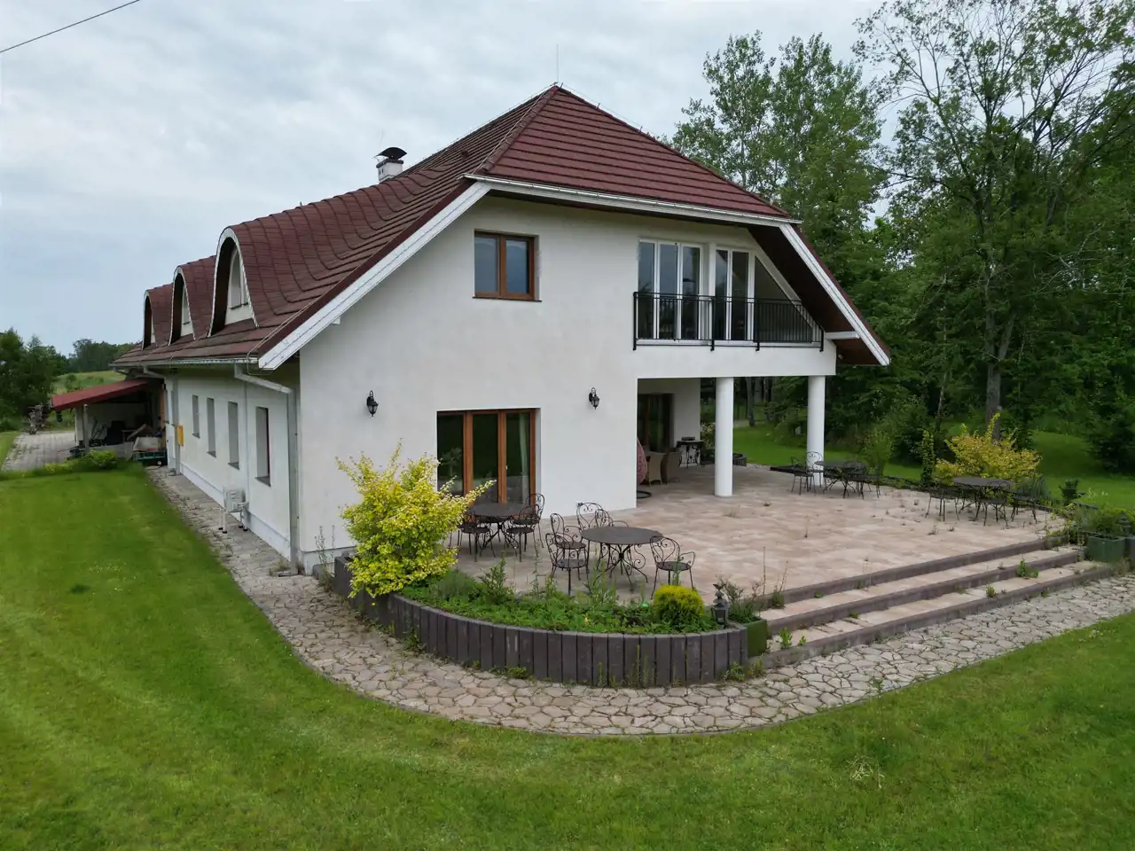 Budynek o powierzchni użytkowej 845 m² (łącznie z tarasami ponad 1066 m²) został wzniesiony w 2020 roku i wykończony w stylu inspirowanym klasyczną architekturą dworkową. Zadbano o każdy szczegół – od jakości materiałów, po harmonię wnętrz. Całość znajduje się na ogrodzonym terenie z dwiema automatycznymi bramami wjazdowymi. Do dyspozycji właściciela pozostaje również prywatny pomost nad jeziorem, a także łódka i kajak.