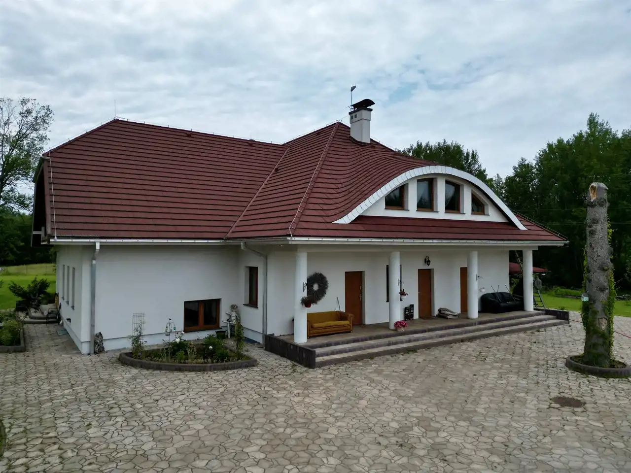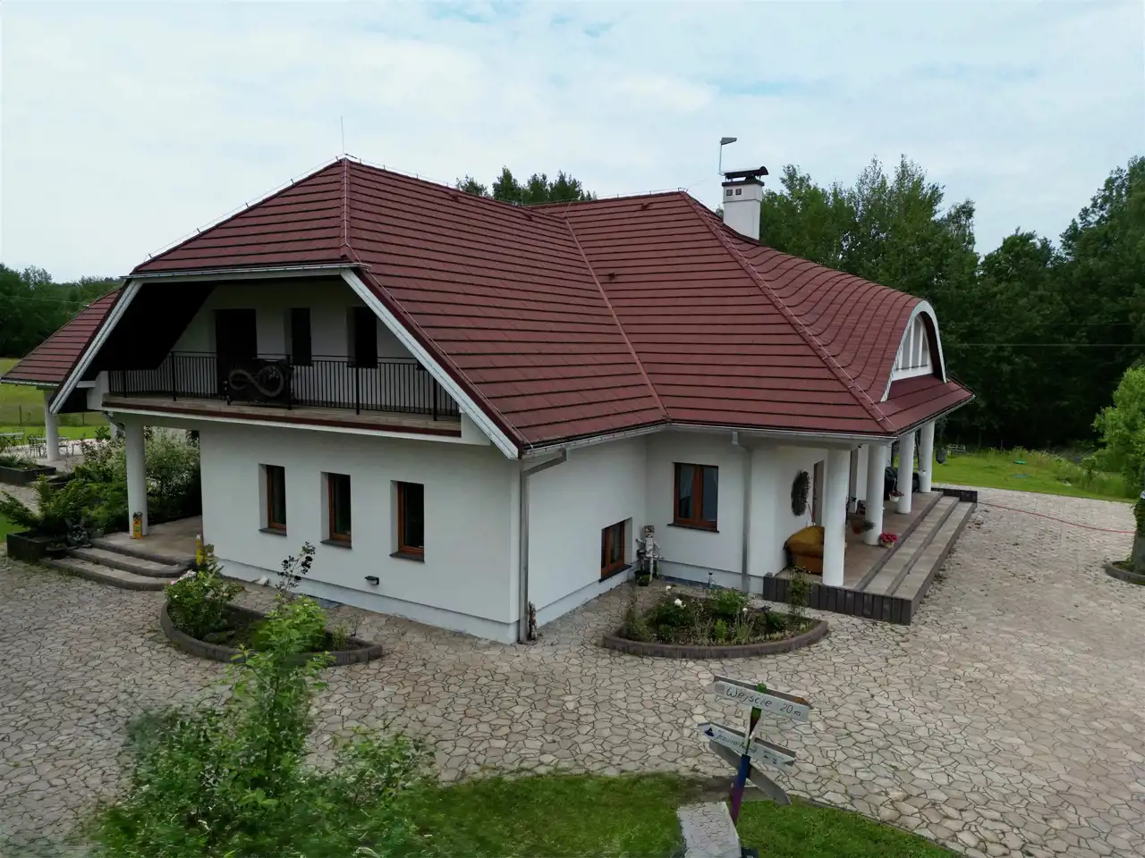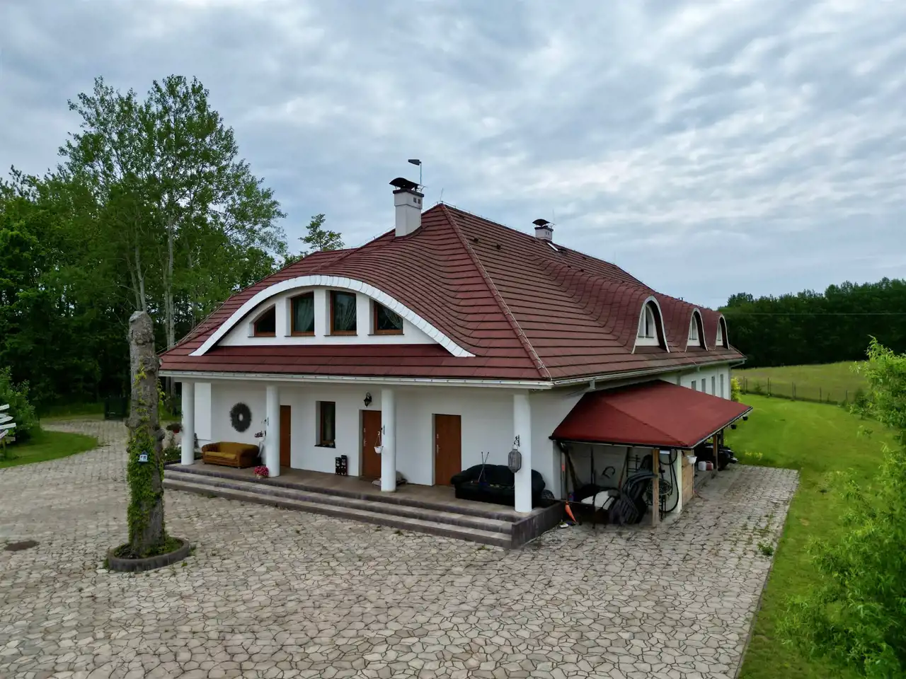 Dzięki zastosowaniu nowoczesnych rozwiązań technologicznych, obiekt wyróżnia się wyjątkowo niskimi kosztami utrzymania. Instalacja fotowoltaiczna o mocy 27,7 kW (zlokalizowana dyskretnie na sąsiednim polu), gruntowa pompa ciepła 35 kW z dziesięcioma odwiertami, ogrzewanie podłogowe (ok. 5 km rozprowadzeń), zbiornik na deszczówkę o pojemności 20 000 litrów oraz napełniony w 70% niezależny zbiornik gazowy o pojemności 4860 litrów gwarantują pełną energooszczędność. Dach wykonano w technologii metrotile – modułowej, z mineralną posypką, łączącej estetykę z trwałością.