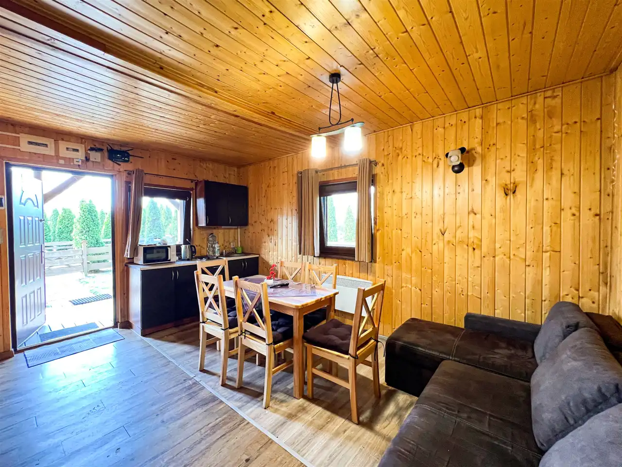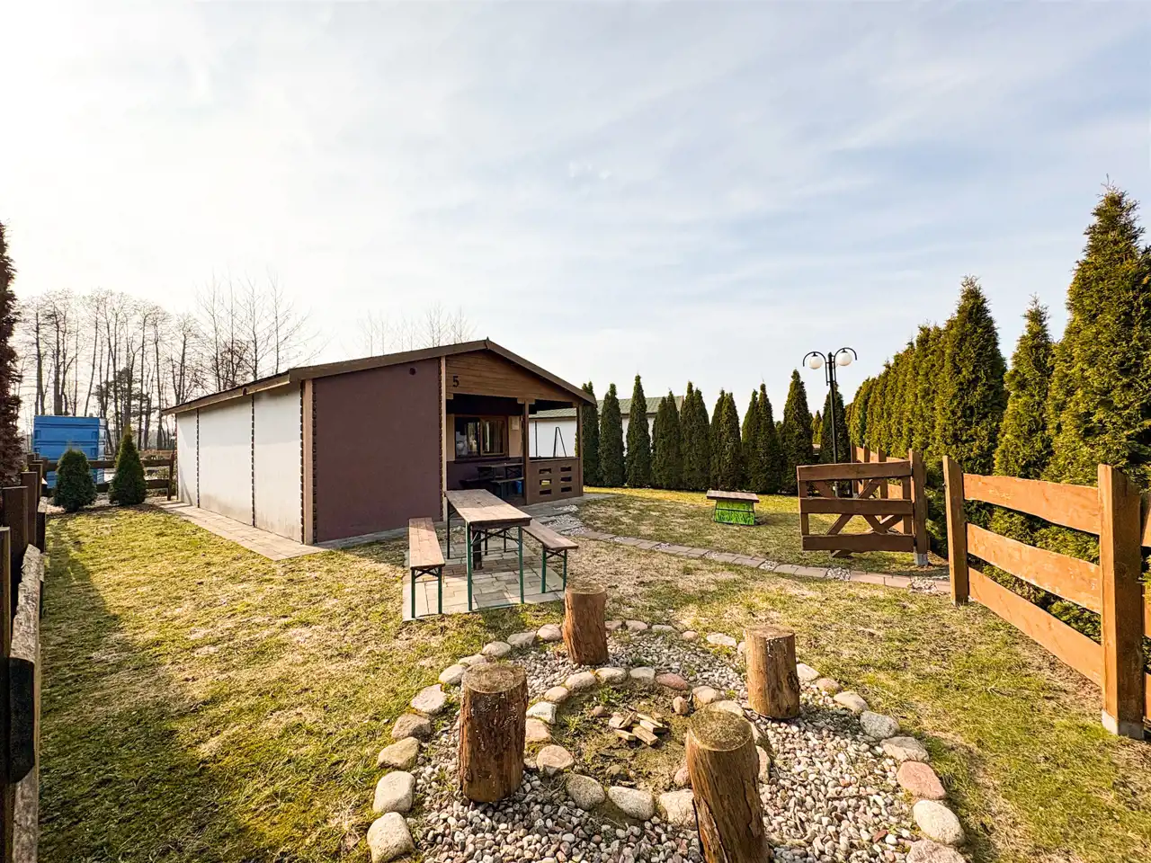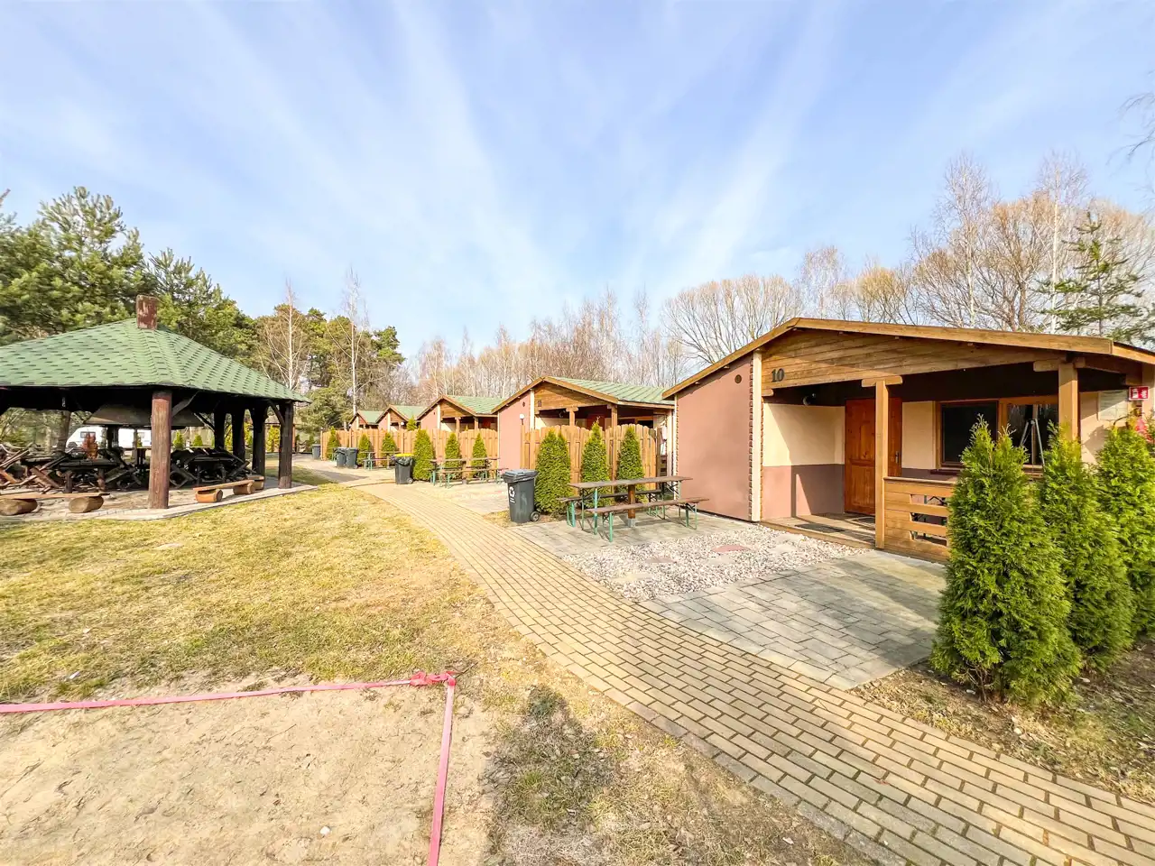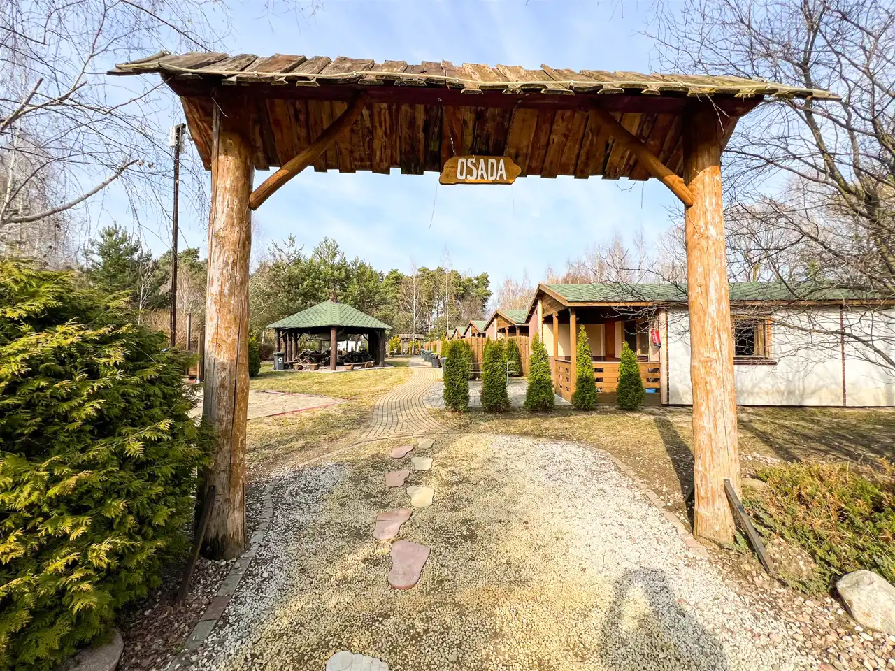 Na terenie ośrodka znajduje się Pensjonat stanowiący główną recepcję, wyposażony w zaplecze gastronomiczne oraz łącznie 14 domków rekreacyjnych ( 11 domków parterowych, 2 domki drewniane, całoroczne oraz jeden domek drewniany, całoroczny Myśliwski). Każdy domem posiada własna strefę wypoczynkową z miejscem na grilla, dodatkowo 2 domki drewniane, piętrowe wyposażone są w prywatne baseny. Domek Myśliwski wyposażony jest w kominek, basen, saunę, banie ruską oraz altankę z miejscem na ognisko i grilla.