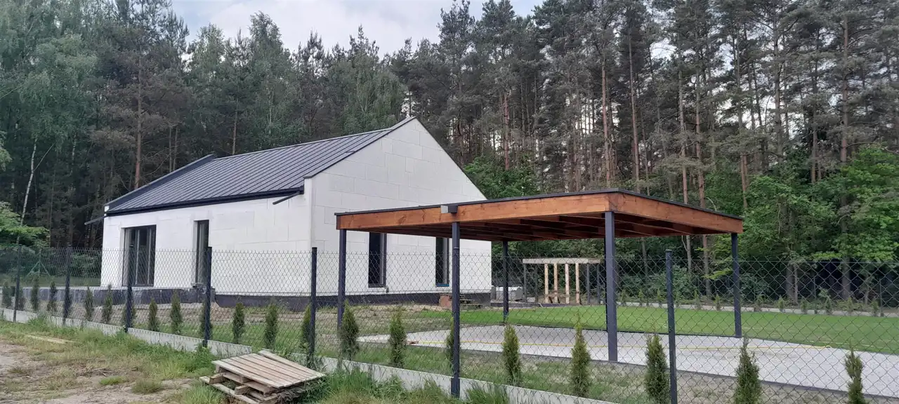 Działka jest bardzo ładnie zagospodarowana: posiana została trawa, położona kostka brukowa a także wybudowane bardzo eleganckie, duże zadaszenie na dwa samochody, które może również służyć, jako miejsce do spędzania wolnego czasu i grillowania w dni deszczowe. Działka jest ogrodzona z ładną, przesuwną bramą wjazdową.