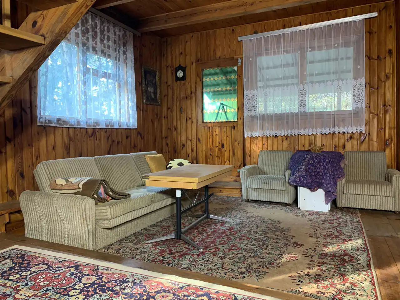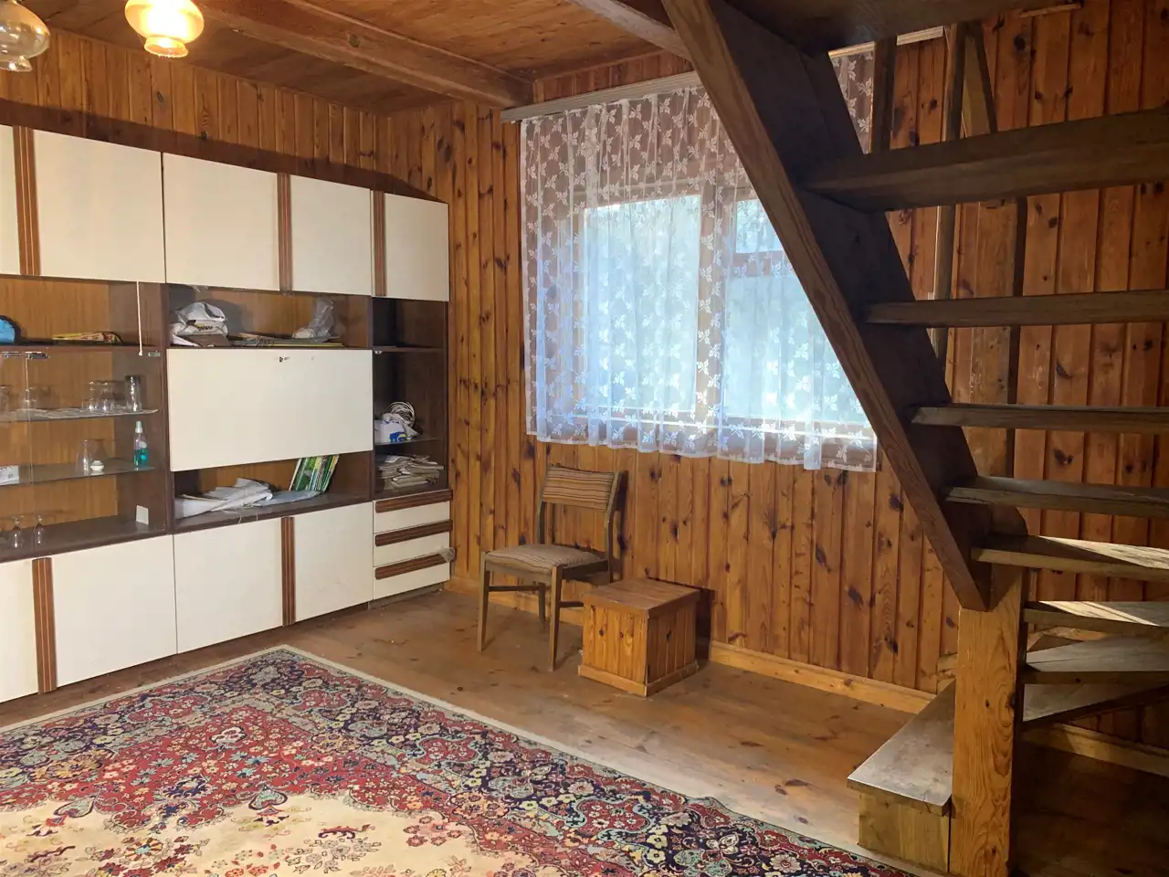 Duży salon z kominkiem , oddzielna niewielka kuchnia , łazienka.