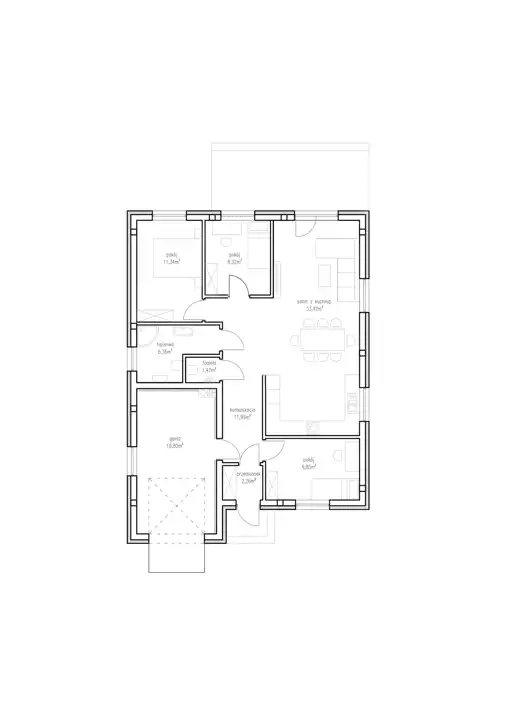 Prezentowany budynek składa się z: przestronnego salonu z aneksem kuchennym (33,42m2) z wyjściem na taras, 3 dodatkowych, ustawnych pokoi (11,34; 9,85; 8,32m2), sporej łazienki z oknem (6,36m2), toalety (1,47 m2) wiatrołapu i holu z funkcjonalnymi miejscami na szafę oraz sporego garażu (19,80m2) z przejściem bezpośrednio do domu. Nad lokalem poddasze, stanowiące doskonałe miejsce do przechowywania.
