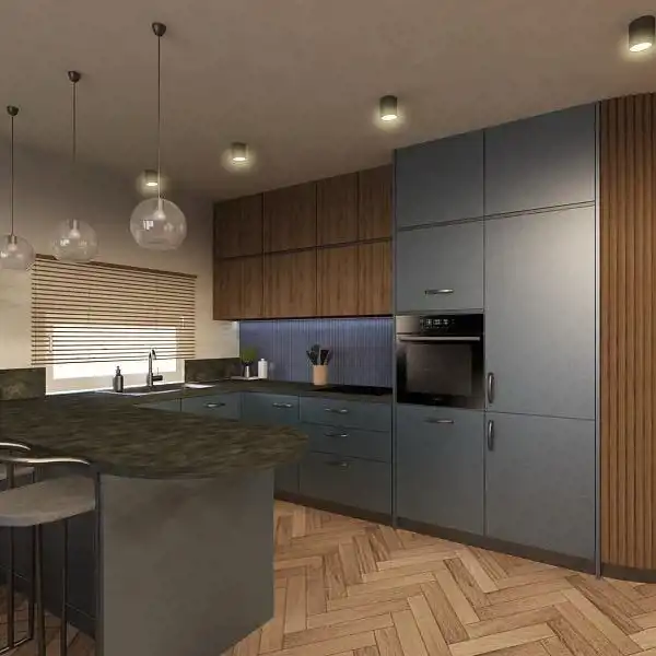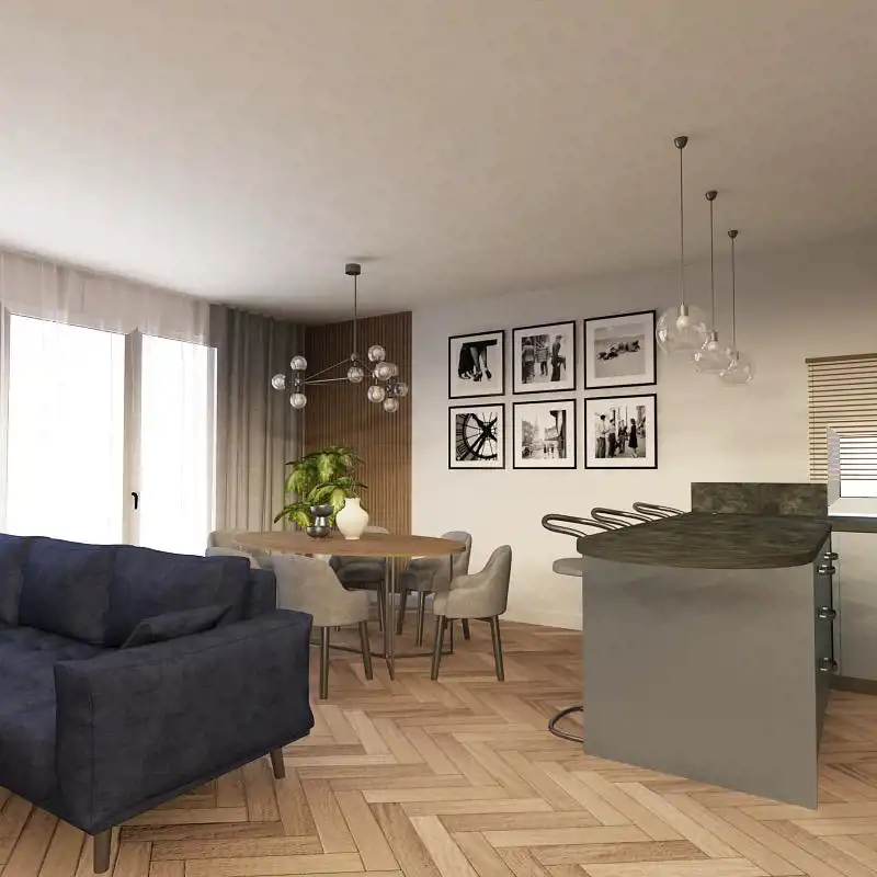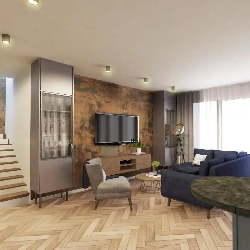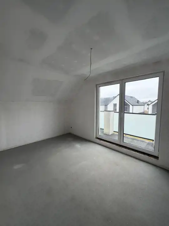 - przestronny salon z aneksem kuchennym 32,56m2m2 z dużym przesuwnym oknem prowadzącym do wyjścia na taras 12m2 i ogród 120m2