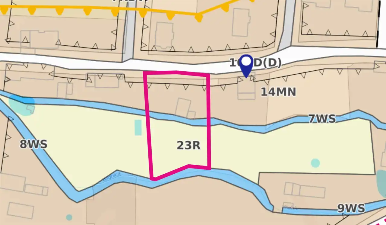 Nieruchomość w części (822 m2) oznaczona jest symbolem 14MN - strefa swobodnej zabudowy mieszkaniowej jednorodzinnej oraz w pozostałej części o pow. 979 m2 symbolem 23R - tereny rolnicze.