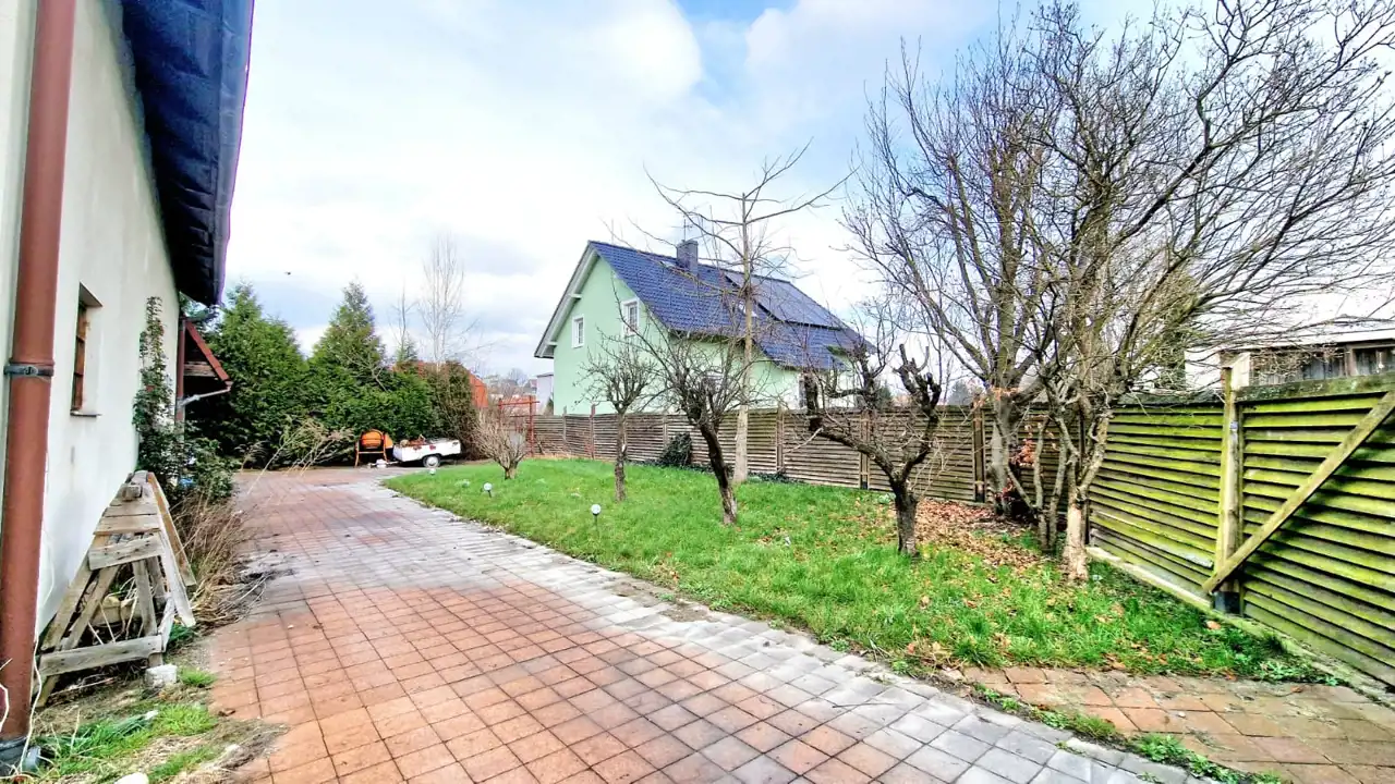 Teren zielony z drzewkami owocowymi, ogrodzony! Częściowo kostka brukowa, druga część z trawą, drzewkami.