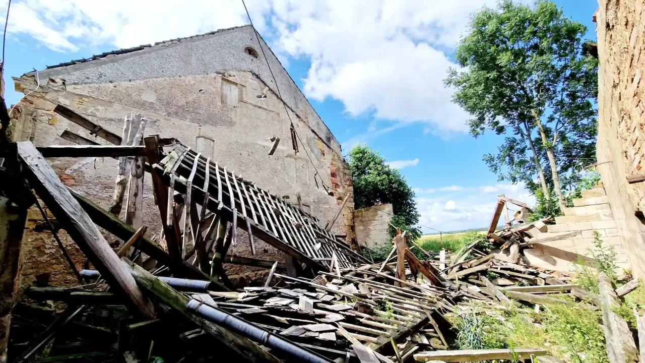 Budynek mieszkalny zawalony, pozostały ruiny oraz podpiwniczenie.