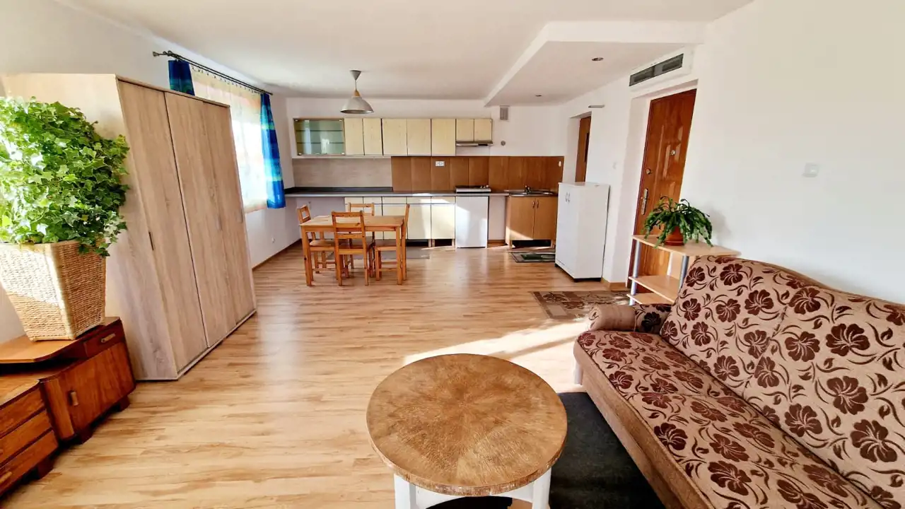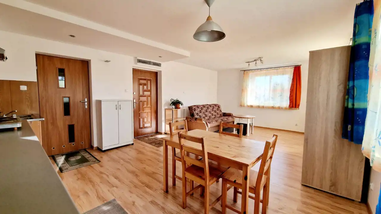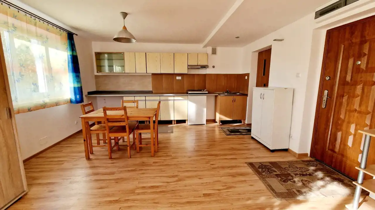 - jasny, duży pokój z możliwości zrobienia osobno sypialni i aneksu kuchennego z salonem