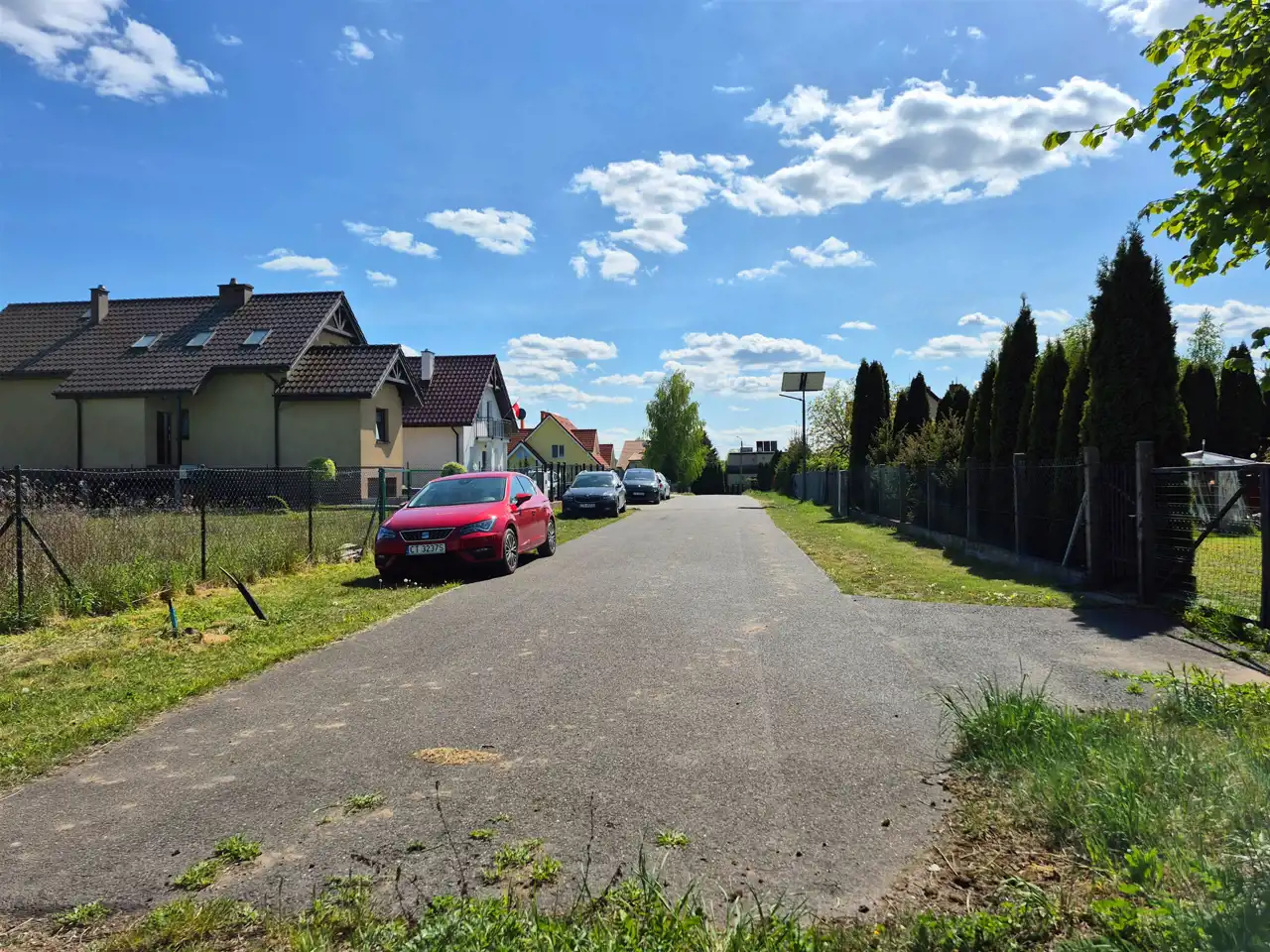 Działka w kształcie prostokąta z bezpośrednim dostępem do drogi publicznej o nawierzchni asfaltowej, częściowo ogrodzona. Do działki doprowadzono przyłącze energetyczne (skrzynka), tuż przy działce znajduje się przyłącze wodociągowe i kanalizacyjne oraz sieć gazowa. Warunki zabudowy są trakcie realizacji, z uwagi na jej możliwości wystąpiono o kilka wariantów zabudowy.