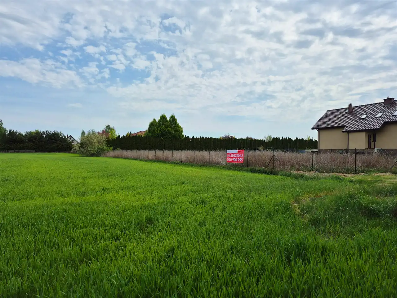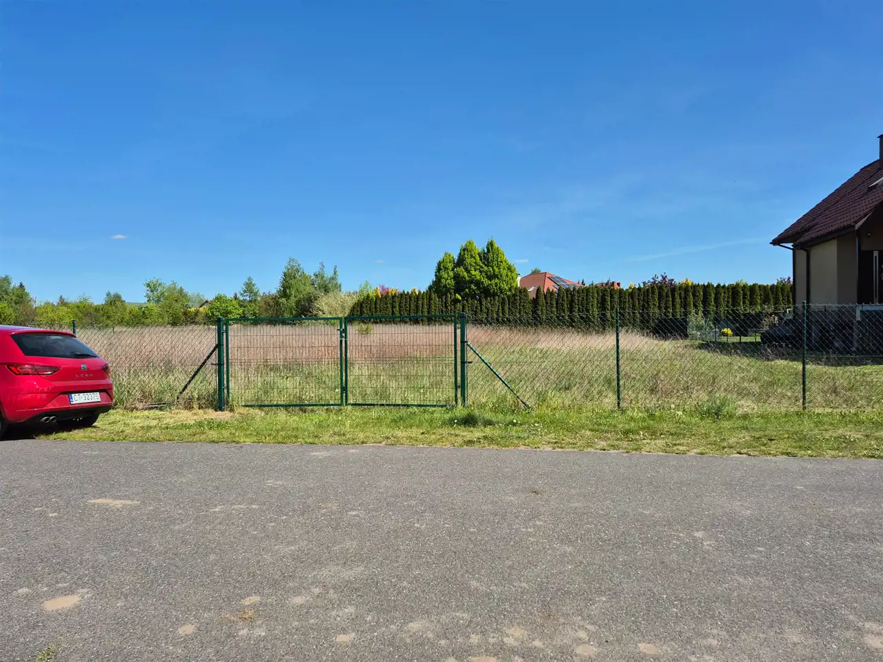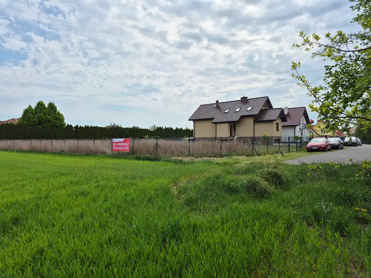 Działka w kształcie prostokąta z bezpośrednim dostępem do drogi publicznej o nawierzchni asfaltowej, częściowo ogrodzona. Do działki doprowadzono przyłącze energetyczne (skrzynka), tuż przy działce znajduje się przyłącze wodociągowe i kanalizacyjne oraz sieć gazowa. Warunki zabudowy są trakcie realizacji, z uwagi na jej możliwości wystąpiono o kilka wariantów zabudowy.