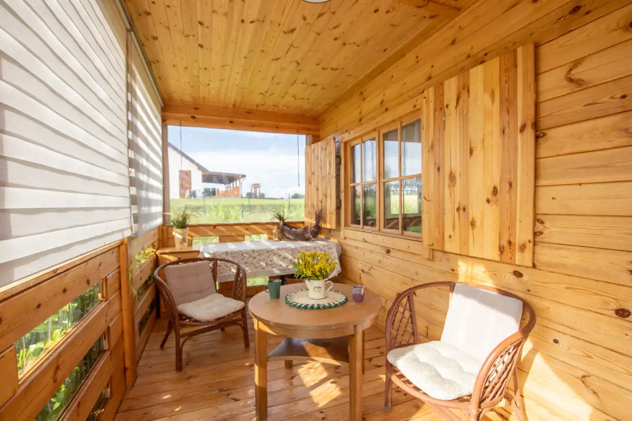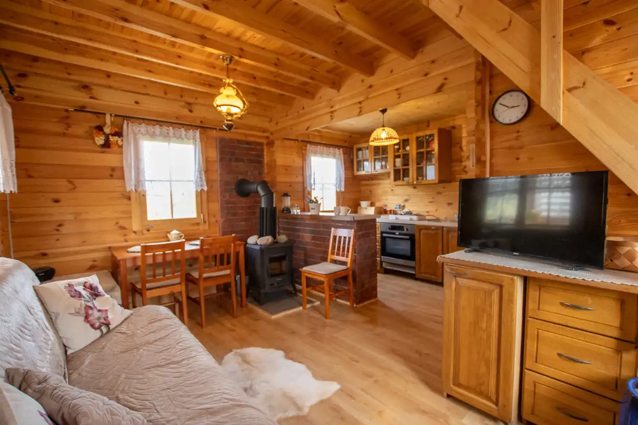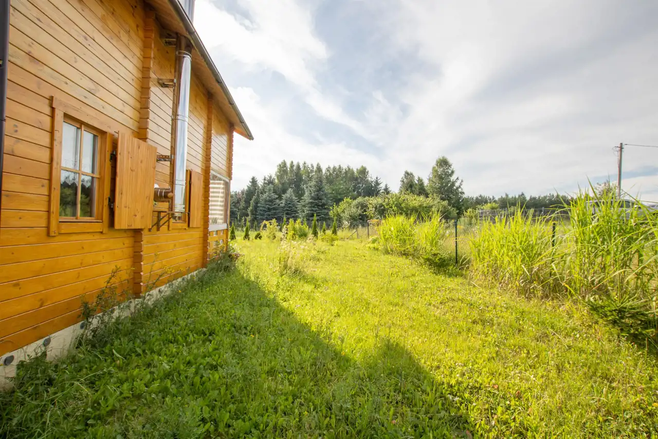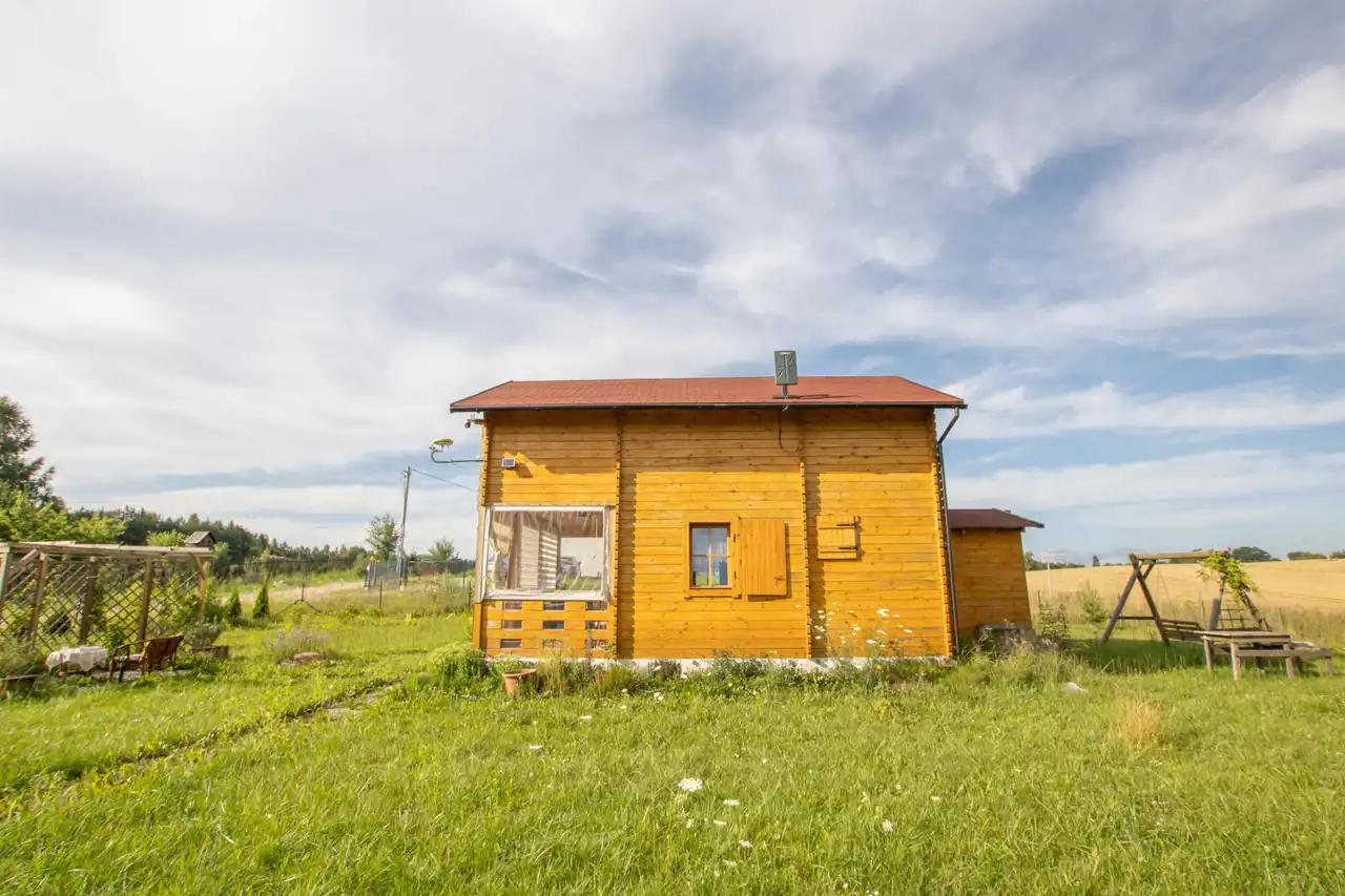 Dom drewniany z pięknym tarasem o powierzchni użytkowej ponad 50 m² wybudowany przez firmę zajmującą się od lat podobnymi projektami, jest funkcjonalny i przytulny. Wyposażony w ogrzewanie typu koza oraz grzejnik elektryczny by w jesienne wieczory zapewnić sobie komfort termiczny. Niedużym nakładem można ocieplić, by stworzyć miejsce do całorocznego rozkoszowania się tym spokojnym miejscem.
