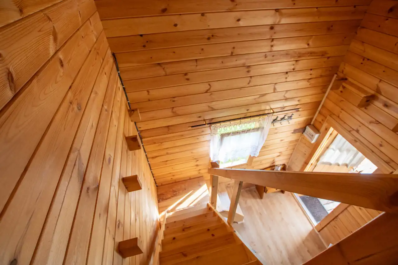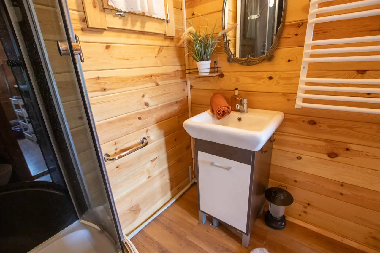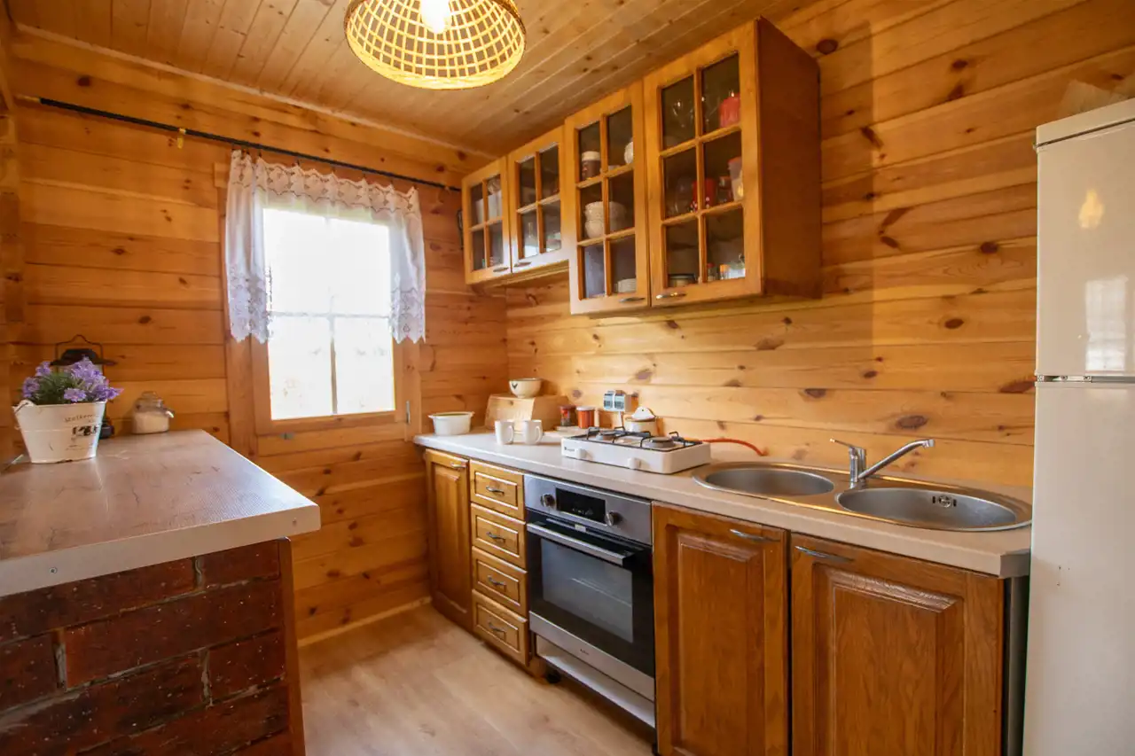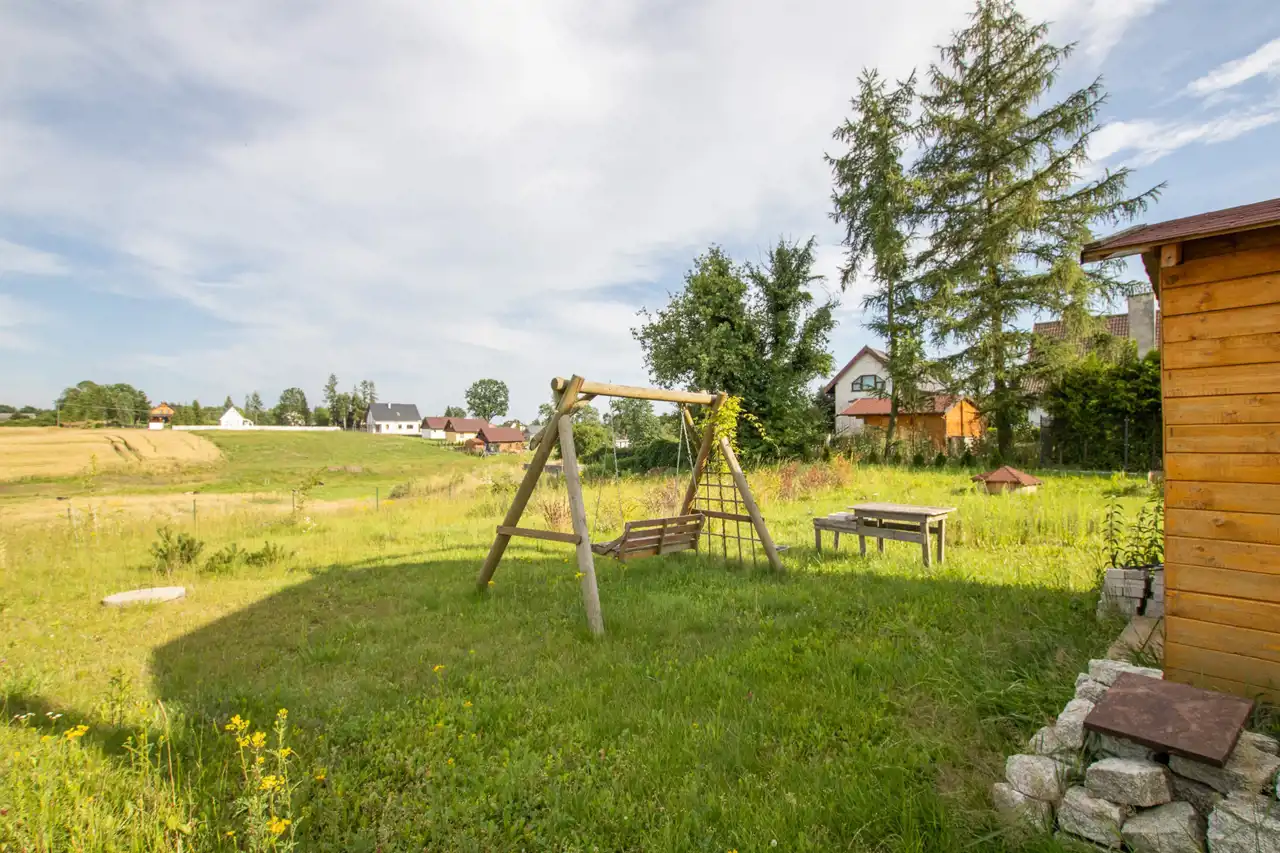 Dom drewniany z pięknym tarasem o powierzchni użytkowej ponad 50 m² wybudowany przez firmę zajmującą się od lat podobnymi projektami, jest funkcjonalny i przytulny. Wyposażony w ogrzewanie typu koza oraz grzejnik elektryczny by w jesienne wieczory zapewnić sobie komfort termiczny. Niedużym nakładem można ocieplić, by stworzyć miejsce do całorocznego rozkoszowania się tym spokojnym miejscem.