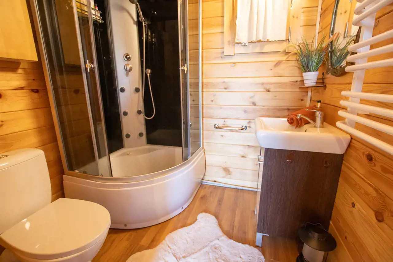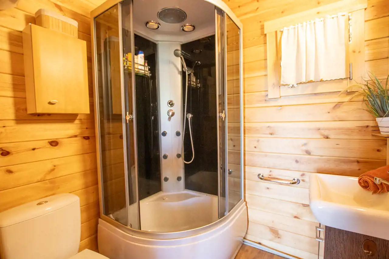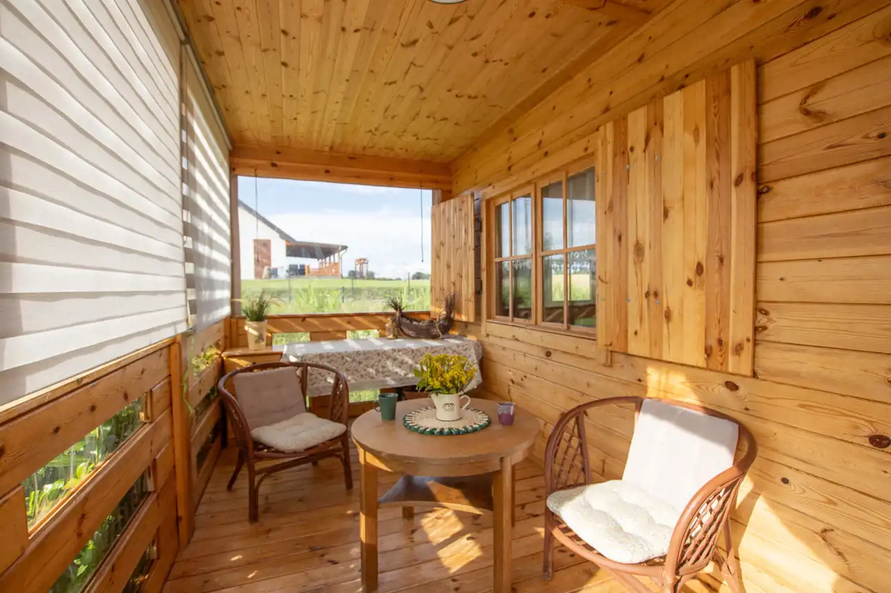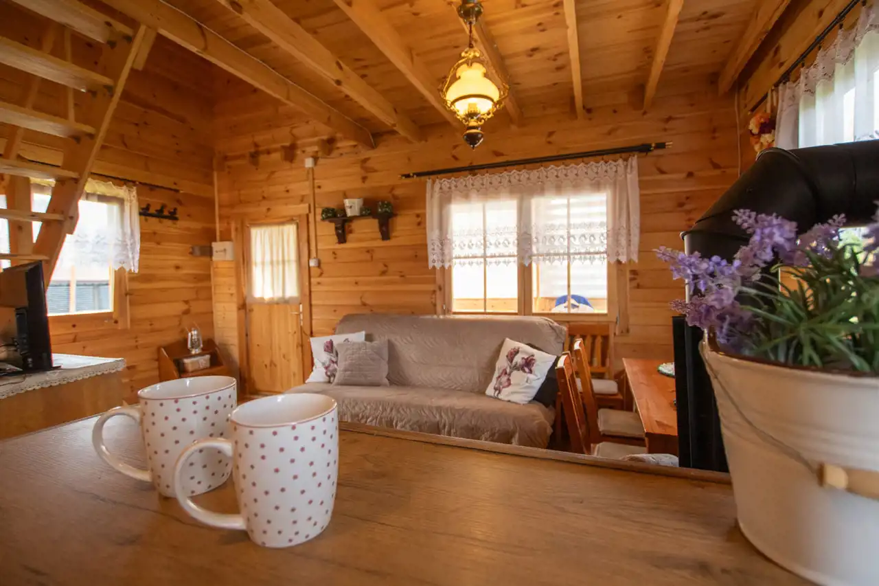 Dom drewniany z pięknym tarasem o powierzchni użytkowej ponad 50 m² wybudowany przez firmę zajmującą się od lat podobnymi projektami, jest funkcjonalny i przytulny. Wyposażony w ogrzewanie typu koza oraz grzejnik elektryczny by w jesienne wieczory zapewnić sobie komfort termiczny. Niedużym nakładem można ocieplić, by stworzyć miejsce do całorocznego rozkoszowania się tym spokojnym miejscem.